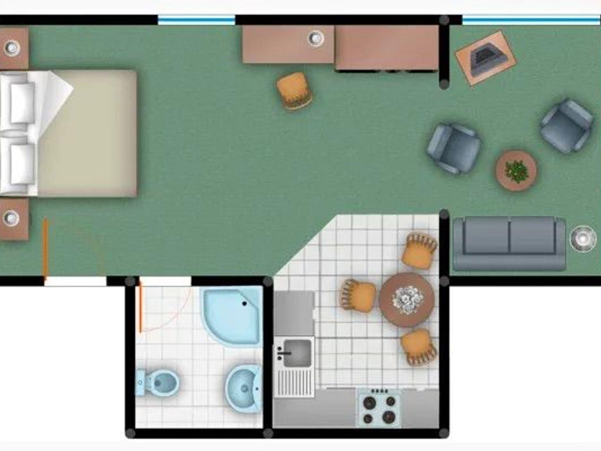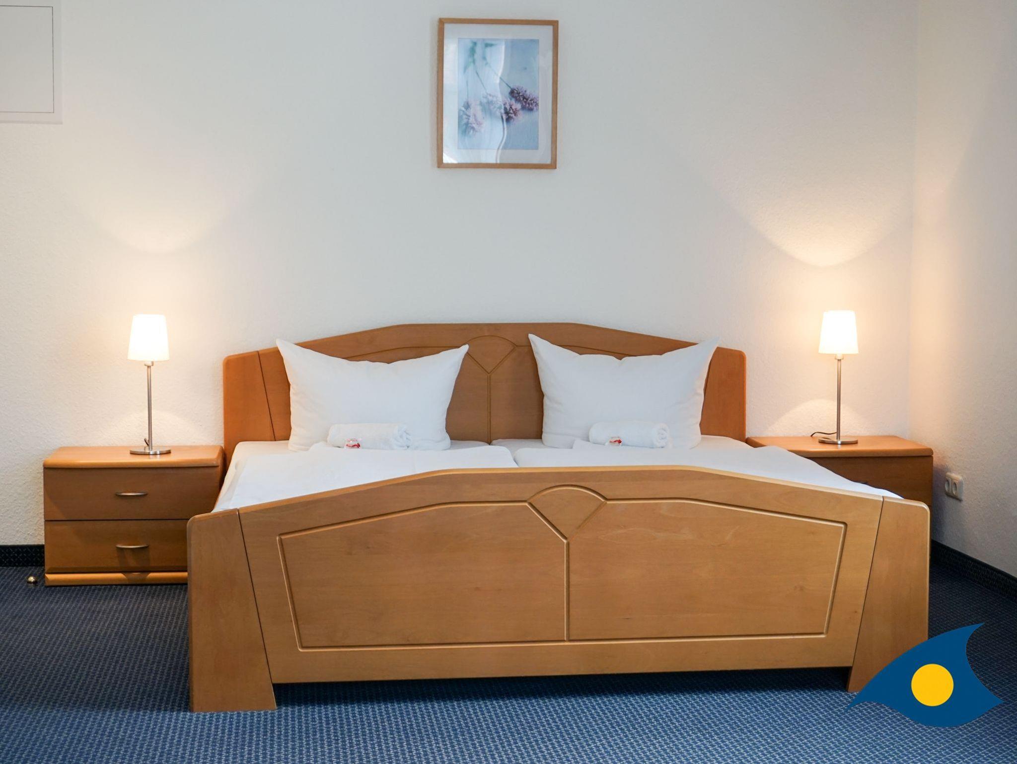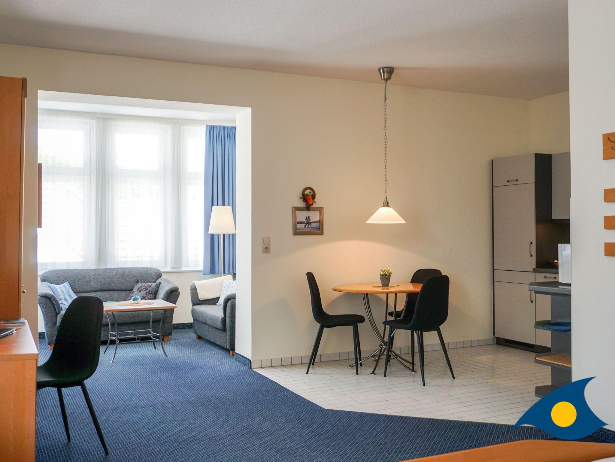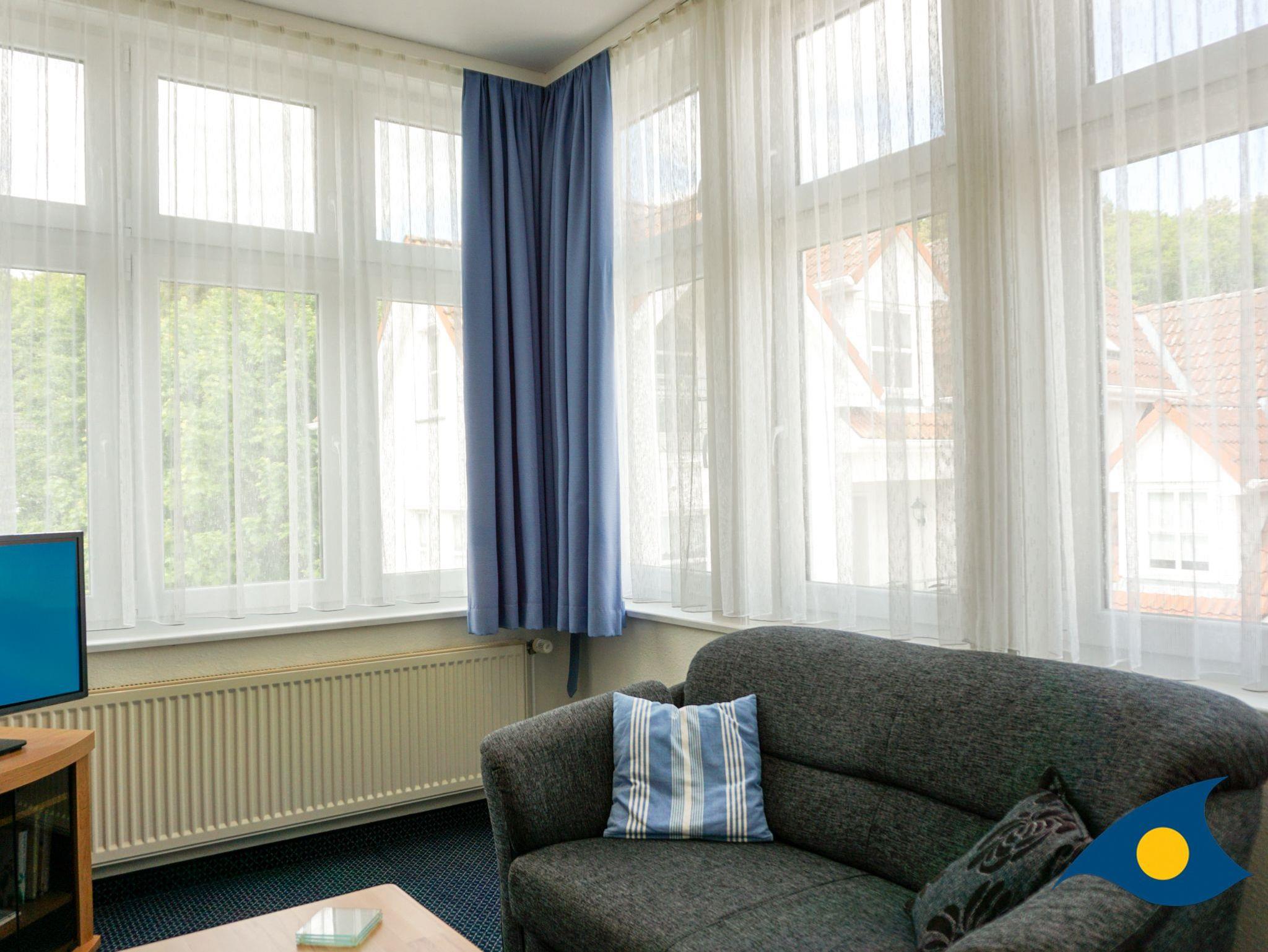 Der kombinierte Wohn- und Schlafbereich besticht durch seinen großzügigen Schnitt. Die gemütliche Couch-Ecke direkt am Fenster, läd zu entspannten Abenden nach langen Strandtagen ein. Für Unterhaltung sorgt ein moderner Smart-TV. Das komfortable Doppelbett (180x200) garantiert ruhige und erholsame Nächte.