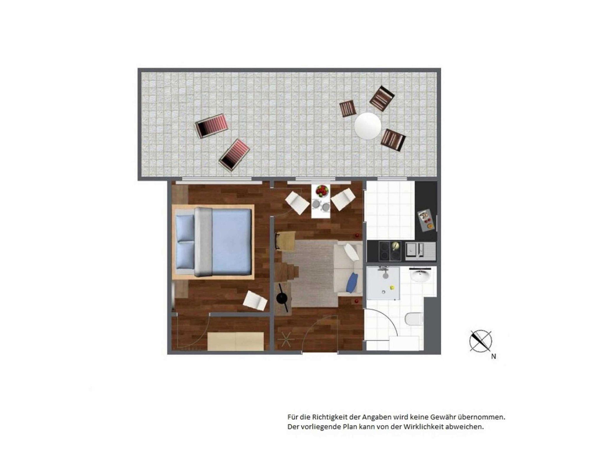 Die knapp 40 qm große Zweizimmerwohnung verfügt über ein Wohnzimmer mit Essplatz, ein separates Schlafzimmer mit begehbarem Kleiderschrank, eine voll ausgestattete Küche, ein Badezimmer mit Dusche, eine große Terrasse und einen Abstellraum.