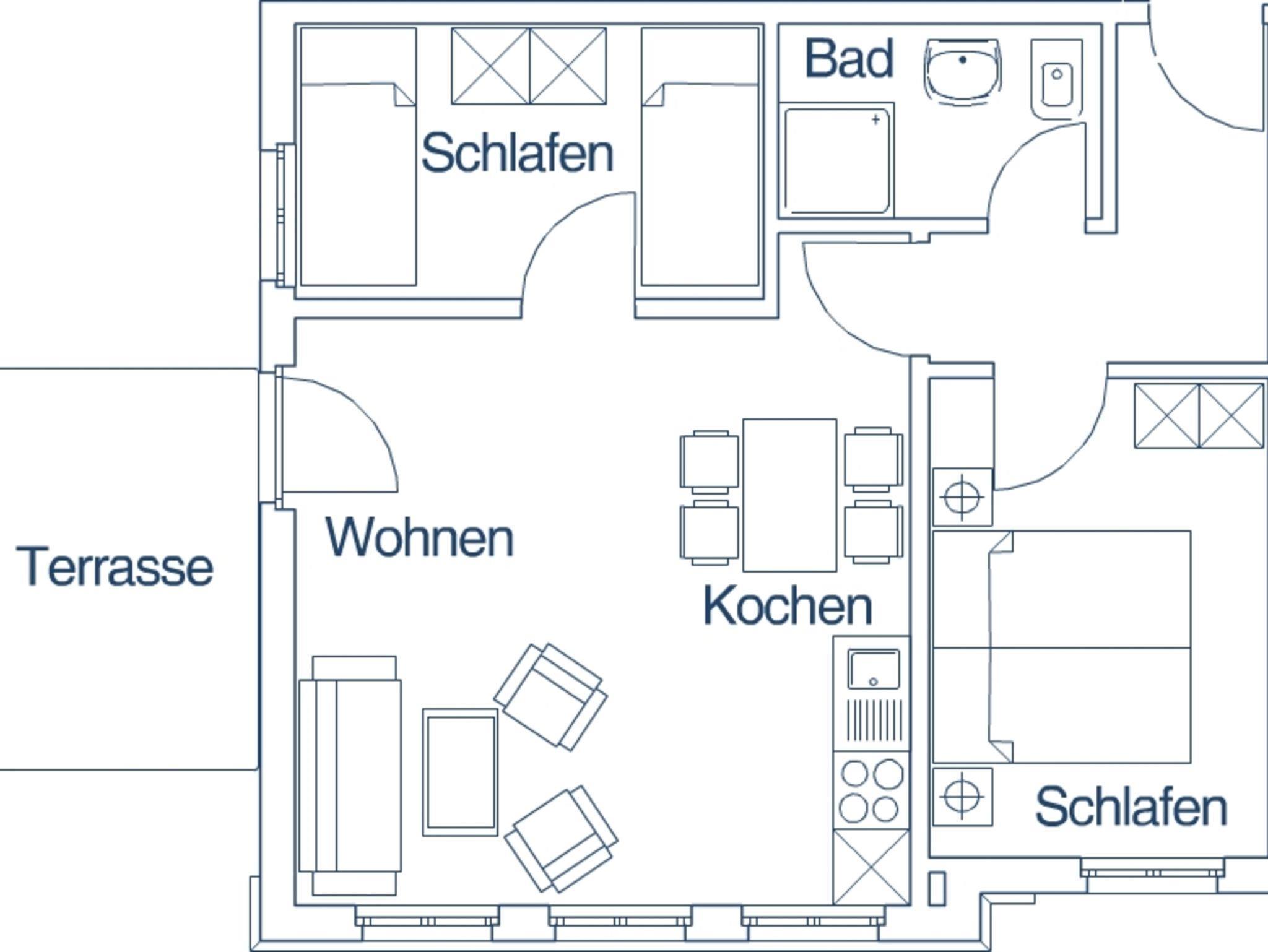 Diese stilvoll eingerichtete Wohnung mit 50² liegt im Erdgeschoss. Es gibt einen Wohnraum mit kompletter, gut ausgestatteter Küchenzeile, ein separates Schlafzimmer mit 1,80 m breitem Doppelbett, ein weiteres Schlafzimmer mit 2 Einzelbetten, ein Bad mit ebenerdiger Dusche sowie eine möblierte Terrasse. Glatte Fußböden, Ledercouch und abwischbare Bezüge kommen Allergikern entgegen. Die Nichtraucherwohnung wirkt durch ihre bodentiefen Fenster hell und freundlich.