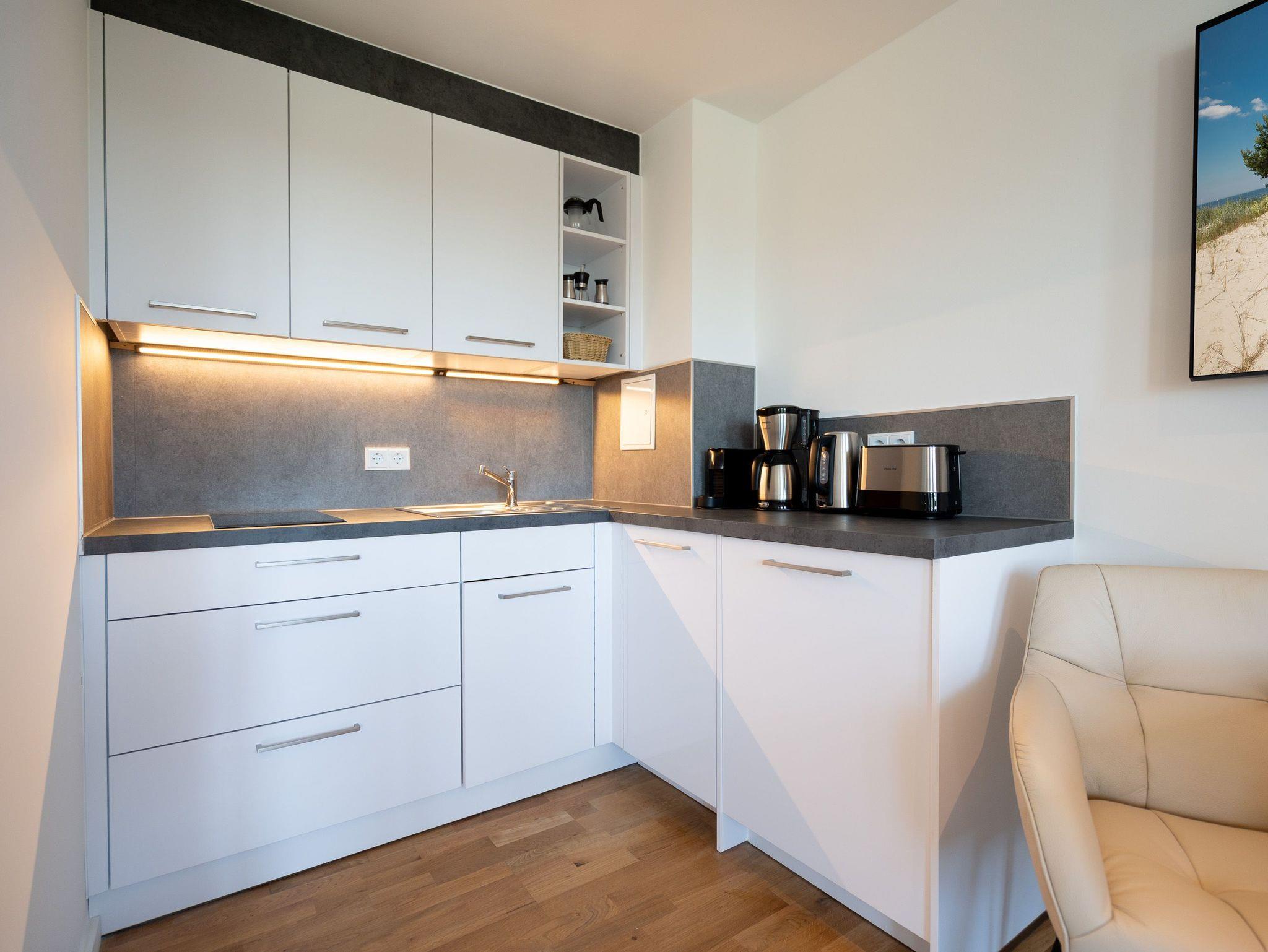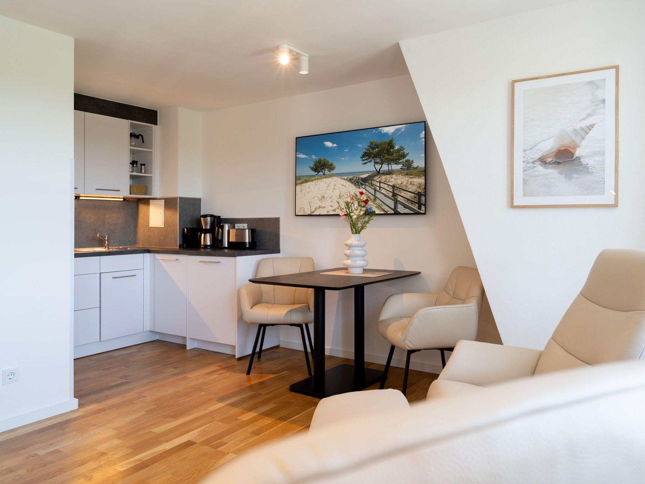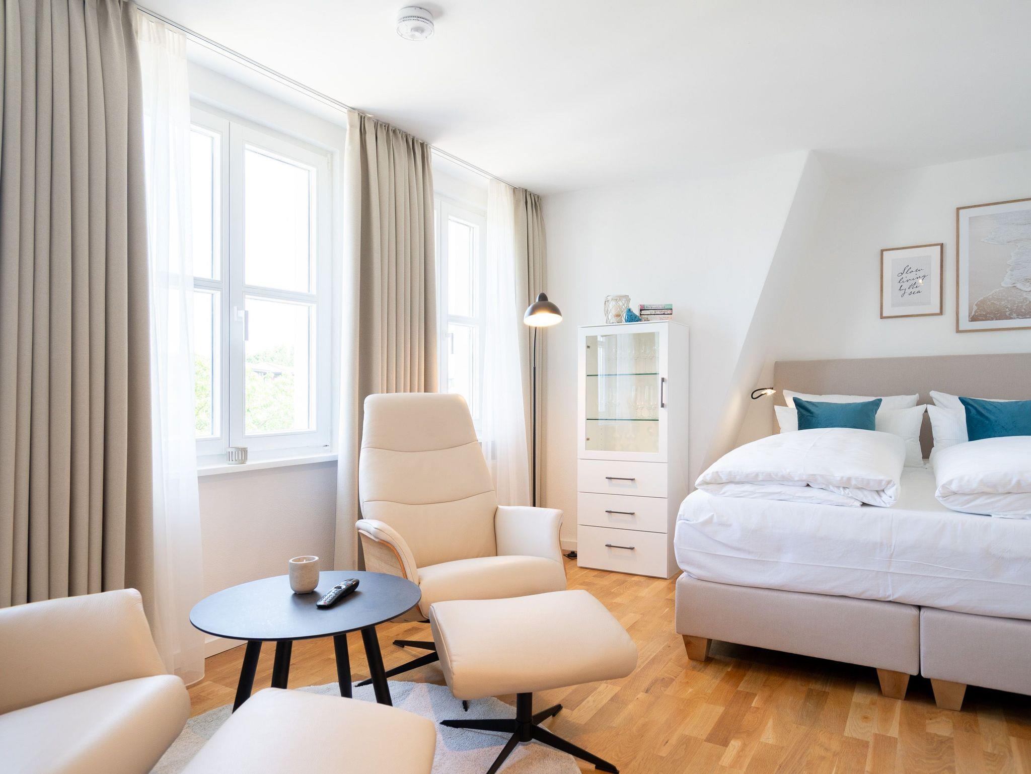 Charmantes 1-Raum-Appartement Nr. 8 im Dachgeschoss ? kompakt, komfortabel, komplett. Das 1-Raum-Appartement im Dachgeschoss der Villa Elisabeth bietet auf 27?m² eine stilvolle, gut durchdachte Unterkunft für zwei Personen ? perfekt für alle, die Komfort auf kleinem Raum schätzen. Der offene Wohnbereich ist hell und einladend gestaltet. Die moderne Küchenzeile ist ausgestattet mit einem 2-Platten-Cerankochfeld, Spülmaschine, Kühlschrank mit Gefrierfach und Nespresso-Kapselmaschine ? ideal für Frühstück, Snack oder Spaghetti in Urlaubslaune. Am Esstisch für zwei lassen sich Mahlzeiten oder Reisepläne entspannt genießen. Zwei bequeme Relaxsessel mit Fußhocker und ein 55-Zoll-Flat-TV sorgen für entspannte Stunden ? ganz gleich, ob Sie Serien schauen oder einfach mal abschalten möchten. Das komfortable Boxspringbett (1,60?m x 2,00?m) verspricht erholsame Nächte, der Kleiderschrank bietet Stauraum für Ihr Gepäck. Das innenliegende Bad ist kompakt, aber funktional ? mit Dusche (85?cm x 70?cm), Waschtisch und WC ausgestattet. Ein fester PKW-Stellplatz (Nr.?8) steht Ihnen auf dem Hof zur Verfügung. Selbstverständlich ist kostenfreies WLAN ebenfalls vorhanden. Ein durchdachter Rückzugsort unterm Dach ? klein, fein und mit allem, was man braucht.