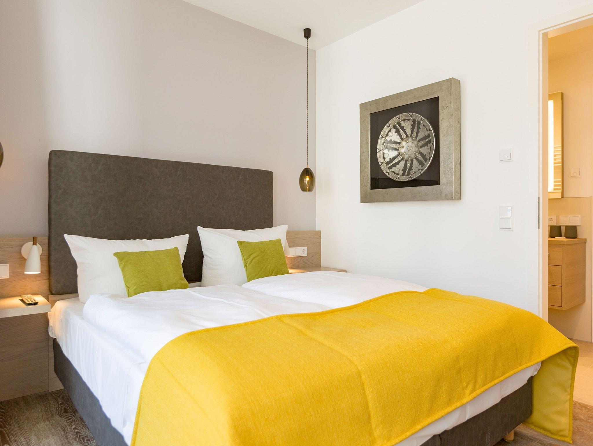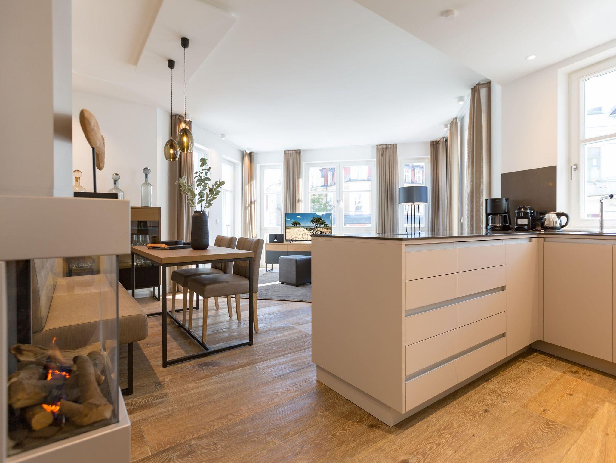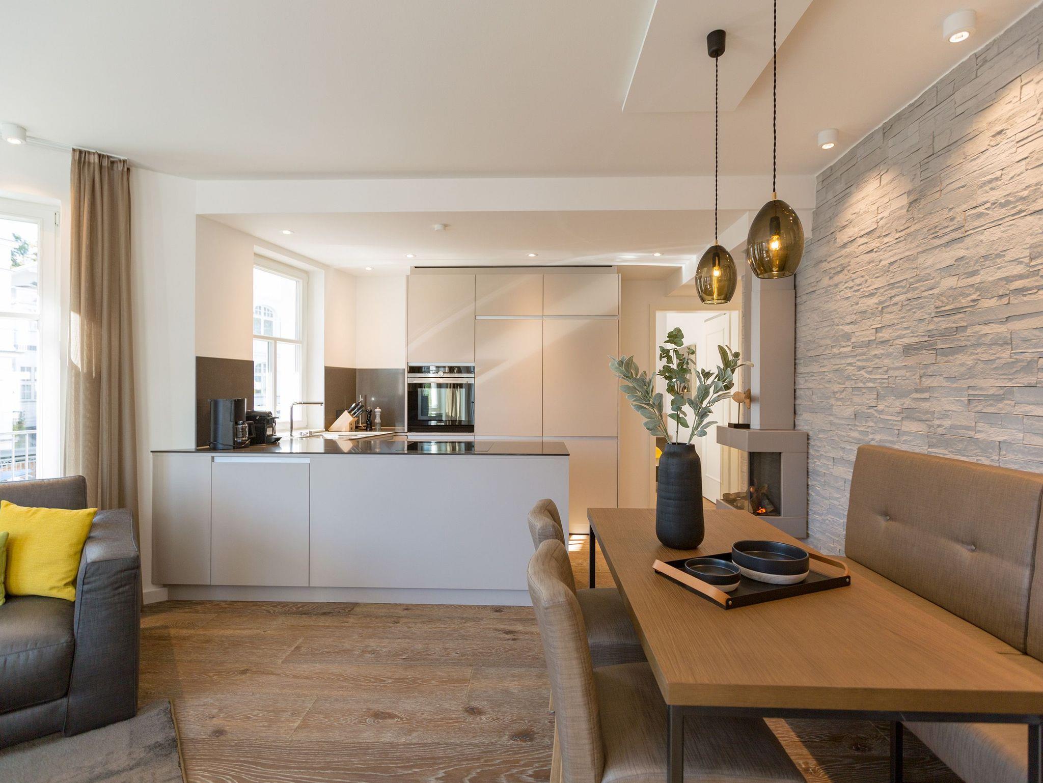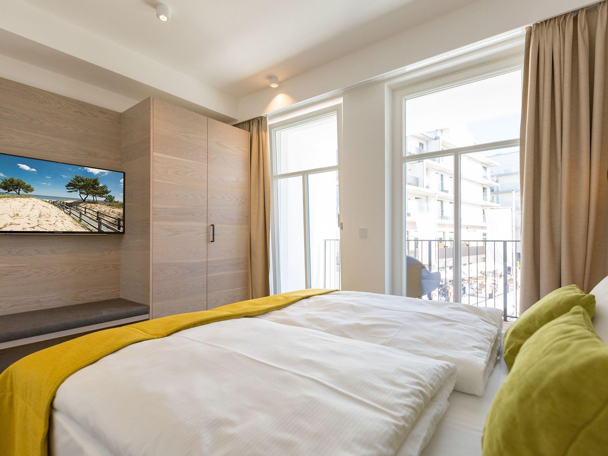 Zwei Balkone, zwei Schlafzimmer, zwei Bäder und ein großzügiges Wohnzimmer ? Schon beim Eintreten sagt die Seele: Hier will ich verweilen und zur Ruhe kommen. In diesem modernen und wunderschön eingerichteten Drei-Zimmer-Appartement in der 1. Etage empfängt Sie auf 69 Quadratmetern ein echtes Wohlfühlreich. Mitten im Herzen des quirligen Seebades mit Blick auf die alten Bädervillen der berühmten Bansiner Bergstraße und die Einkaufsstraße können Sie hier mit bis zu vier Personen, einem Kleinkind (bis drei Jahre im Kinderreisebett) und Ihrem Hund urlauben, entspannen und die Ostsee genießen. Die liegt nämlich direkt vor der Haustür. Treten Sie hinaus auf einen der beiden Balkone (8 und 9 Quadratmeter groß) und lauschen Sie dem Rauschen der Wellen, während Ihnen die Morgensonne oder die Nachmittagssonne wärmend ins Gesicht scheint. Vom Wohnzimmer aus haben Sie zu beiden Balkonen Zugang. Bodentiefe Fenster verleihen den Räumen eine lichte Leichtigkeit. Lassen Sie sich auf das gemütliche Sofa fallen oder plauschen Sie bei einem leckeren Essen am schönen Esstisch mit den bequemen Stühlen und der Sitzbank. Ein gläserner Gas-Kamin sorgt für wohlige Wärme und eine romantische Stimmung an ungemütlichen Tagen und Abenden. Gibt es etwas Entspannenderes als dem Spiel der Flammen zuzuschauen und sich dabei so richtig schön einzukuscheln? Mit dem großen Flat-TV und der Hifi-Anlage mit Bluetooth-Funktion können Sie das Wohnzimmer in ein Kino verwandeln. High-End finden Sie auch in der offenen Wohnküche. Sie ist mit hochwertigen Markengeräten wie Geschirrspüler oder Mikrowelle und edlem Geschirr voll ausgestattet. Schließlich soll es Ihnen an nichts fehlen. In den beiden Schlafzimmern erwartet Sie Schlafvergnügen vom Feinsten. In den Boxspringdoppelbetten (1,60 m x 2,00 m und 1,80 m x 2,00 m) werden Sie schlafen wie auf Wolken. Jedes der beiden Schlafzimmer verfügt außerdem über einen Flat-TV, einen geräumigen Schrank und einen Zugang zu einem Balkon. Vom Süd-Ost-Balkon aus haben Sie sogar Blick aufs Meer. In diesem Feriendomizil gibt es alles in doppelter Ausführung ? so auch das Bad. In beiden Bädern finden Sie eine Regendusche, ein Waschtisch mit beleuchtetem Spiegel und ein WC. Eine kleine Überraschung lädt Sie in einem der beiden Badezimmer noch zu einem zusätzlichen Entspannungserlebnis ein: eine eigene Finnische Sauna, die Sie kostenfrei nutzen können. Kostenfrei ist übrigens auch das WLAN sowie die Nutzung des Waschtrockners in der Küche. Bei Ihrer Anreise sind die Betten bezogen und Handtücher liegen für Sie bereit. In der modernen Tiefgarage ist für Sie der Stellplatz Nr. 5 im Doppelparker oben (max. Höhe 2,00 m, max. Länge 5,10 m, max. Breite 2,50 m, max. Last 2.600 kg) reserviert.