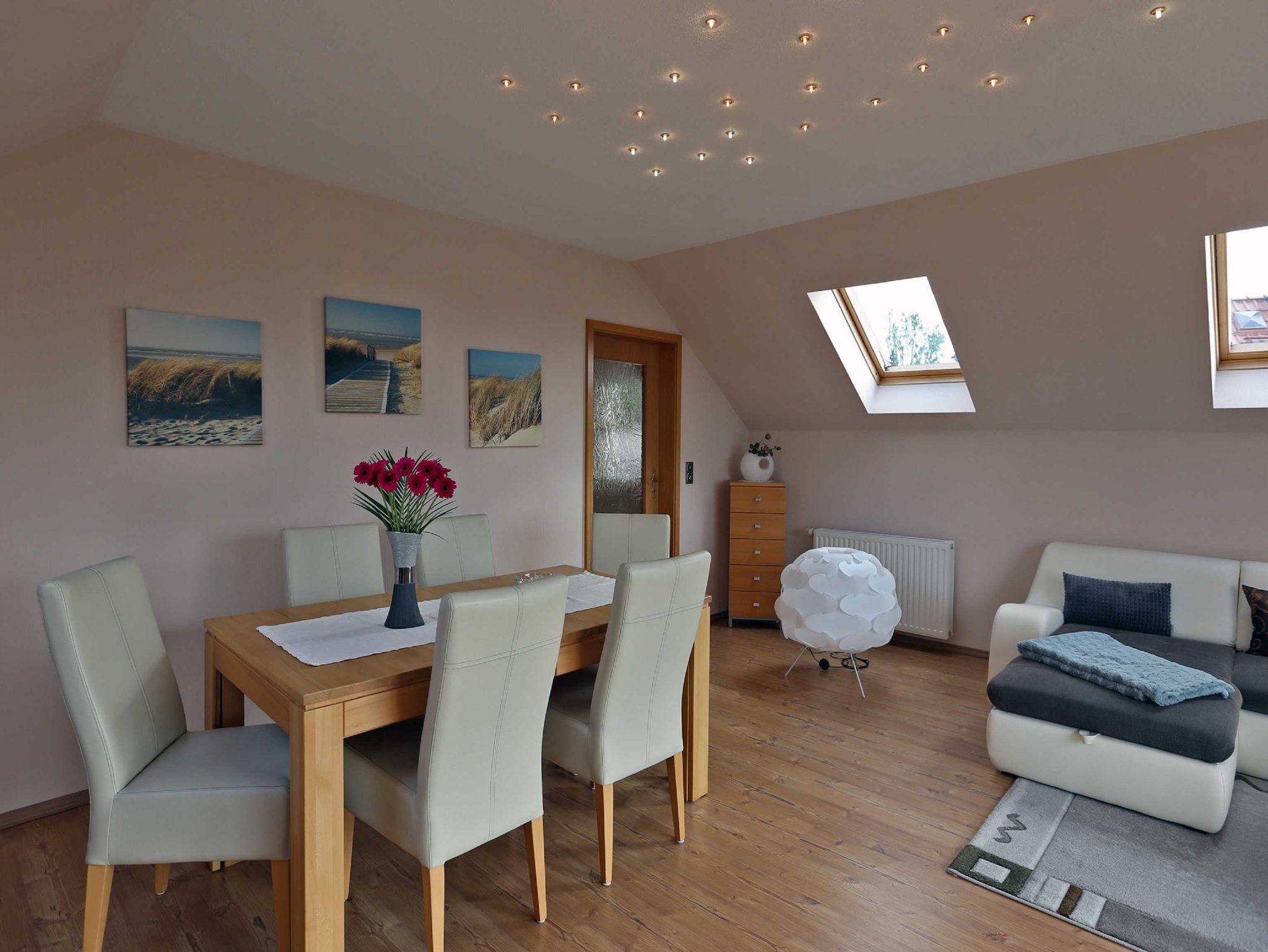Eine liebevoll eingerichtete Ferienwohnung mit großem Wohnzimmer, gut ausgestatteter Küche, sowie zwei Schlafzimmern und einem geräumigen Badezimmer mit Dusche und Badewanne.