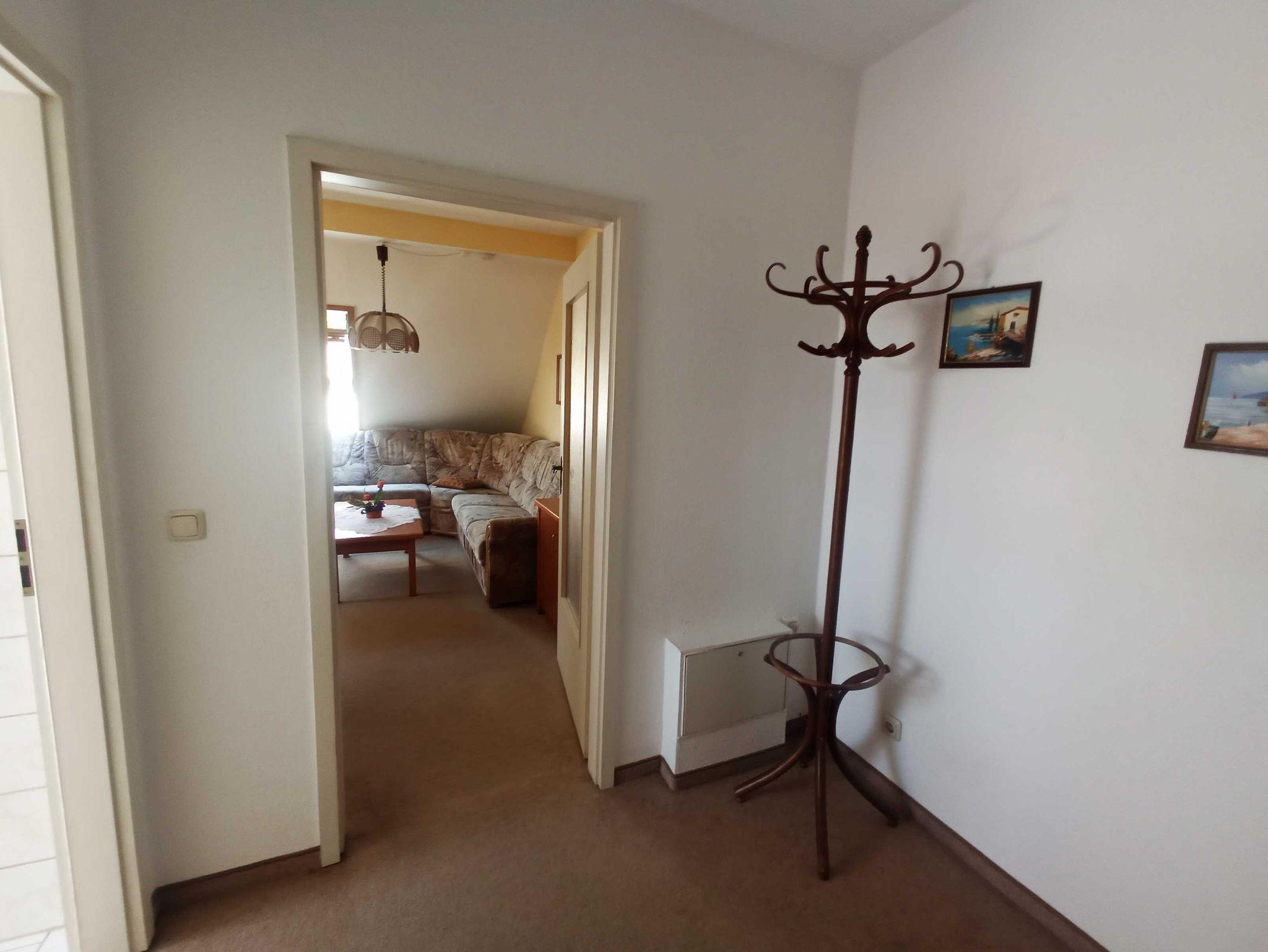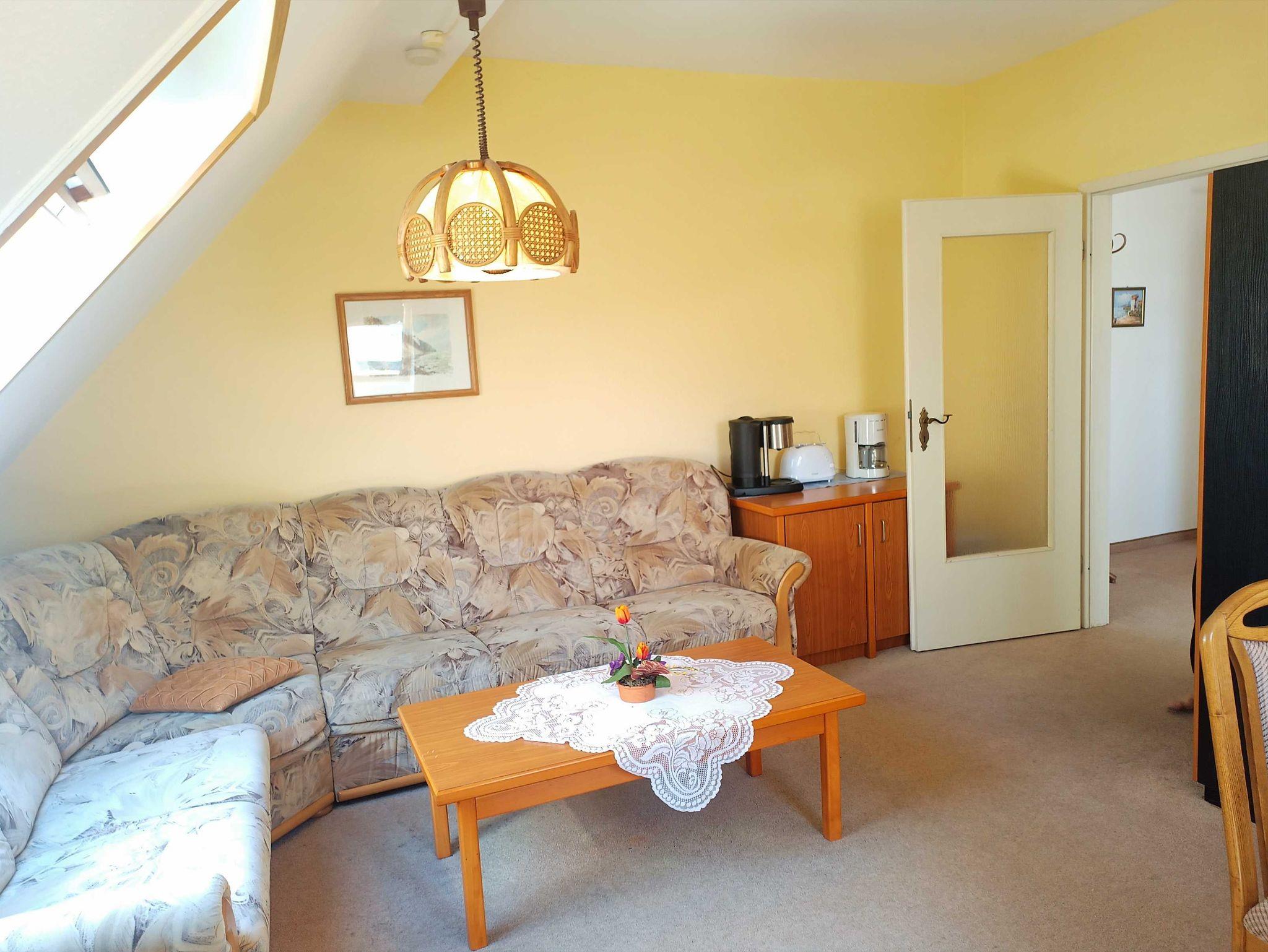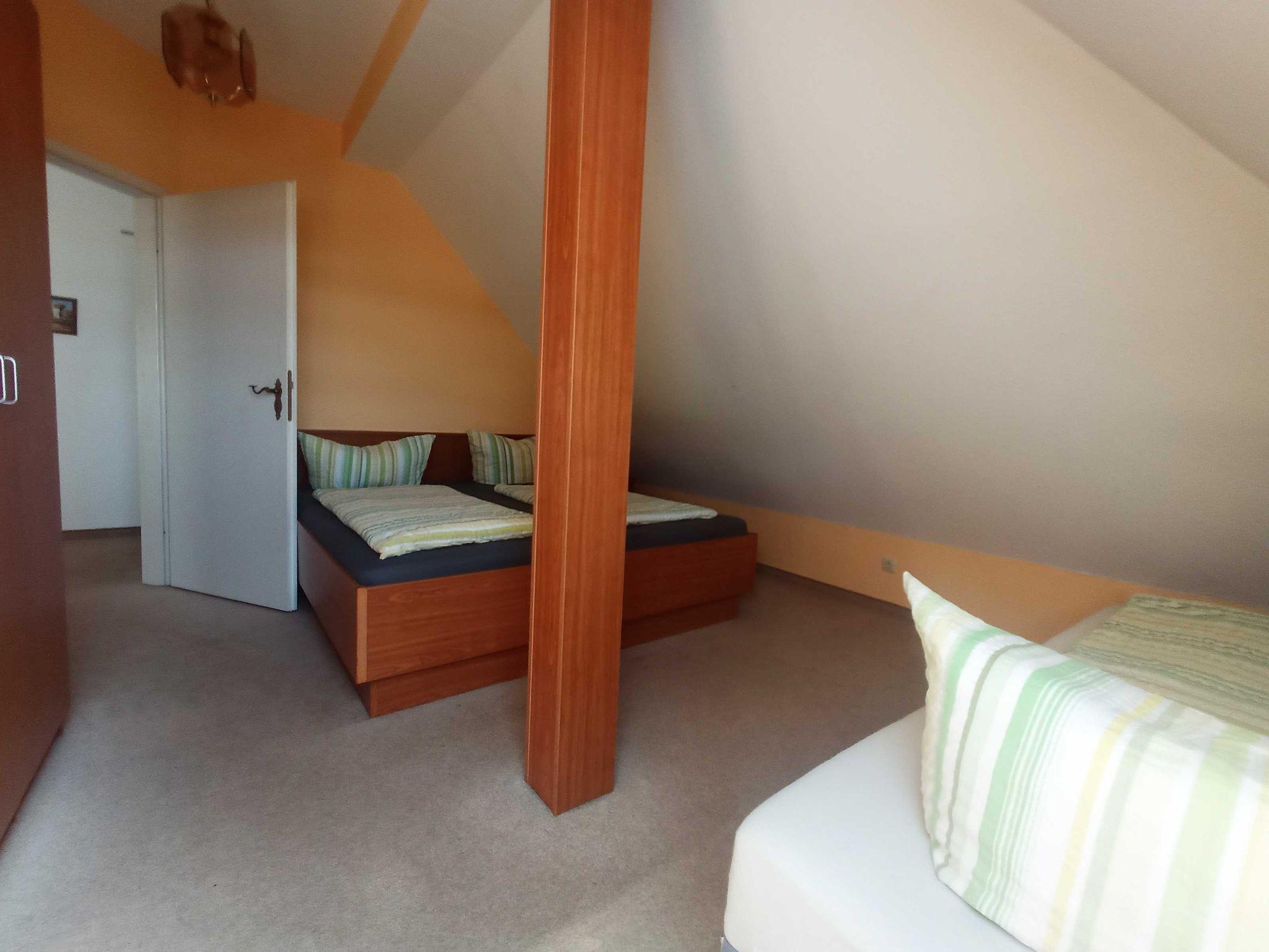 Die 2-Raum-Wohnung in der DG mit 47 m² für 4 Personen verfügt über einen Wohnraum mit Einzelbett und Pantryküche, 1 Schlafzimmer mit Doppelbett und Einzelbett, Bad mit Dusche und WC.