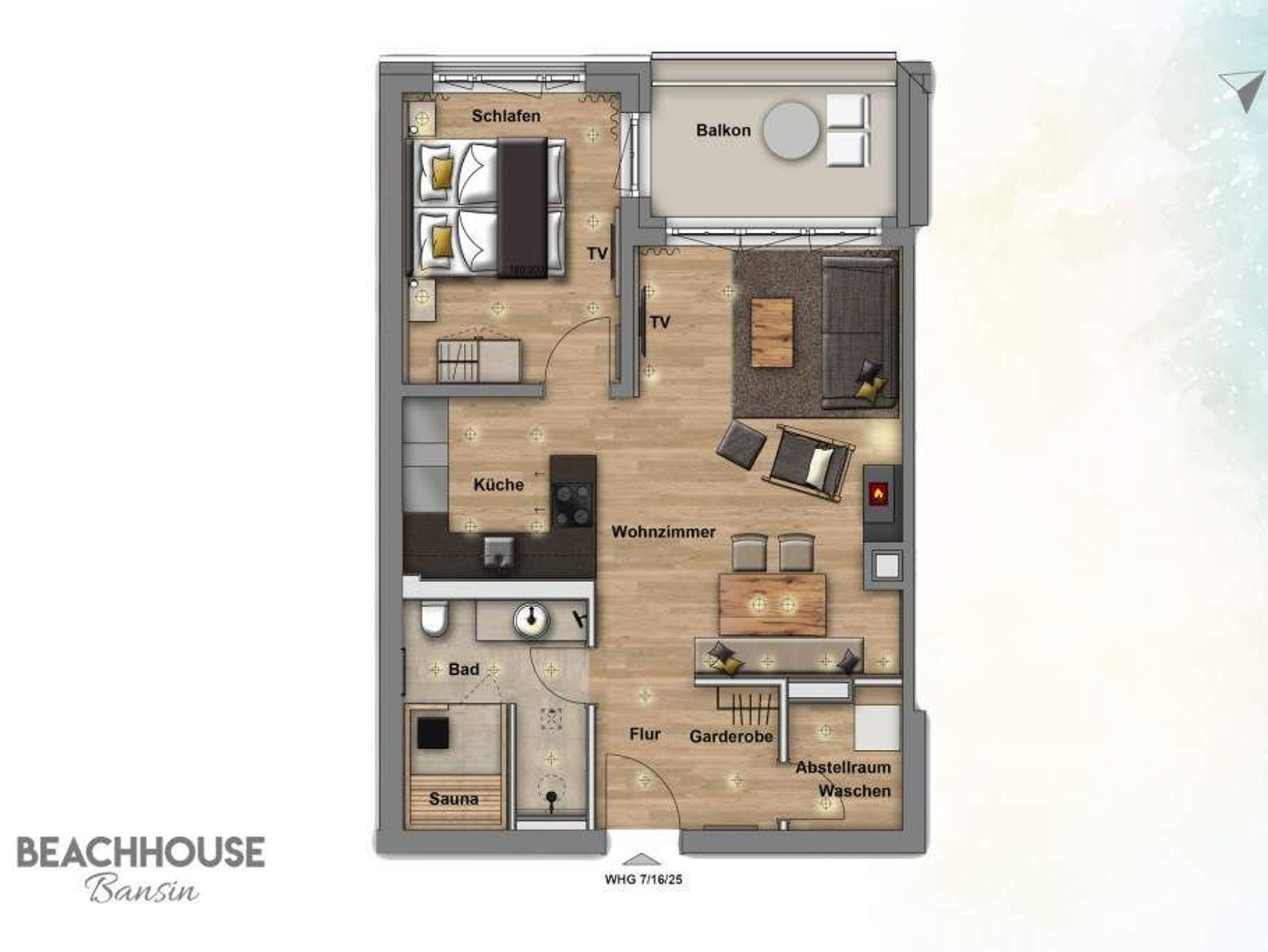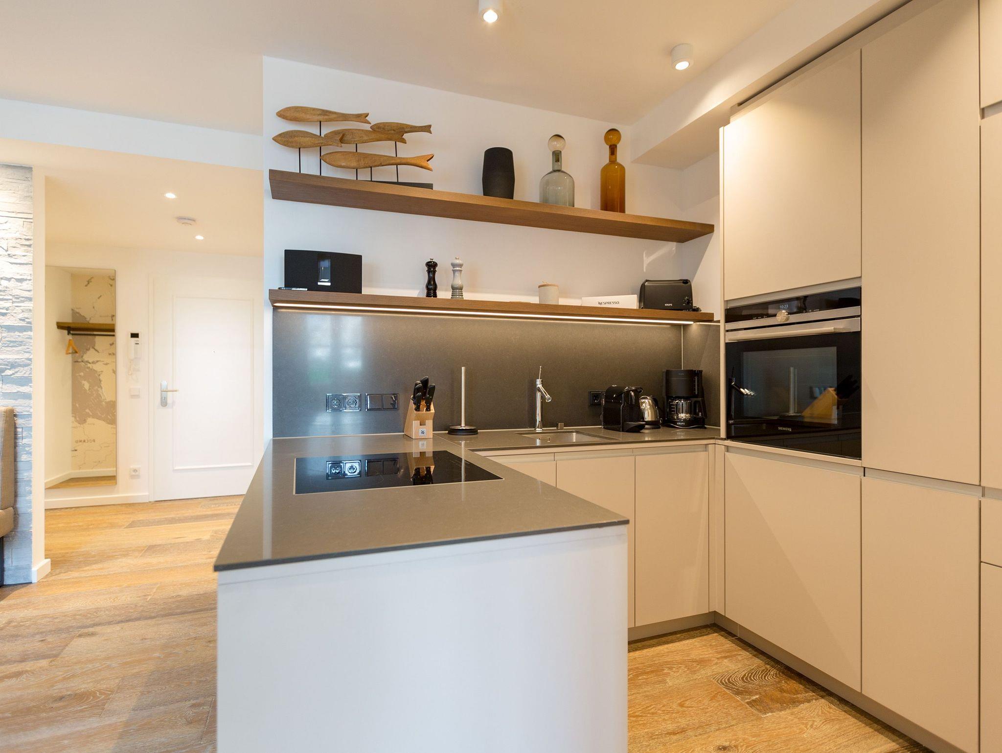 Ein Kuschelreich für Zwei mit viel Platz zum Leben, Lieben und Loslassen ist das 51 Quadratmeter große Urlaubsparadies im 1. Oberschoss des Beachhouses. Eleganz und Stil durchzieht das Zwei-Raum-Appartement vom Eingang bis hinaus auf den Balkon. Denn vom Innenarchitekten konzipiert, strahlt es viel Ruhe und Harmonie aus. Kommen Sie runter, schalten Sie ab und genießen Sie den seitlich eingeschränkten Blick zur Ostsee vom Balkon aus. Durch die bodentiefen Fenster können Sie das Meer auch im Inneren rauschen hören. Die Einrichtung ist stylisch und exklusiv. Von der Stange ist hier nichts. Die hochwertigen Design-Möbel, Lampen und Accessoires machen Ihre Auszeit zu etwas ganz Besonderem. Denn oberstes Gebot in diesem Paradies ist Wohlfühlen. Ob auf dem bequemen Sofa oder am Esstisch ? jeder Atemzug wird zur Entspannung. Auch den geliebten Vierbeiner können Sie hier mitbringen. Denn Haustiere sind erlaubt. Ein schöner Gas-Kamin sorgt per Knopfdruck für Romantik. Kochen Sie gemeinsam in der voll ausgestatteten Küche, die zum Wohnzimmer hin offen ist. Mikrowelle, Herd, Kühlschrank, Kaffeemaschine, Geschirrspülmaschine ? alles steht zu Ihrer Verfügung. Edles Geschirr gibt den passenden Rahmen für feine Gerichte oder gar Mehr-Gang-Menüs. Im Wohnzimmer wie auch im Schlafzimmer befindet sich ein Flat-TV. Zudem gibt es eine Hi-Fi-Anlage mit Bluetooth. Ins Internet kommen Sie kostenlos. Auch die Nächte werden in dem Appartement zum erholsamen Vergnügen. Dafür sorgt das urgemütliche Boxspringdoppelbett (1,80 m x 2,00 m). Viel Platz zum Verstauen der Urlaubsgarderobe haben Sie im Schrank. Im geräumigen Badezimmer erwartet Sie sogar noch eine Finnische Sauna. Da wird der Urlaub zur echten Wellness-Auszeit. Regendusche, Waschtisch und WC gehörend selbstredend ebenfalls zur Badausstattung dazu. In einem Hauswirtschaftsraum finden Sie einen Wasch-Trockner. Für eine rundum sorglose Auszeit ist alles für Sie bereitet. Die Betten sind frisch bezogen und Handtücher liegen bereit. In der modernen Tiefgarage ist für Sie der Stellplatz Nr. 7 im Doppelparker oben (max. Höhe 2,00 m, max. Länge 5,10 m, max. Breite 2,50 m, max. Last 2.600 kg) reserviert.