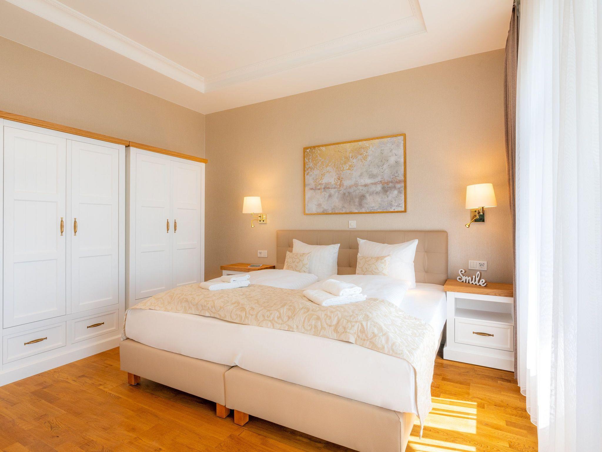 Die sechs Schlafplätze verteilen sich auf zwei Schlafzimmer sowie der Schlafcouch im Wohnbereich, welche sich im Handumdrehen für zwei Gäste als Schlafmöglichkeit umfunktionieren lässt. Während Sie im ersten Schlafzimmer ein bequemes und zugleich hochwertiges Boxspringbett (200 x 200cm / zwei getrennte Matratze) zur Nachtruhe einlädt, erwartet Sie im zweiten Schlafzimmer eine hochwertige Schlafcouch zum Ausziehen. Beide Schlafzimmer sind mit einem Flat TV ausgestattet auch ein Kleiderschrank zum Verstauen Ihrer Habseligkeiten während Ihrer Urlaubszeit steht für Sie bereit.