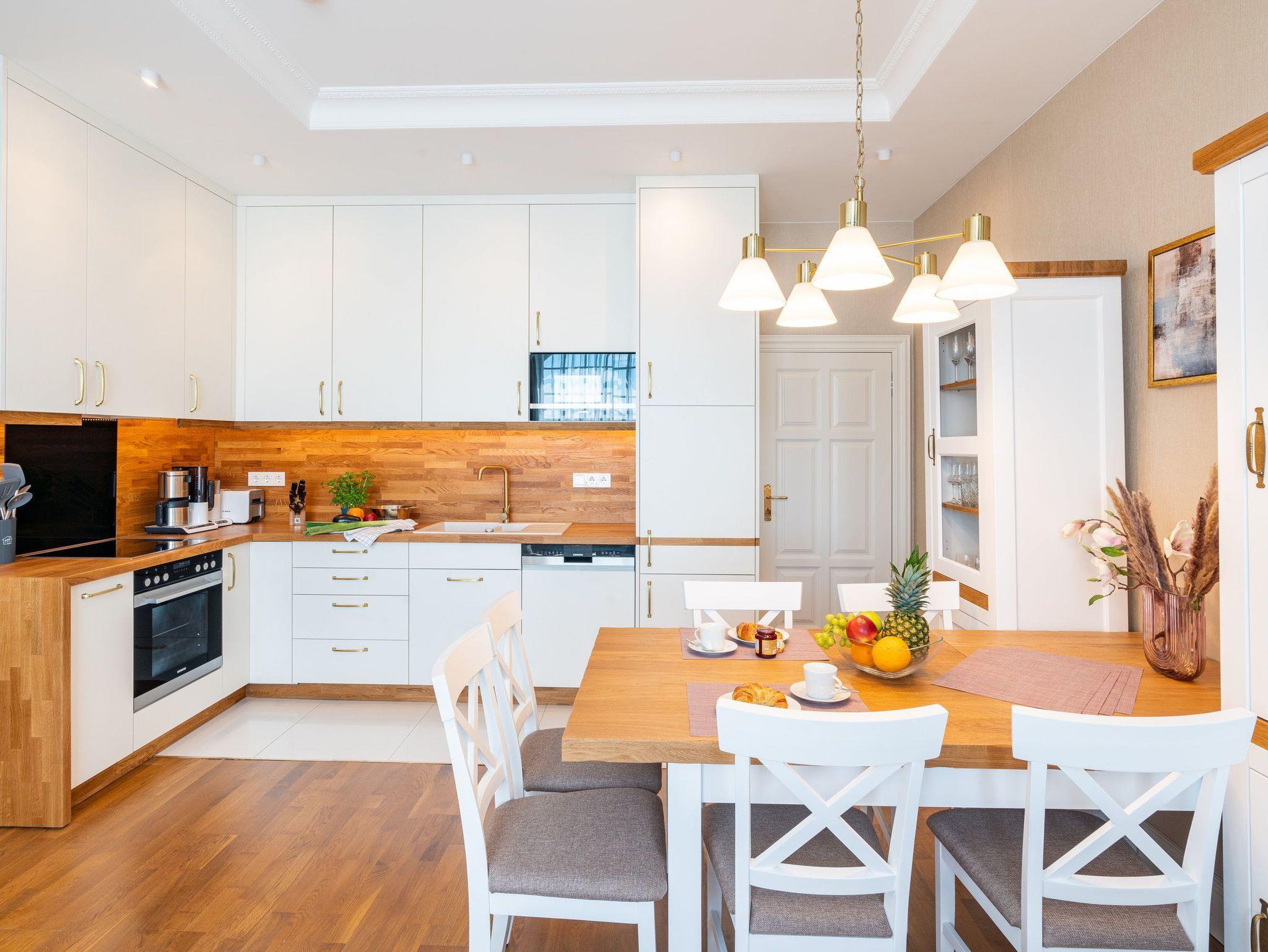 Das helle Drei-Zimmer-Appartement hat eine Größe von 60 Quadratmetern und liegt im 2. Obergschoss der Villa Waldschloss. Die vollausgestattete Küche, welche speziell von einem einheimischen Tischler angefertigt wurde, ergänzt die Annehmlichkeiten dieses neuen Appartements mit allen Raffinessen: Backofen, Mikrowelle, Kühlschrank mit Gefrierfach, Toaster, Wasserkocher, Kaffeemaschine sowie einem Essplatz für 6 Personen mit Blick in den gegenüberliegenden Park. Echtholzparkett im Wohn- und Schlafraum, unkaputtbare Tapeten aus Amerika. Bei der Umgestaltung wurde nichts dem Zufall überlassen.
