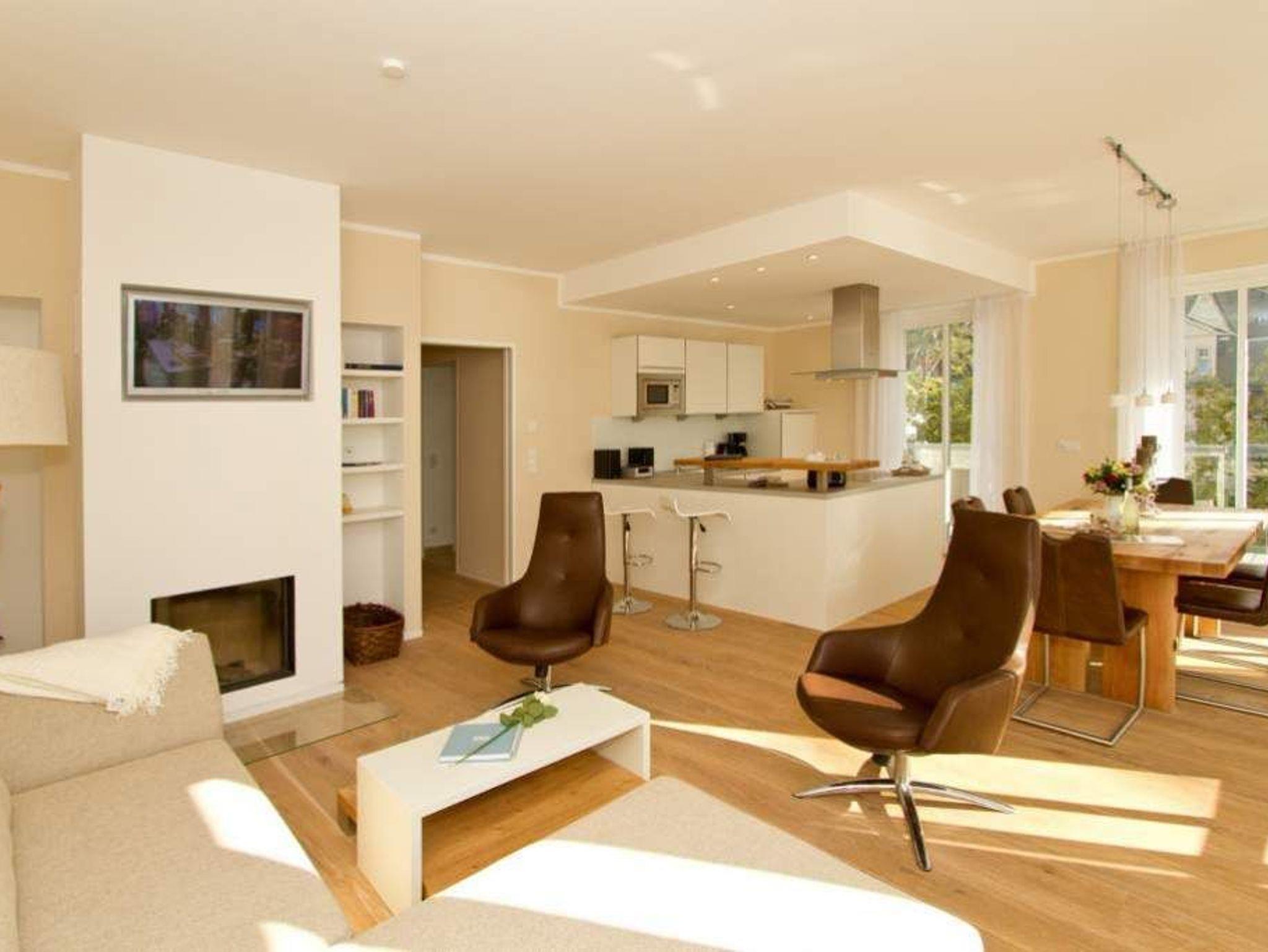 In dieser großzügigen 3-Raum-Ferienwohnung im 1. Obergeschoss werden Sie sich von Beginn an wie zu Hause fühlen. Die, von einer namenhaften Innenarchitektin designten 120 qm Wohnfläche bieten Platz für 4 Erwachsene und 1 Kleinkind (bis 3 Jahre im Kinderreisebett). Bei der Gestaltung wurde Wert auf Stil, Wertigkeit aber auch auf Leichtigkeit gesetzt. Entstanden ist ein lichtdurchflutetes Domizil, das auch noch einen wunderschönen Blick auf den Schloonsee bietet. Der Wohnbereich mit integrierter, komplett ausgestatteter, offener Küche bietet auch eine bequeme Sitzgruppe vor dem Kamin. Ein großer Holzesstisch wird sicher nicht nur zum Frühstück Ihr Lieblingsplatz. Zwei großzügige Schlafzimmer mit Boxspring-Doppelbetten und jeweils eigenem TV erwarten Sie. Ein Schlafzimmer nutzt ein Bad en Suite mit Dusche, Badewanne und abgeteiltem WC. Im zweiten Duschbad wurde die Sauna integriert, ein tolles Highlight, nicht nur in der kalten Jahreszeit. Besonders schön sind auch die beiden Balkone (1x Ostseite / 1x geschützte [&] sonnige Südseite), die mit Seeblick auf den schönen Schloonsee aufwarten. Für Ihren Komfort können sie eine Waschmaschine nutzen, weiterhin steht die Erstausstattung Wäsche für Sie bereit. Für die Kleinen können ein Kinderreisebett [&] ein Kinderhochstuhl (gegen Aufpreis) dazu gebucht werden. Das Wlan-Netz in der Wohnung ist kostenfrei nutzbar.