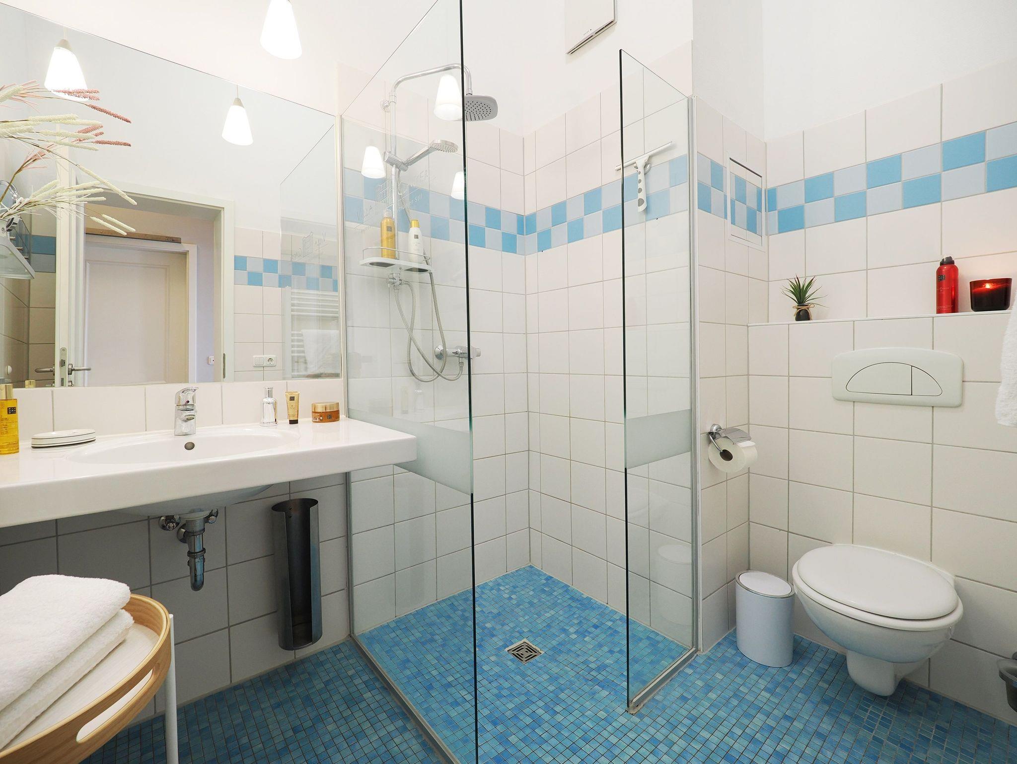 Das Badezimmer verfügt über eine ebenerdige, offene Glasdusche mit einer erfrischenden Regendusche. Außerdem gibt es ein WC, eine Handtuchheizung und einen modernen Waschtisch. Ein Haartrockner ist ebenfalls vorhanden und für Ihre erste erfrischende Dusche stehen Shampoo und Duschgel zur Verfügung.