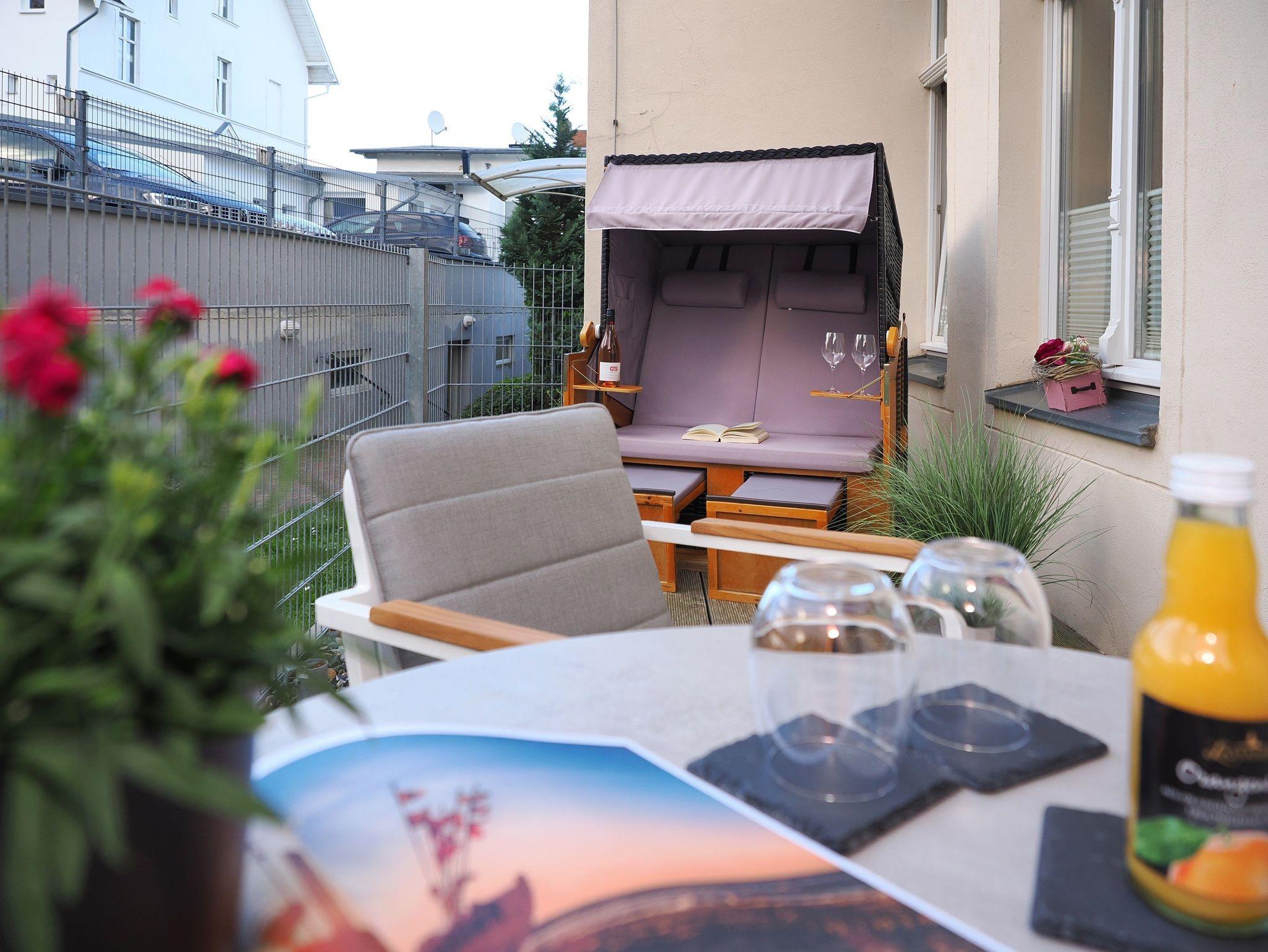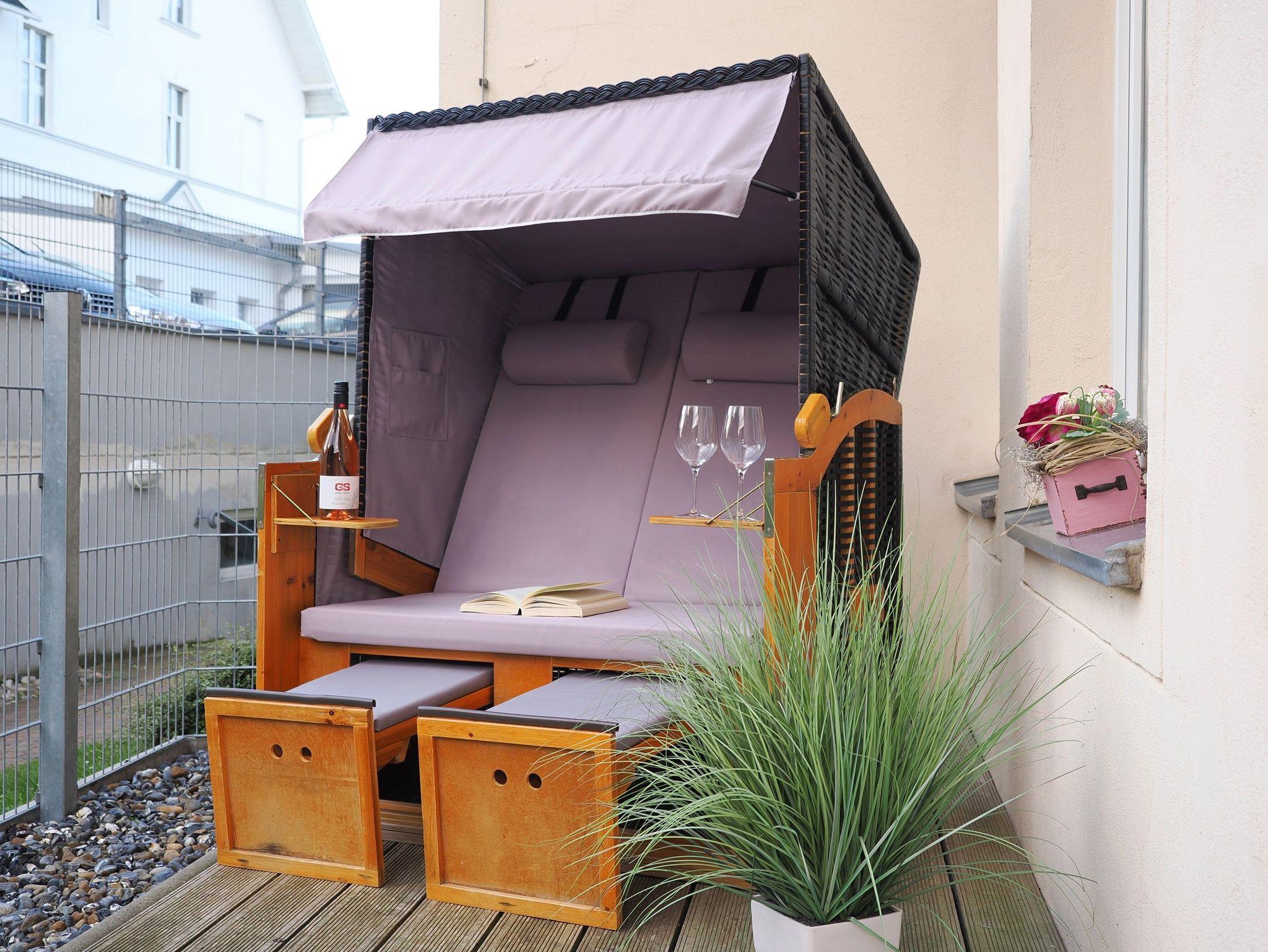 Die direkt ans Wohnzimmer anschließende Terrasse lädt zum Relaxen ein. Dort steht Ihnen ein eigener Strandkorb zur Verfügung, der für gemütliche Stunden sorgt. Ob ein gemeinsames Frühstück mit der Familie oder ein Sonnenbad mit einem spannenden Buch ? hier können Sie pure Entspannung genießen.