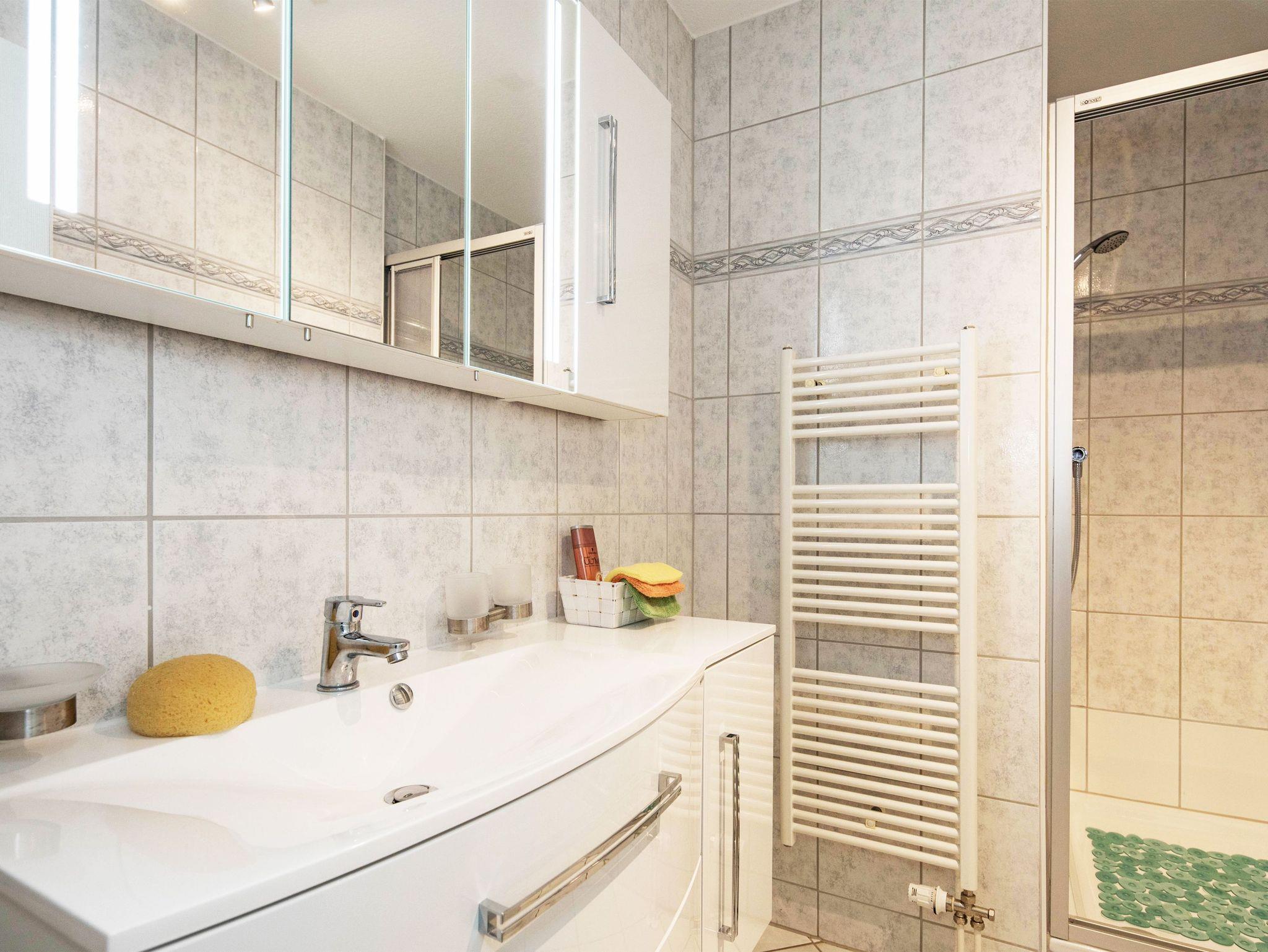 Im hell gefliesten Dusch-Bad finden Sie genügend Platz für Ihre persönlichen Kosmetikartikel.