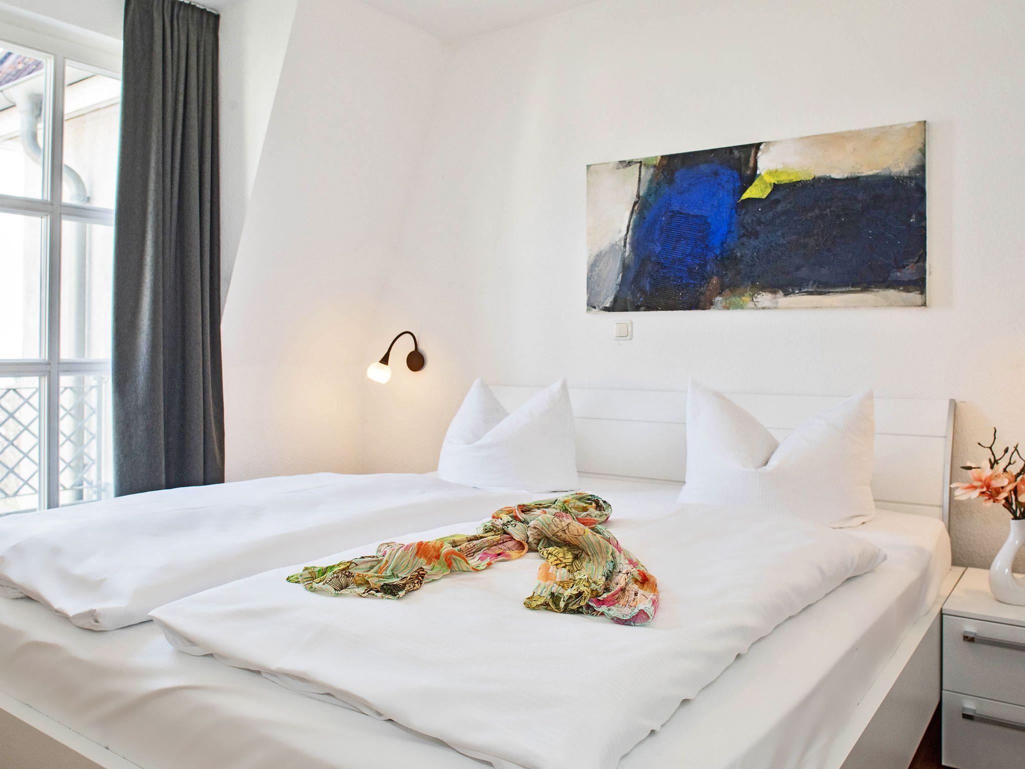Das separate Schlafzimmer verfügt über ein gemütliches Doppelbett und bodentiefen Fenstern.