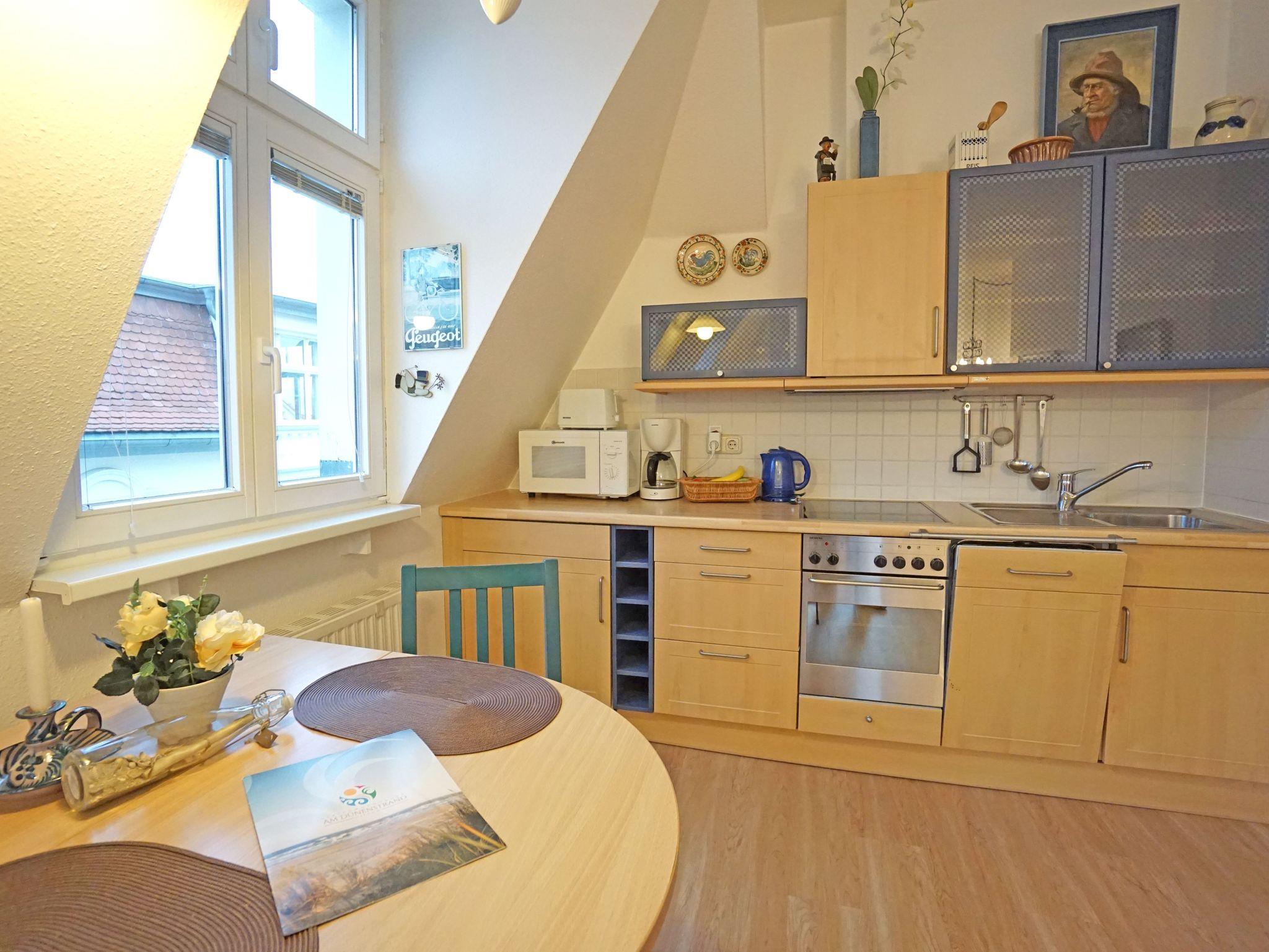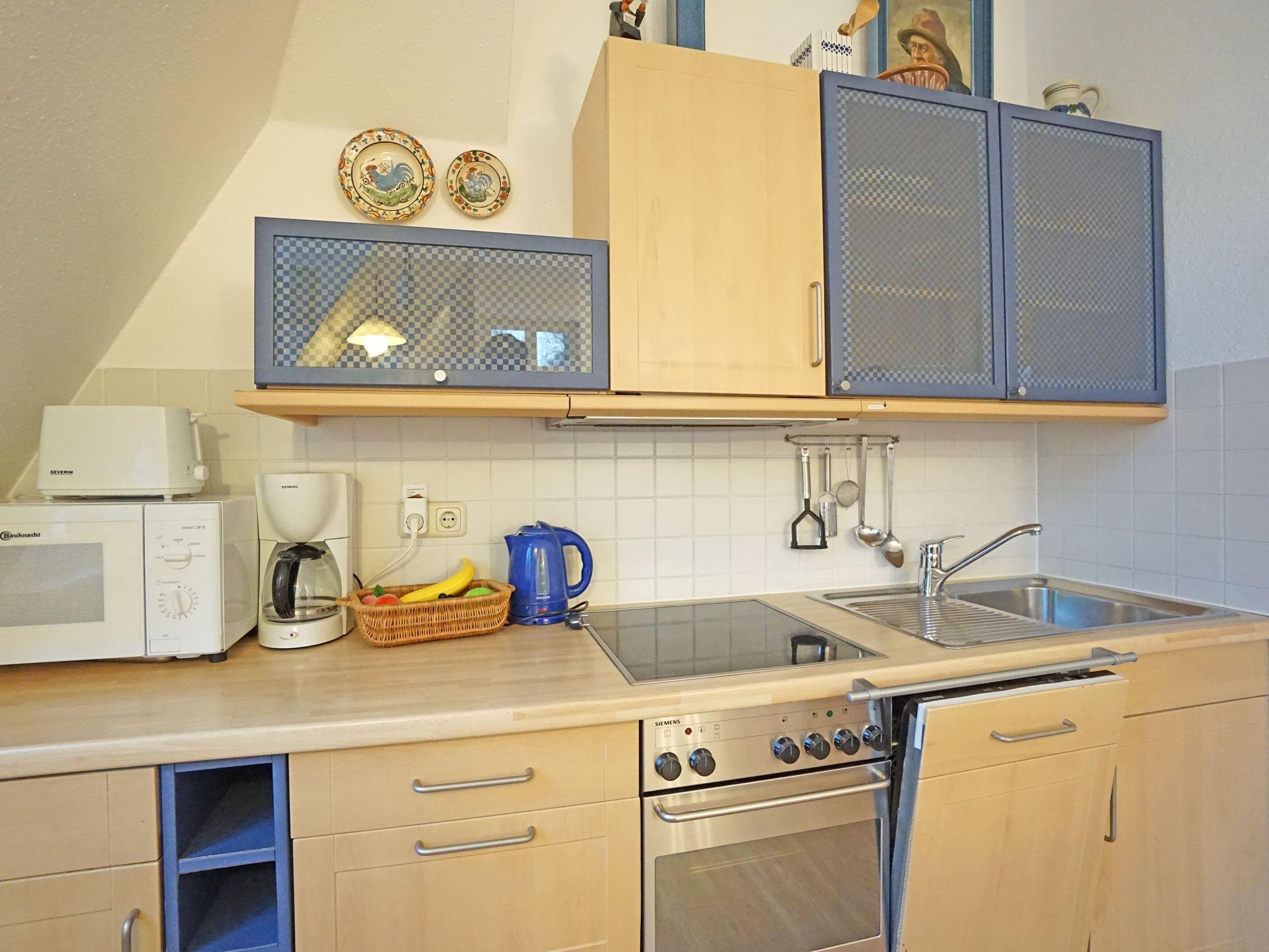 Küchenausstattung: Spülmaschine, Backofen, Microwelle, Kaffeemaschine.