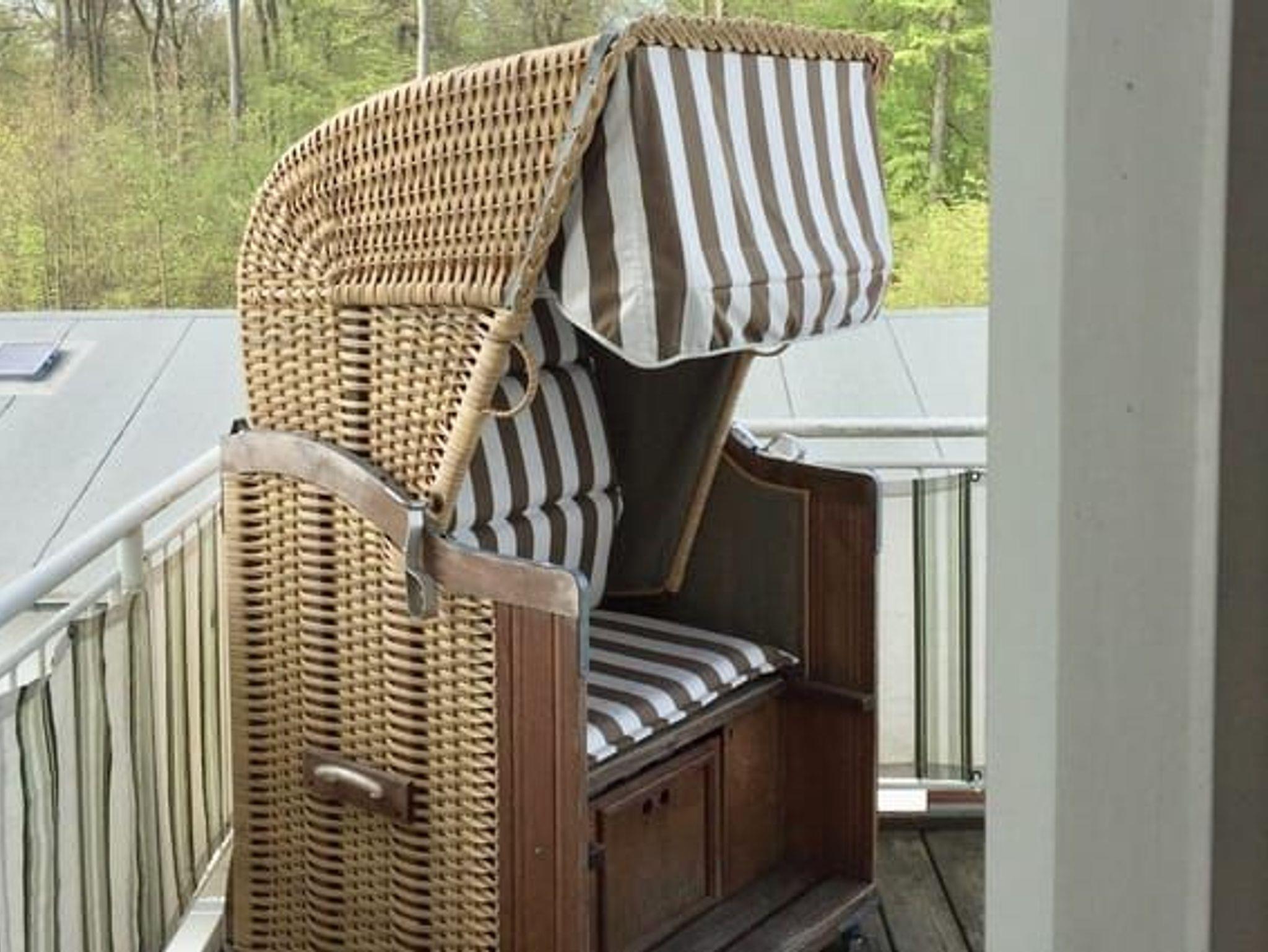 Auf dem grossen, windgeschützten Balkon stehen eine Sitzgruppe und ein Strandkorb.