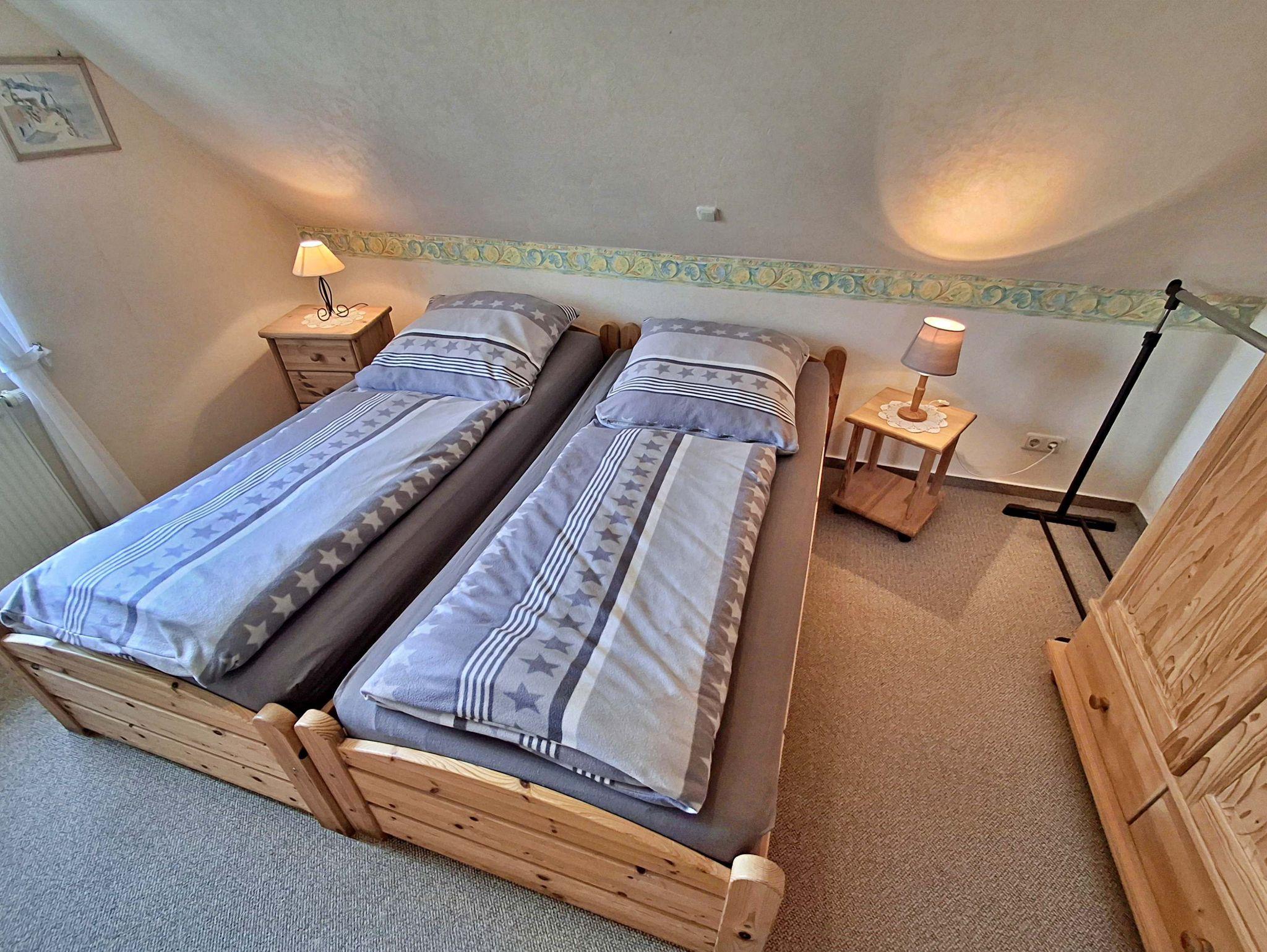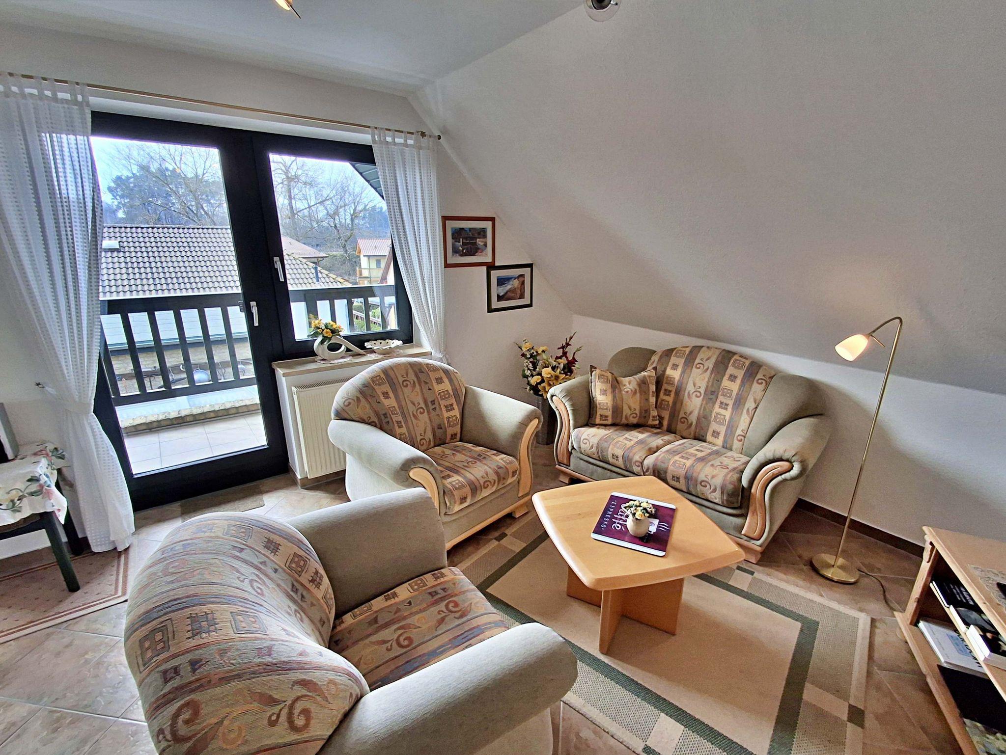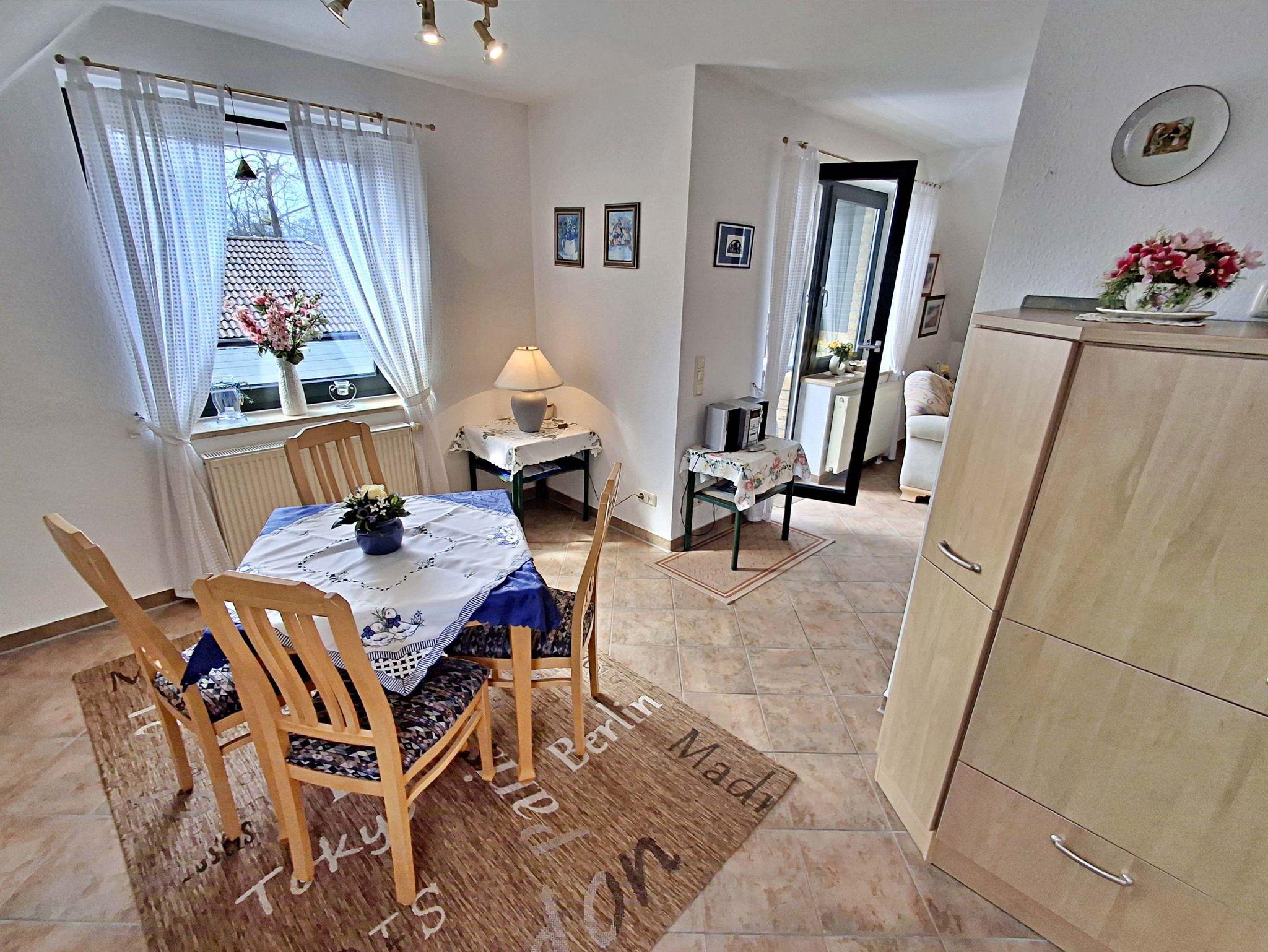 Diese ca. 50 qm große freundliche Unterkunft im 1. OG mit separatem Eingang bietet Ihnen alles, was Sie für einen angenehmen Aufenthalt benötigen. Der einladende Wohnbereich ist mit einer gemütlichen Couch, einem Sessel, TV und Radio ausgestattet, sodass Sie sich nach einem erlebnisreichen Tag entspannen können. Der Essbereich, der an die komplett ausgestattete Küche anschließt, lässt keine Wünsche offen. Hier finden Sie einen Ceranherd, Backofen, Spülmaschine, Mikrowelle, Wasserkocher, Kaffeemaschine und Toaster - perfekt für die Zubereitung Ihrer Lieblingsgerichte. Das separate Schlafzimmer ist mit einem komfortablen Doppelbett und einem Kleiderschrank ausgestattet. Dank des Außenrollos können Sie den Raum nach Belieben abdunkeln. Das Tageslicht-Bad mit Dusche und WC, ebenfalls mit Außenrollo, sowie ein kleiner Abstellraum runden das Angebot ab. Ein besonderes Highlight ist der Balkon zur Südseite, der vom Wohnzimmer aus zugänglich ist. Hier können Sie bereits am Morgen Ihren Kaffee genießen oder den Tag bei einem Glas Wein ausklingen lassen. Bitte beachten Sie, dass Bettwäsche und Handtücher mitgebracht werden müssen. In Ausnahmefällen kann der Vermieter diese gegen eine Gebühr zur Verfügung stellen, was vor Ihrer Anreise abgesprochen werden sollte. Selbstverständlich können Sie das WLAN kostenfrei nutzen.