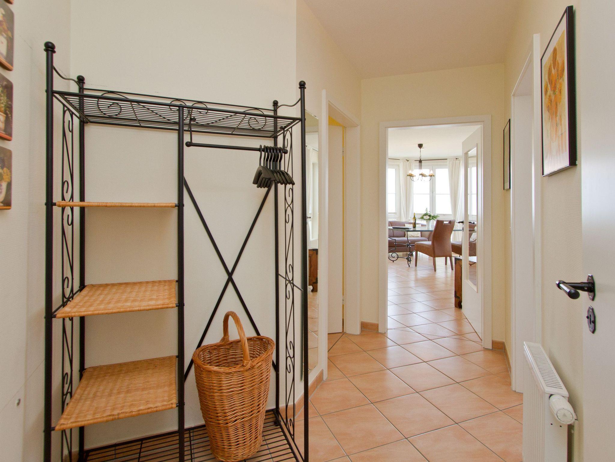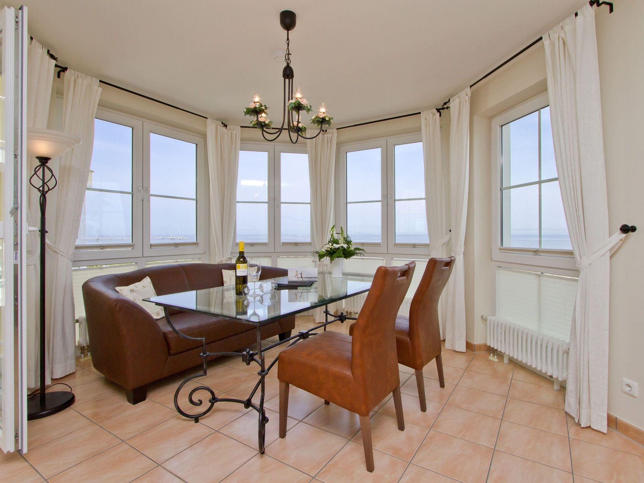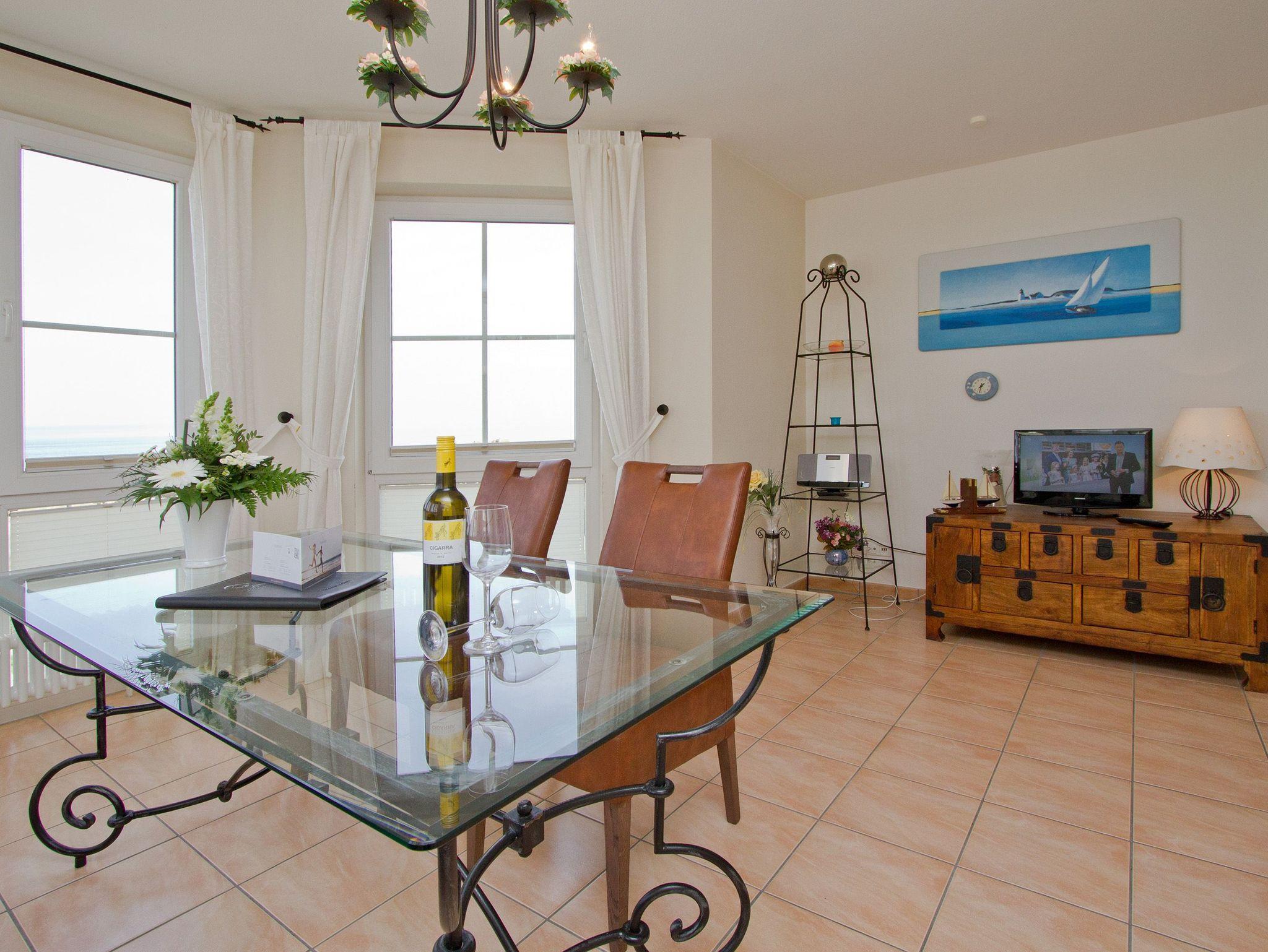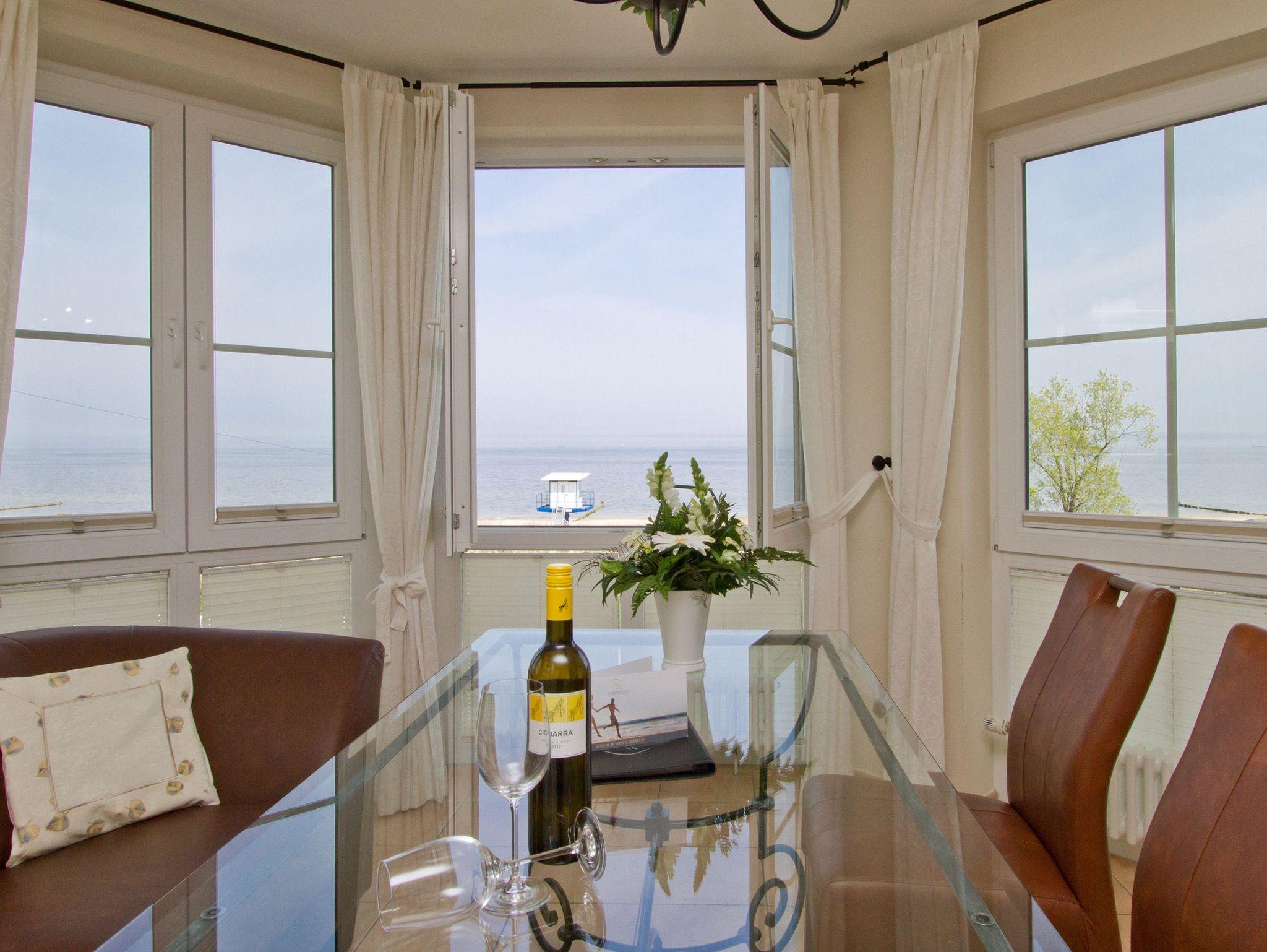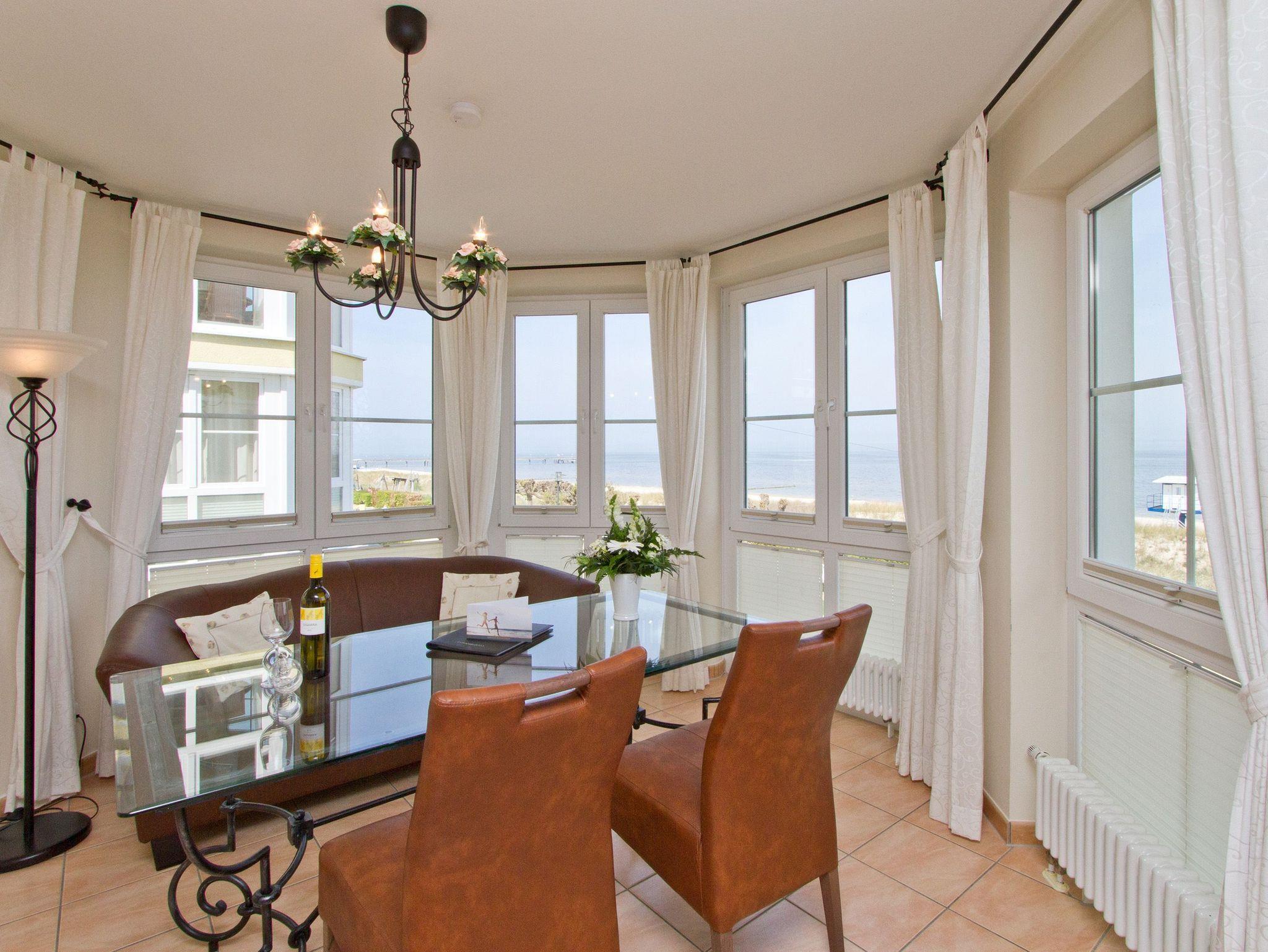 Genießen Sie den freien Meerblick aus dieser 3-Raum-Ferienwohnung. Entspannen Sie in hellen, lichtdurchfluteten Räumen mit geschmackvoller Möblierung. Zur Wohnung gehören ein großer Wohnbereich mit komplett ausgestatteter Küchenzeile und Essplatz, von dem Sie durch die großen Fensterfronten, direkten Blick auf die Ostsee genießen. Beginnen Sie Ihren Urlaubstag bei einem ausgiebigen Frühstück auf ihrem Balkon der zur Nord/West Seite gelegen und von dem Sie ebenfalls Blick auf die Ostsee haben. Zwei separate Schlafzimmer, eins mit Doppelbett und eins mit Einzelbett, bieten drei Personen Platz für eine erholsame Nacht. Für Ihren Komfort steht die Erstausstattung Wäsche (Bettwäsche [&] Handtücher) für Sie bereit. Das WLAN-Netz ist kostenfrei nutzbar.
