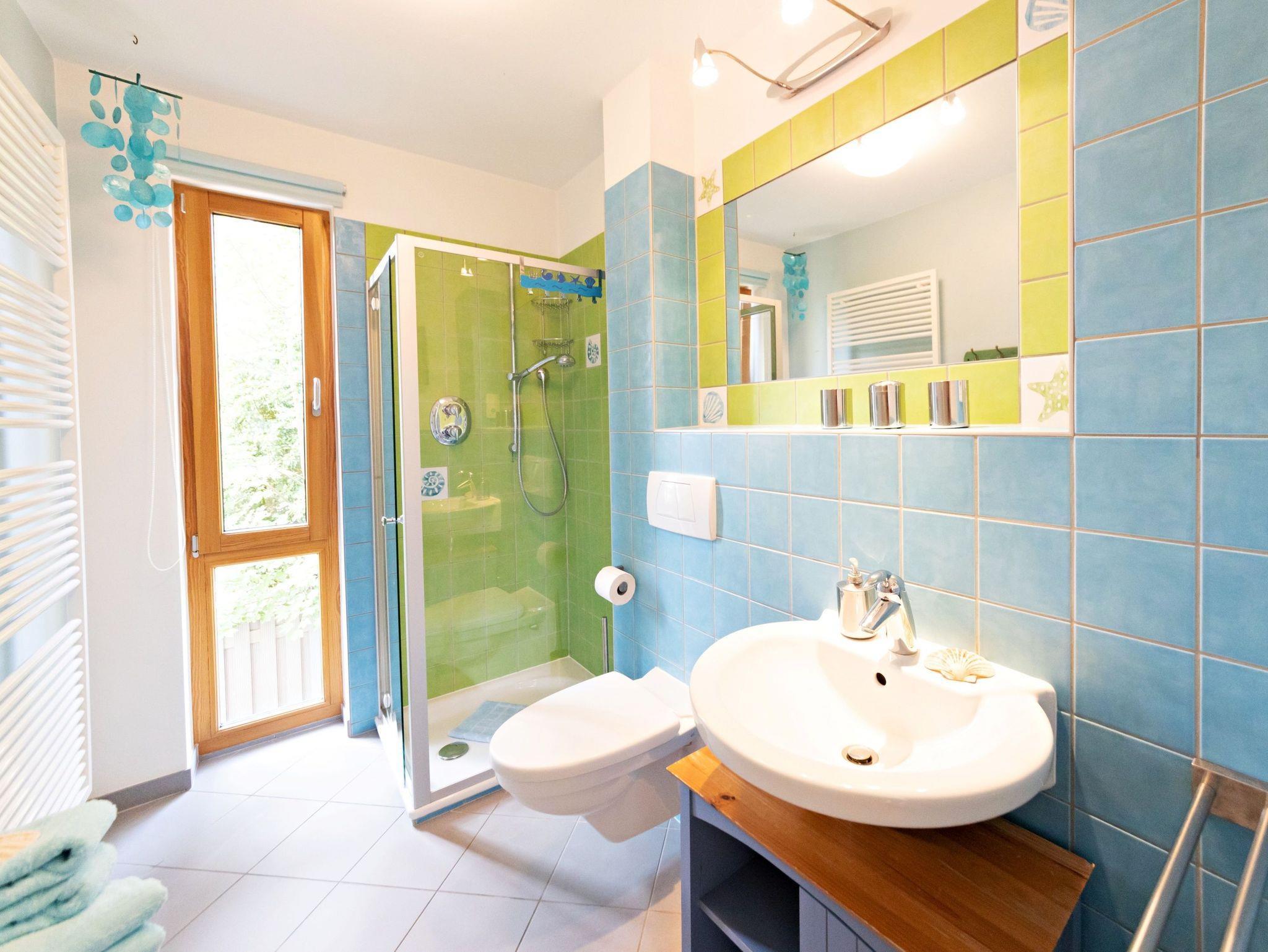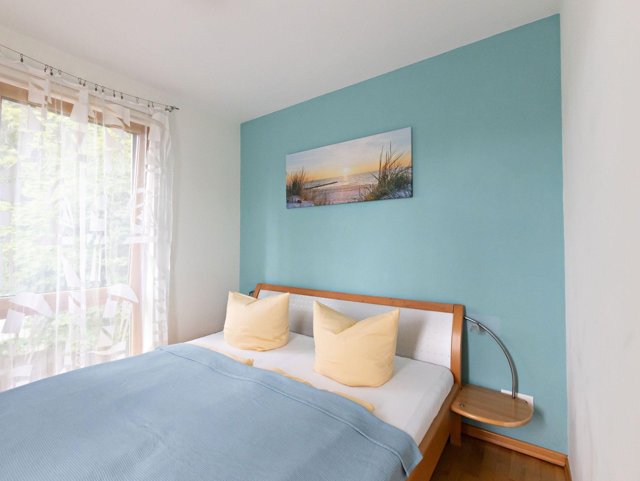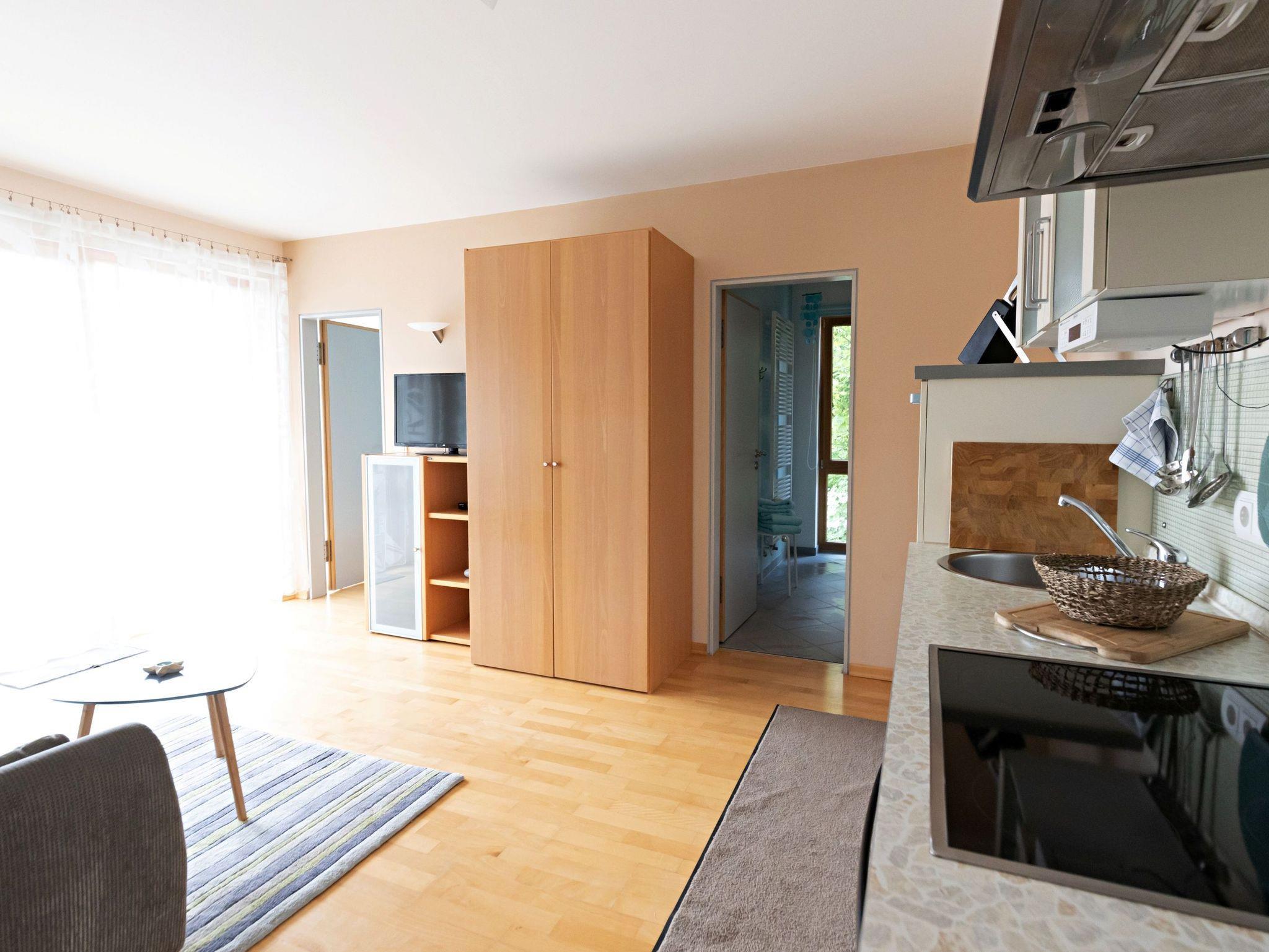 Moderne 2-Raum-Nichtraucher-Ferienwohnung (ca. 42 qm) im 1. Obergeschoß mit Balkon (zur Südseite) mit Sitzmöbeln. Das Schlafzimmer ist mit einem Doppelbett eingerichtet. Das gemütliche Wohnzimmer verfügt über eine Couch ,TV, Radio, Esstisch mit drei Stühlen sowie eine integrierte Küchenzeile (mit 4-Platten-Ceranherd, Backofen, Geschirrspüler, Kühlschrank, Kaffeemaschine, Wasserkocher, Toaster etc.). Das Bad verfügt über DU/WC sowie Haarfön. Die Wohnung ist mit einem allergikerfreundlichem Holzfußboden ausgestattet.