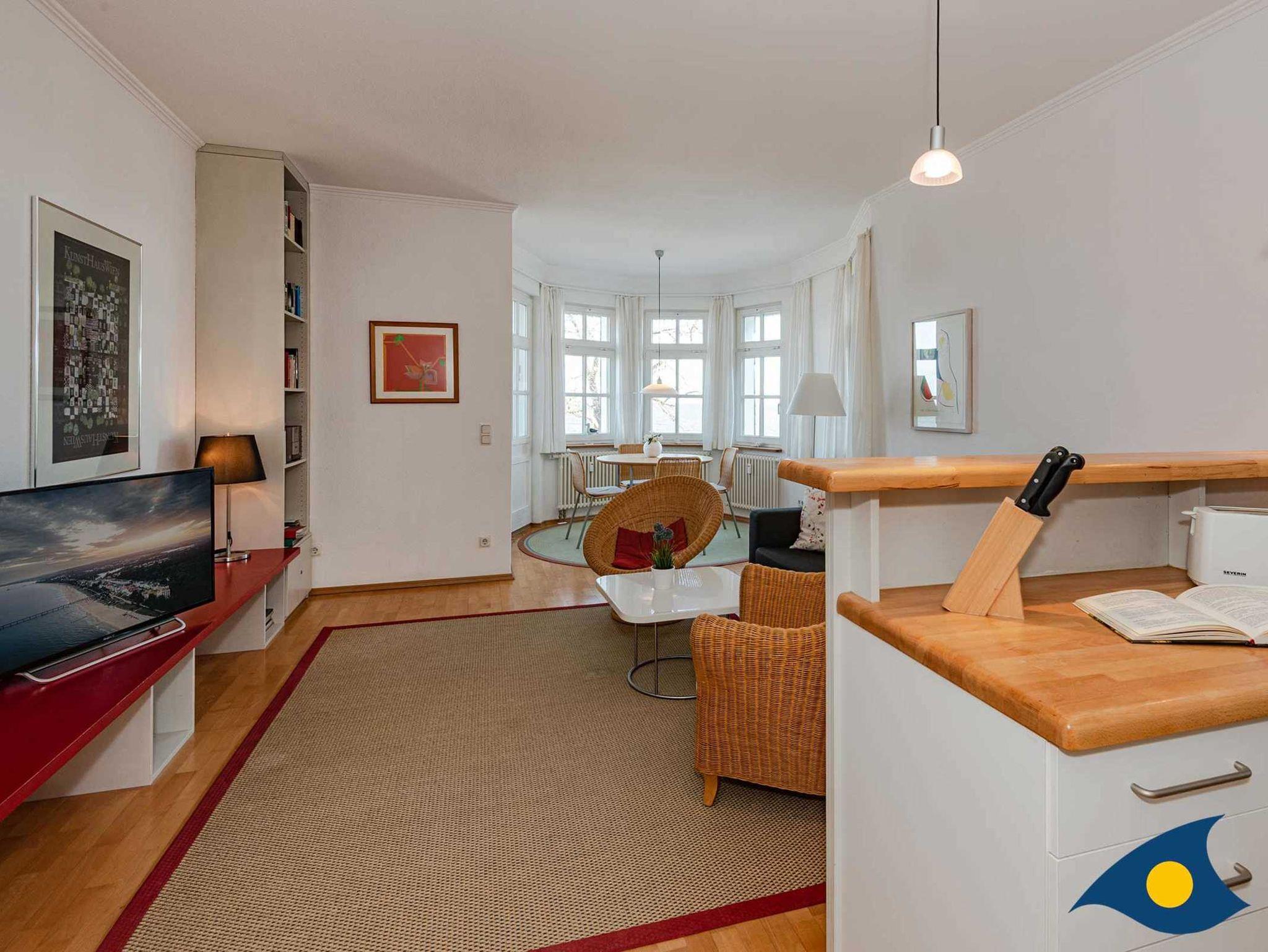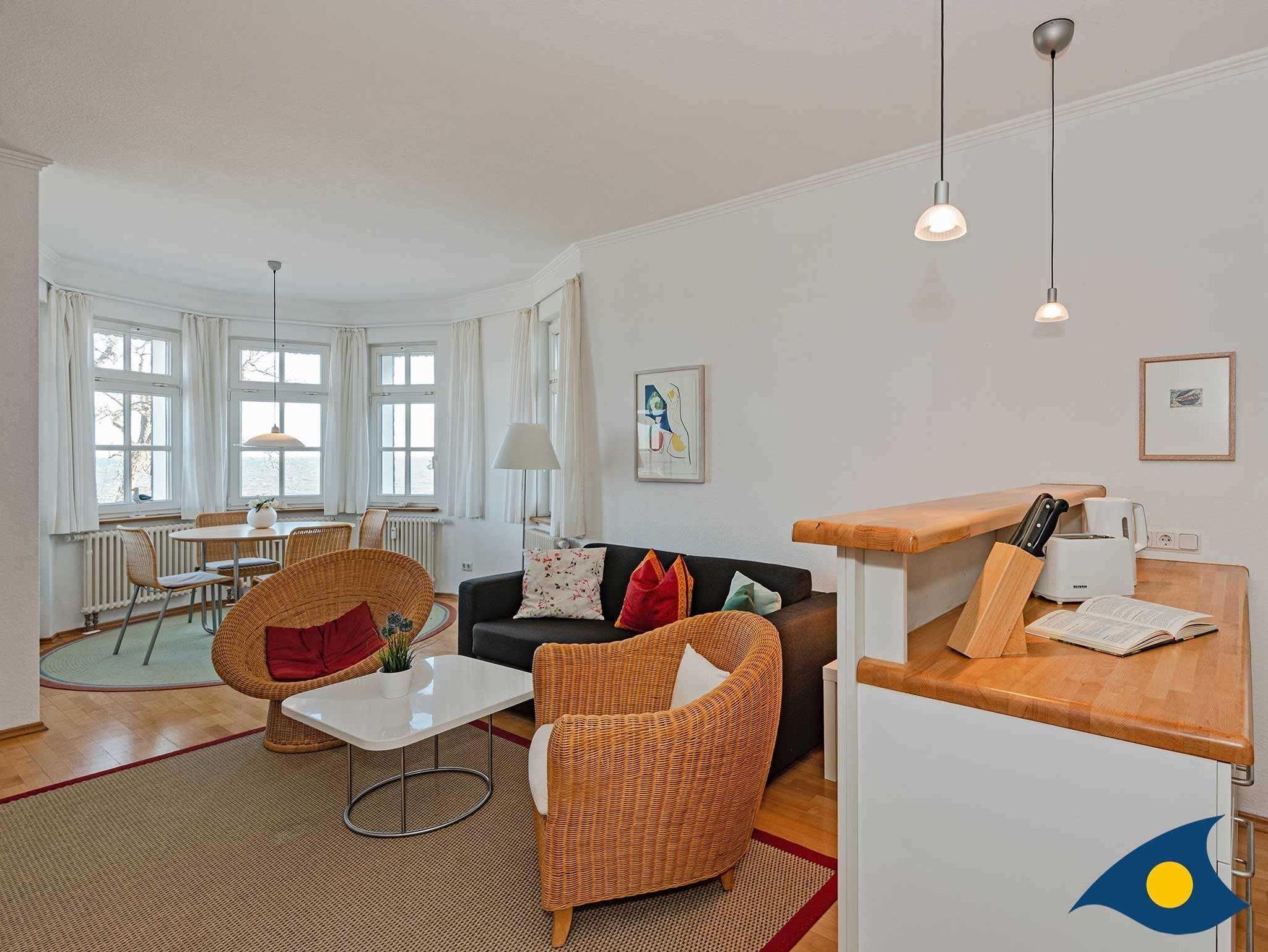 Die Wohnung 14 im 1. OG ist hochwertig und individuell eingerichtet. Vom romantischen Erker bietet sich ein traumhafter Blick über den Strand und die Ostsee. Die Wohnung besteht aus einem großen Wohnraum mit freiem Blick auf das Meer sowie einer offenen Küche mit Theke. Das Schlafzimmer ist hell und freundlich eingerichtet. Im Bad (mit Tageslicht) steht eine ebenfalls hochwertige Ausstattung inklusive einer Runddusche zur Verfügung.