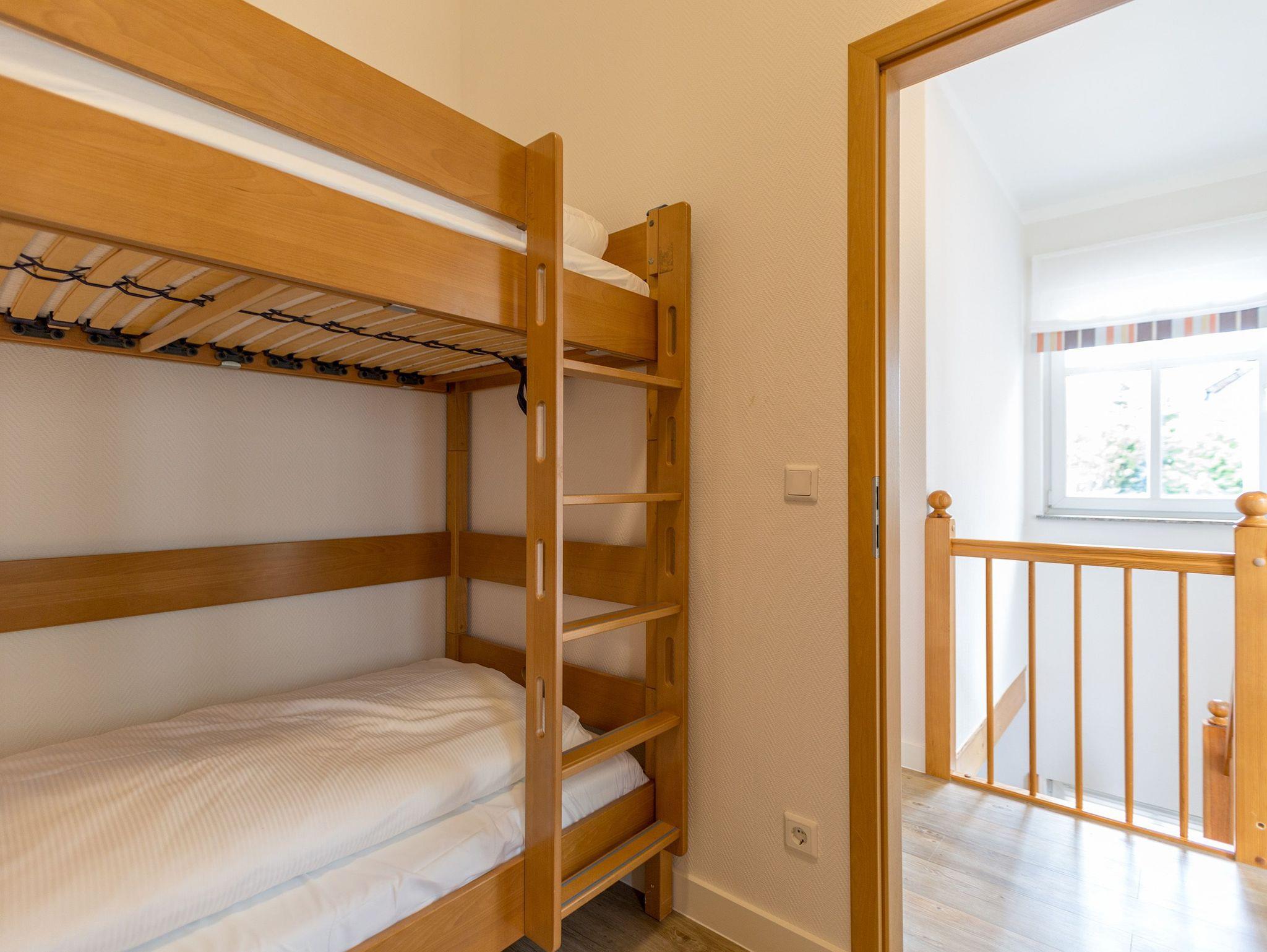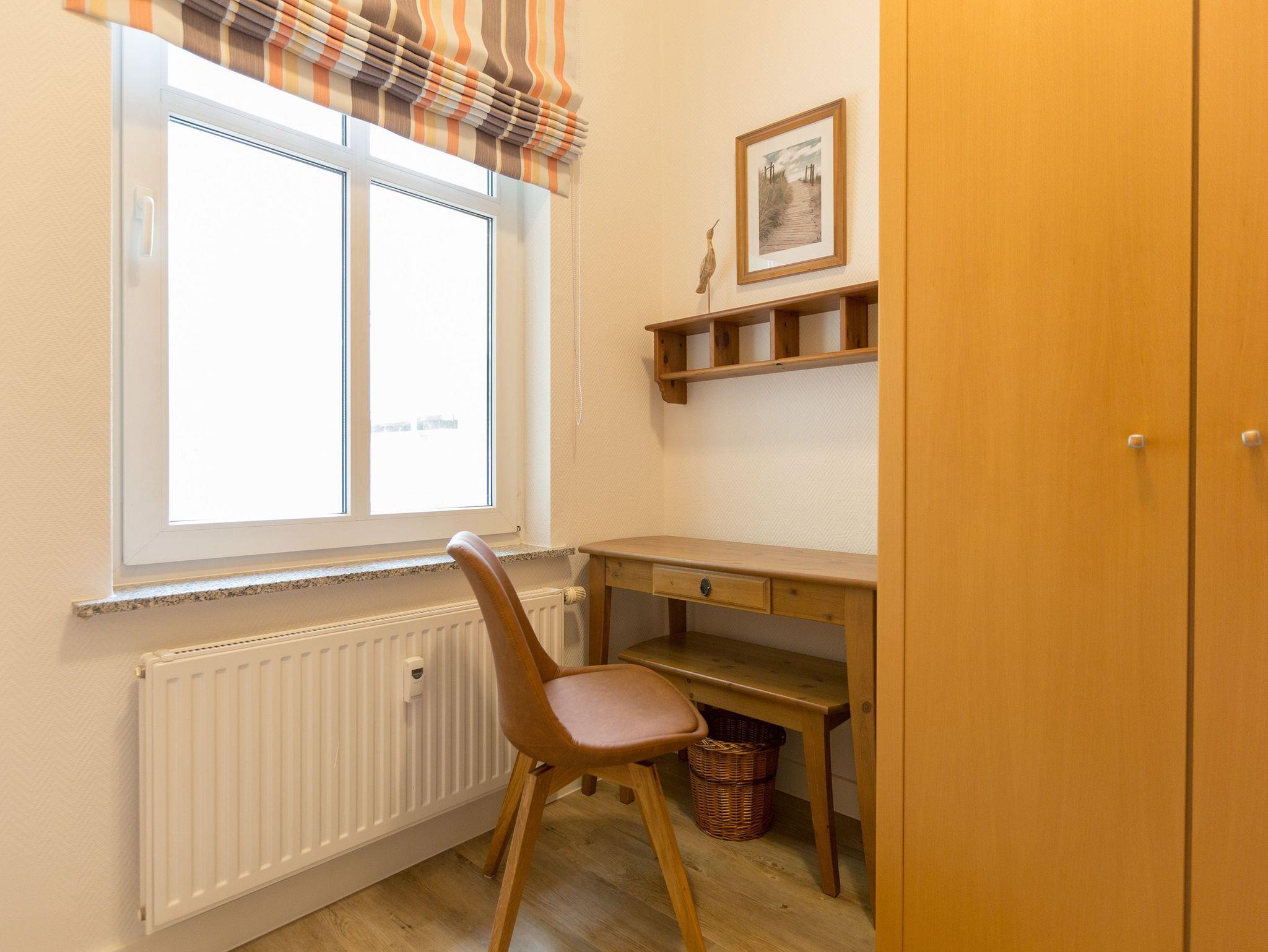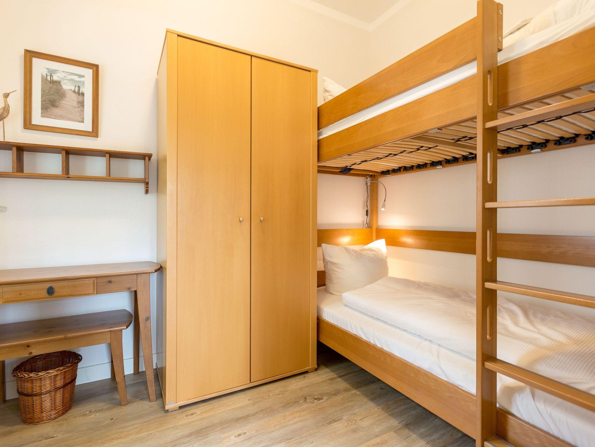Die mit Balkon und Terrasse 72 m² große Maisonette-Ferienwohnung bietet 4 Personen [&] 1 Kleinkind ( bis 3 Jahre im Kinderreisebett) bequem Platz. Im Erdgeschoss befinden sich der Wohnbereich mit gemütlichem Kamin, eine offene komplett ausgestattete Küchenzeile und der Essplatz im verglasten Erker. Eine offene Treppe führt in das Obergeschoss. Dort befinden sich zwei Schlafzimmer (1x Etagenbett, 1x Doppelbett), ein Duschbad und der Balkon mit einer Sitzgruppe für 4 Personen. Auf Wunsch stellen wir für unsere kleinen Gäste ein Kinderreisebett (ohne zusätzliche Matratze [&] Bettzeug) und einen Kinderhochstuhl ( gegen einen Aufpreis) zur Verfügung. Für Ihren Komfort sind die Betten bei der Anreise bezogen und Handtücher liegen bereit. Liebevoll ausgesuchte maritime Accessoires in allen Räumlichkeiten sorgen für ein behagliches Ambiente. Haustiere sind willkommen, sofern sie sich im gefliesten Erdgeschoss aufhalten. Für empfindliche Schläfer wurden Insektenschutzrollos angebracht. Das WLAN-Netz im Haus ist kostenfrei nutzbar.
