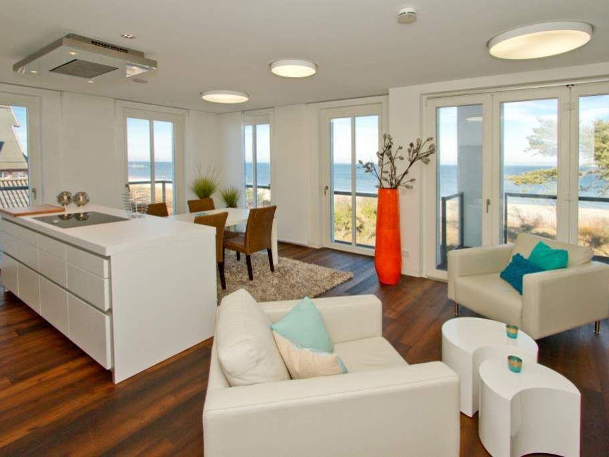 Ein perfektes Hideway direkt am Meer! Der fantastische Meerblick und das exklusive Wohnkonzept werden Sie hier begeistern. 120 qm Wohnfläche bieten Platz für 4 Personen und 2 Kleinkinder (bis 3 Jahre im Kinderreisebett). Helle Farben und ausgesuchte Materialien ergänzen das hochwertige Mobiliar und die moderne Technik (3 TVs, Ipod-Dockingsstation). Der Wohnbereich mit großer Fensterfront zum Meer und bequemer Sitzgruppe vor dem Kamin wird ergänzt durch die exklusive offene Küche (selbst ein Dampfgarer und eine Nespresso-Maschine fehlen hier nicht) mit großem Essplatz. 2 Schlafzimmer mit Boxspring-Doppelbetten (1,80 m x 2,00 m) und jeweils eigenem TV bieten besten Schlafkomfort. Auch die beiden Bäder wurden exklusiv ausgestattet. Das erste Bad verfügt über eine Badewanne und eine Dusche. Im zweiten Bad mit großer Glasdusche wurde die wohnungseigene Sauna integriert, ein Highlight, nicht nur in der kalten Jahreszeit. Zum Lieblingsplatz werden sicher schnell die Balkone mit tollem Meerblick und Blick auf den Schloonsee, hier lässt es sich ganz entspannt relaxen! Für die Kleinen können ein Kinderreisebett und ein Kinderhochstuhl (gegen Aufpreis) dazu gebucht werden. Für Ihren Komfort steht die Erstausstattung Wäsche (Bettwäsche [&] Handtücher) für Sie bereit. Einen WLAN-Zugang stellt Ihnen der Eigentümer kostenfrei zur Verfügung.