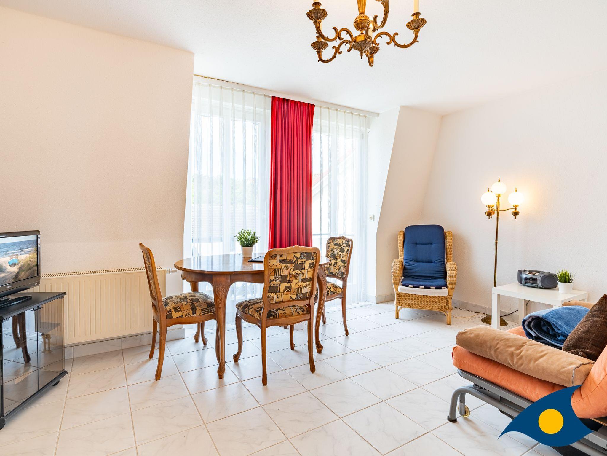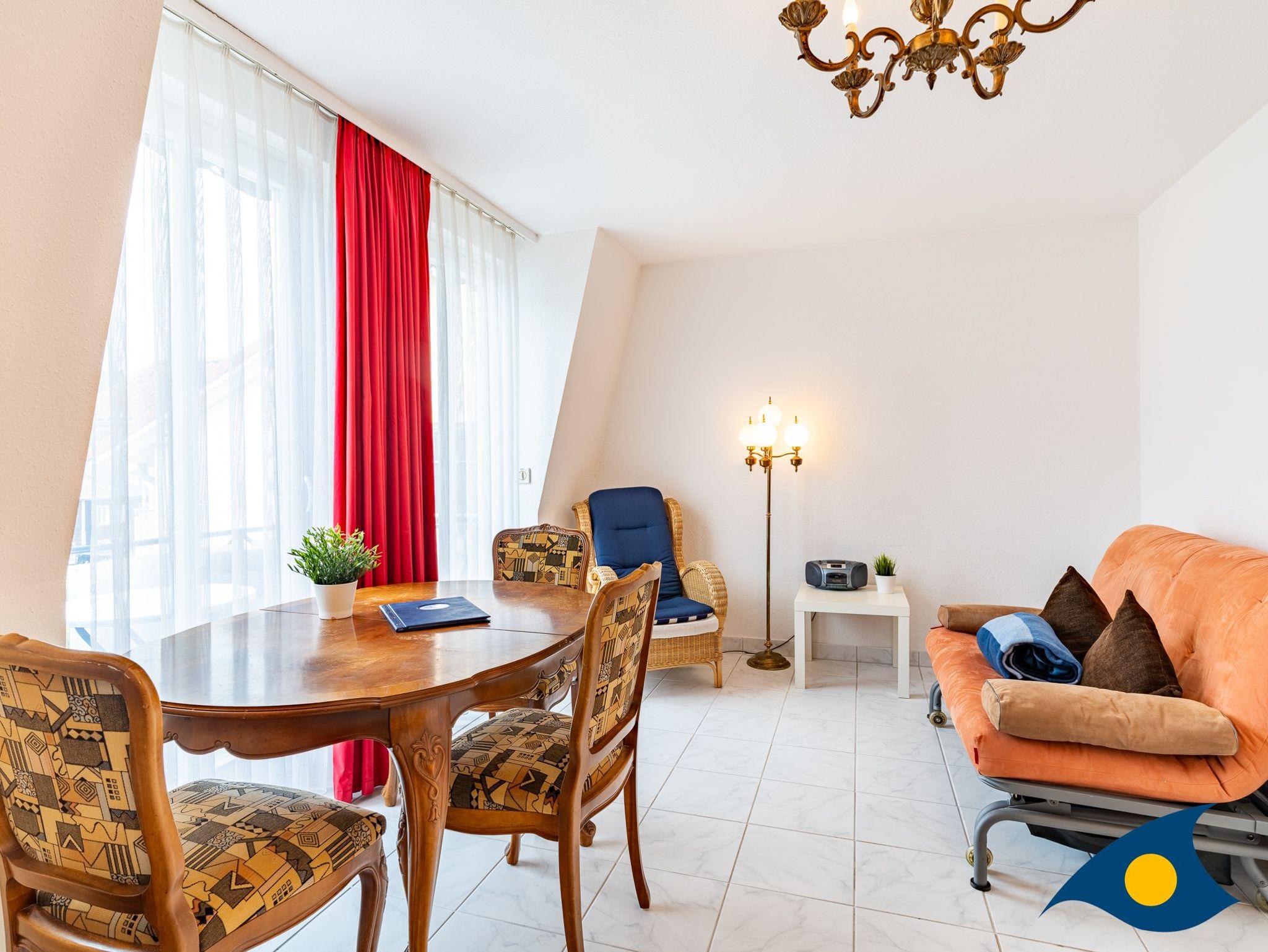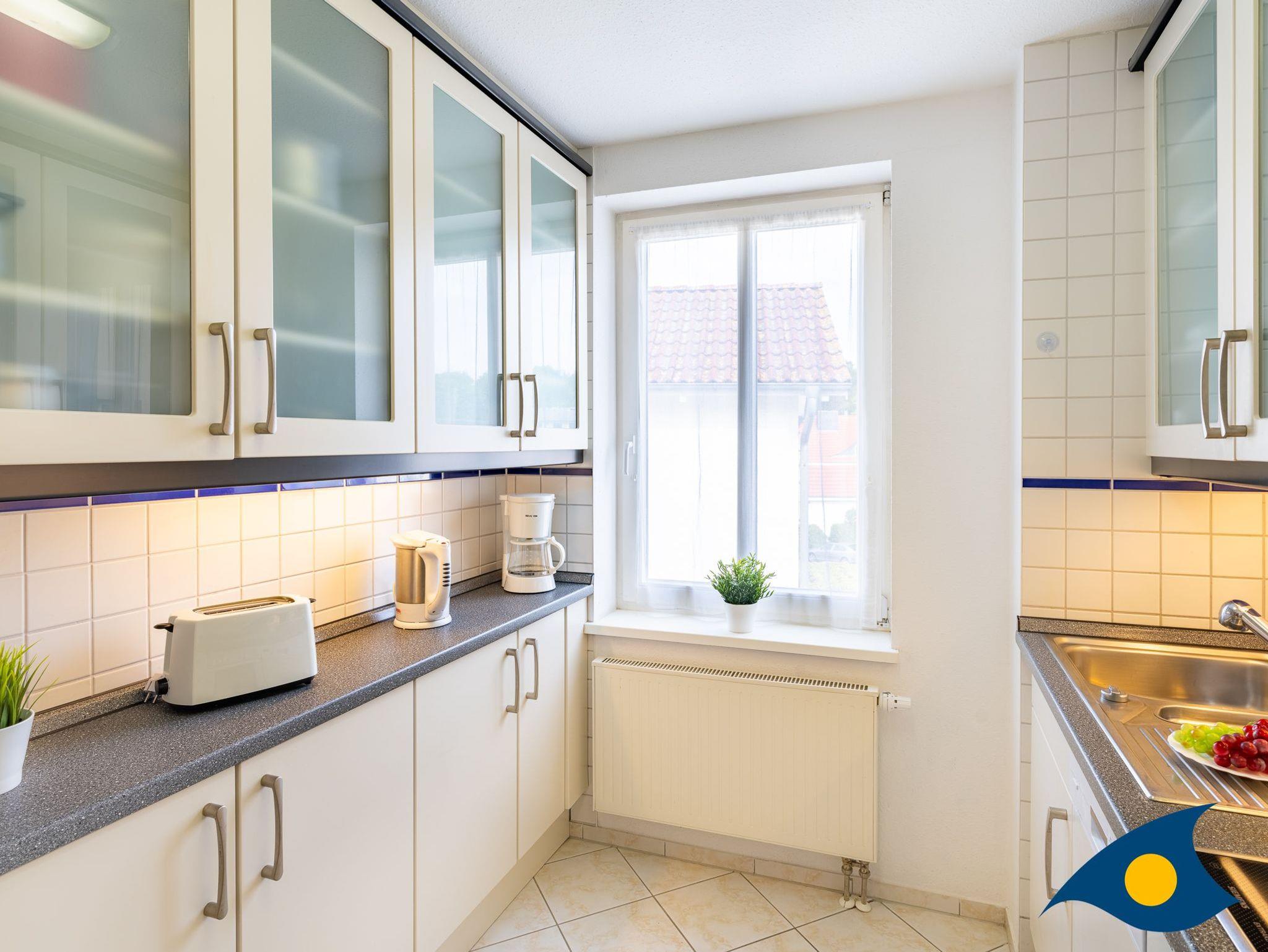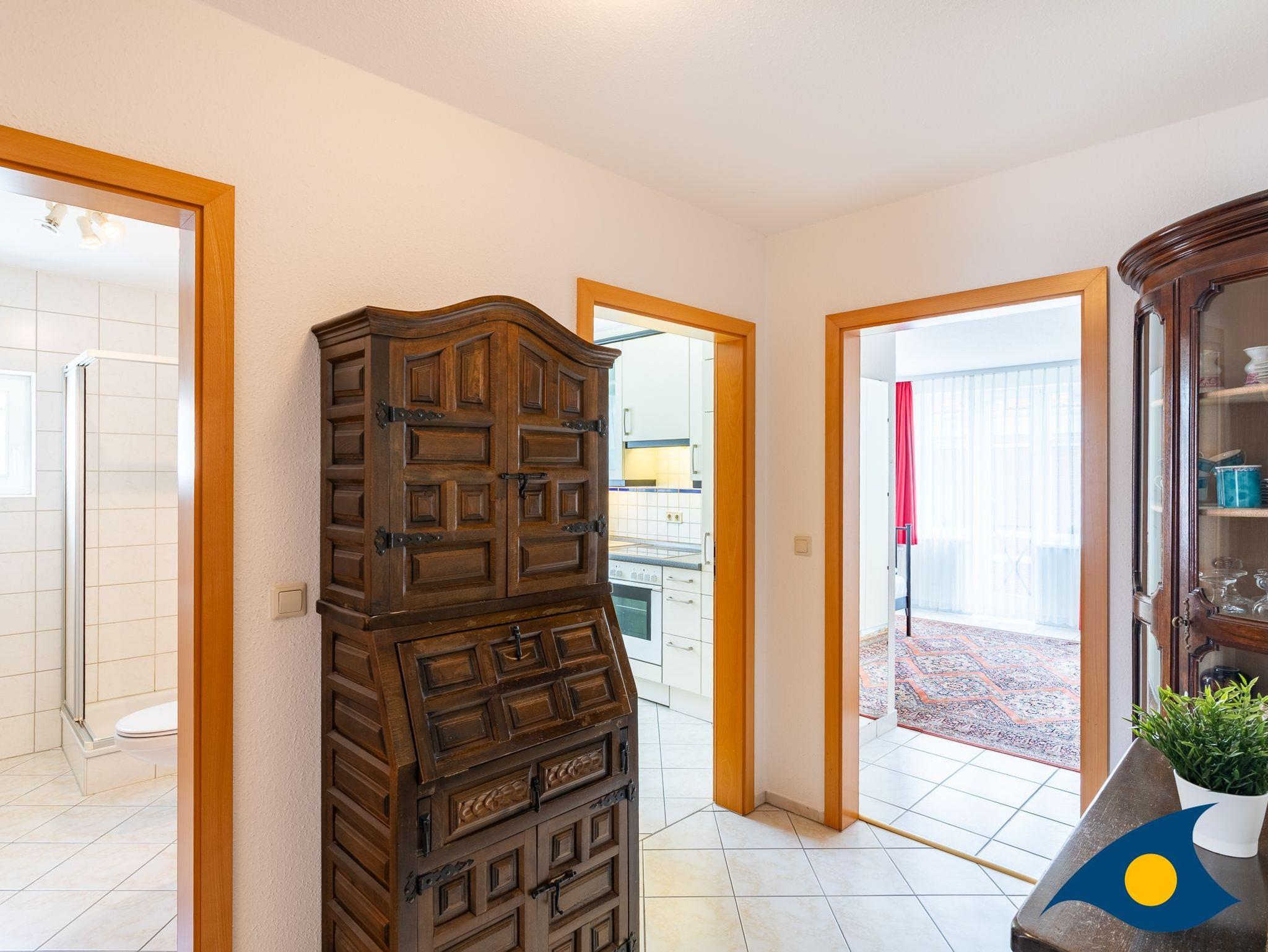 Im 2. Obergeschoss des Hauses befindet sich diese ca. 50 qm große Ferienwohnung, die Platz für bis zu 4 Personen bietet. Vom Wohnzimmer aus gelangen Sie auf den Sonnenbalkon, der mit einer Markise ausgestattet ist. Die separate Küche ist voll ausgestattet.