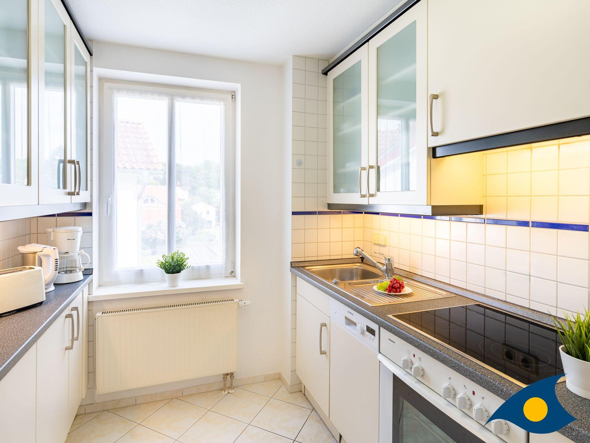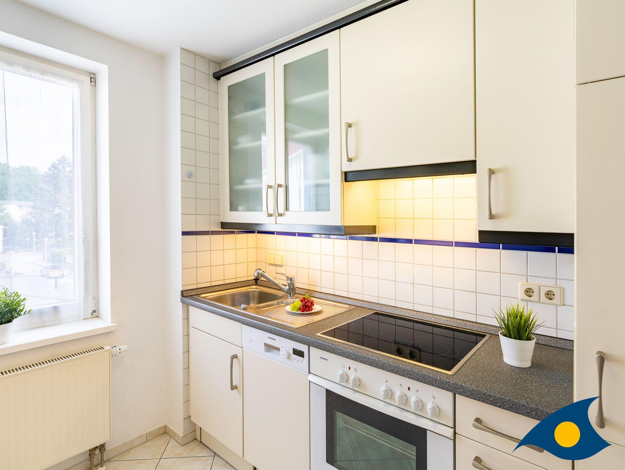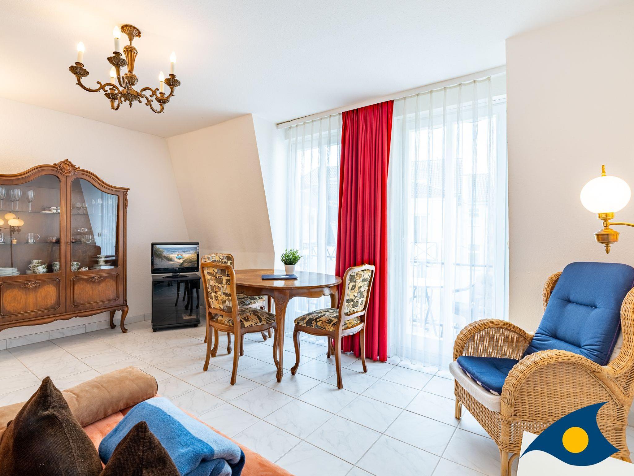 Im 2. Obergeschoss des Hauses befindet sich diese ca. 50 qm große Ferienwohnung, die Platz für bis zu 4 Personen bietet. Vom Wohnzimmer aus gelangen Sie auf den Sonnenbalkon, der mit einer Markise ausgestattet ist. Die separate Küche ist voll ausgestattet.
