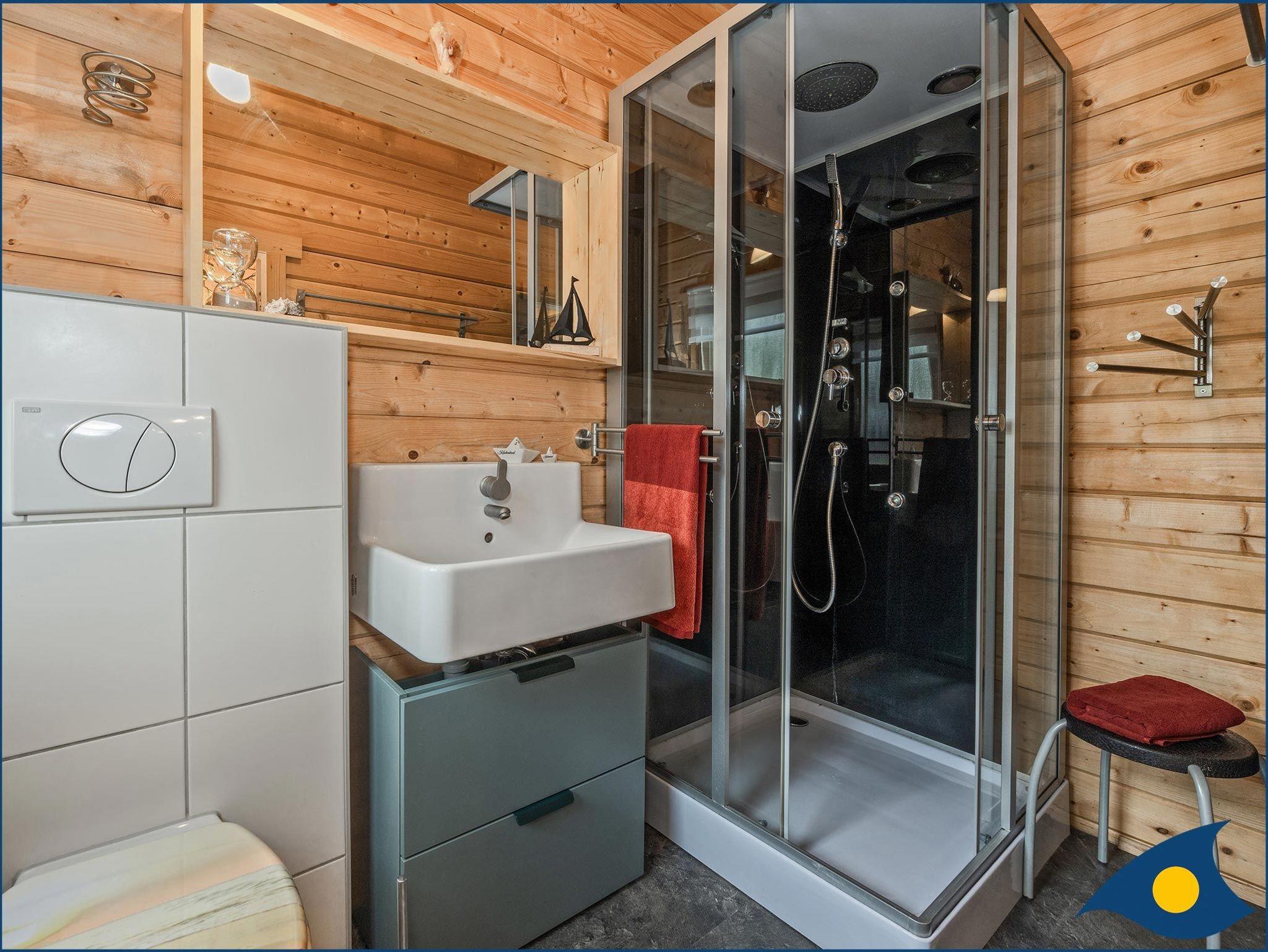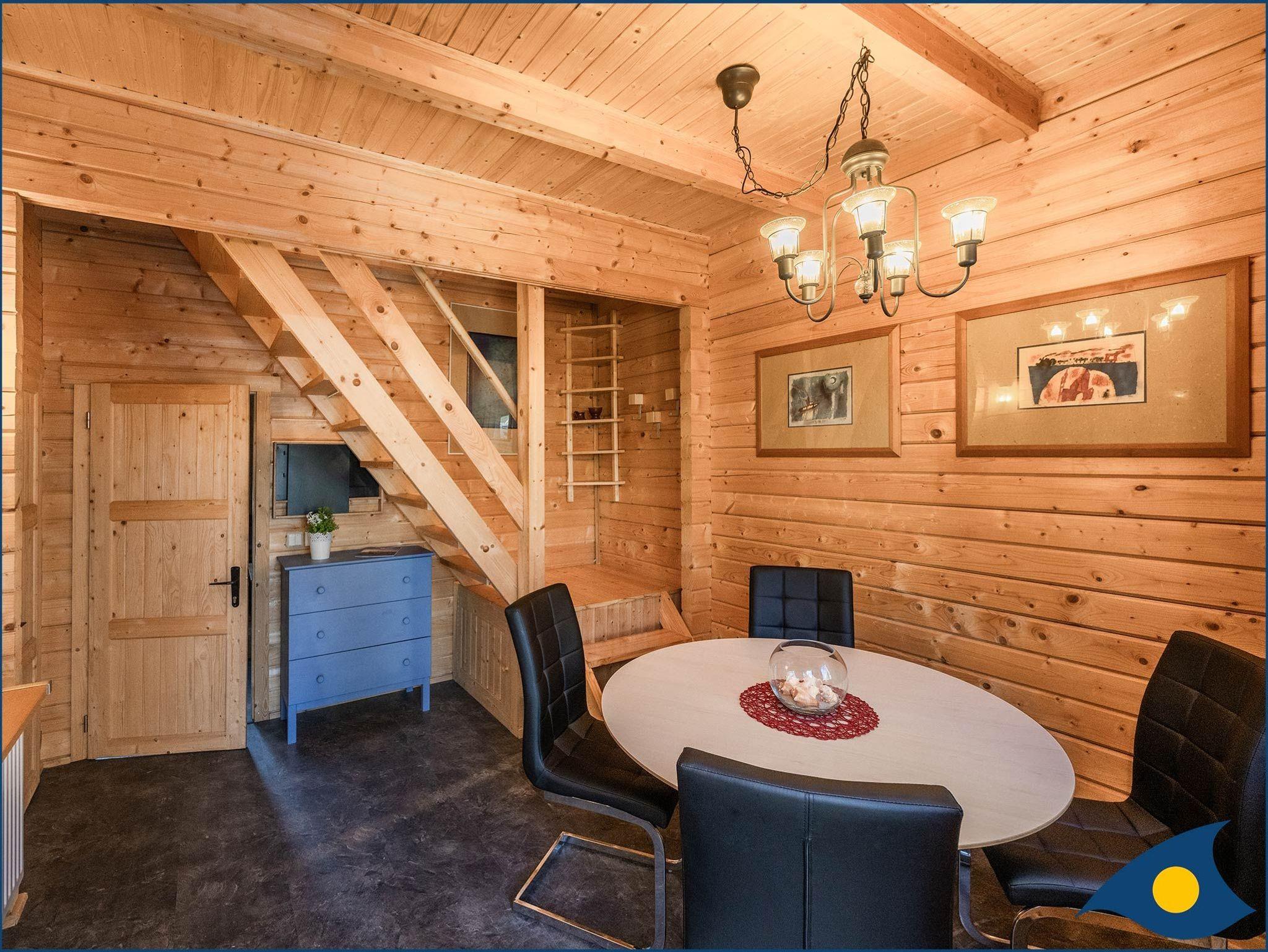 Das helle und modern ausgestattete Holzferienhaus erwartet Sie mit einer gemütlichen Sofalandschaft im Wohnbereich zum Entspannen und für gemeinsame Spiele oder Fernsehabende. Von hier gelangt man auch direkt auf die Terrasse mit großzügigem Platz zum Entspannen. Die gut ausgestattete Küchenzeile mit Cerankochfeld, Spülmaschine, Kühlschrank mit Tiefkühlfach, Mikrowelle mit Grill- und Backofenfunktion lädt zum gemeinsamen Kochen ein. Im Erdgeschoss befindet sich auch das Badezimmer mit Dusche / WC und ein kleiner HWR sowie ein Essplatz in der Diele.