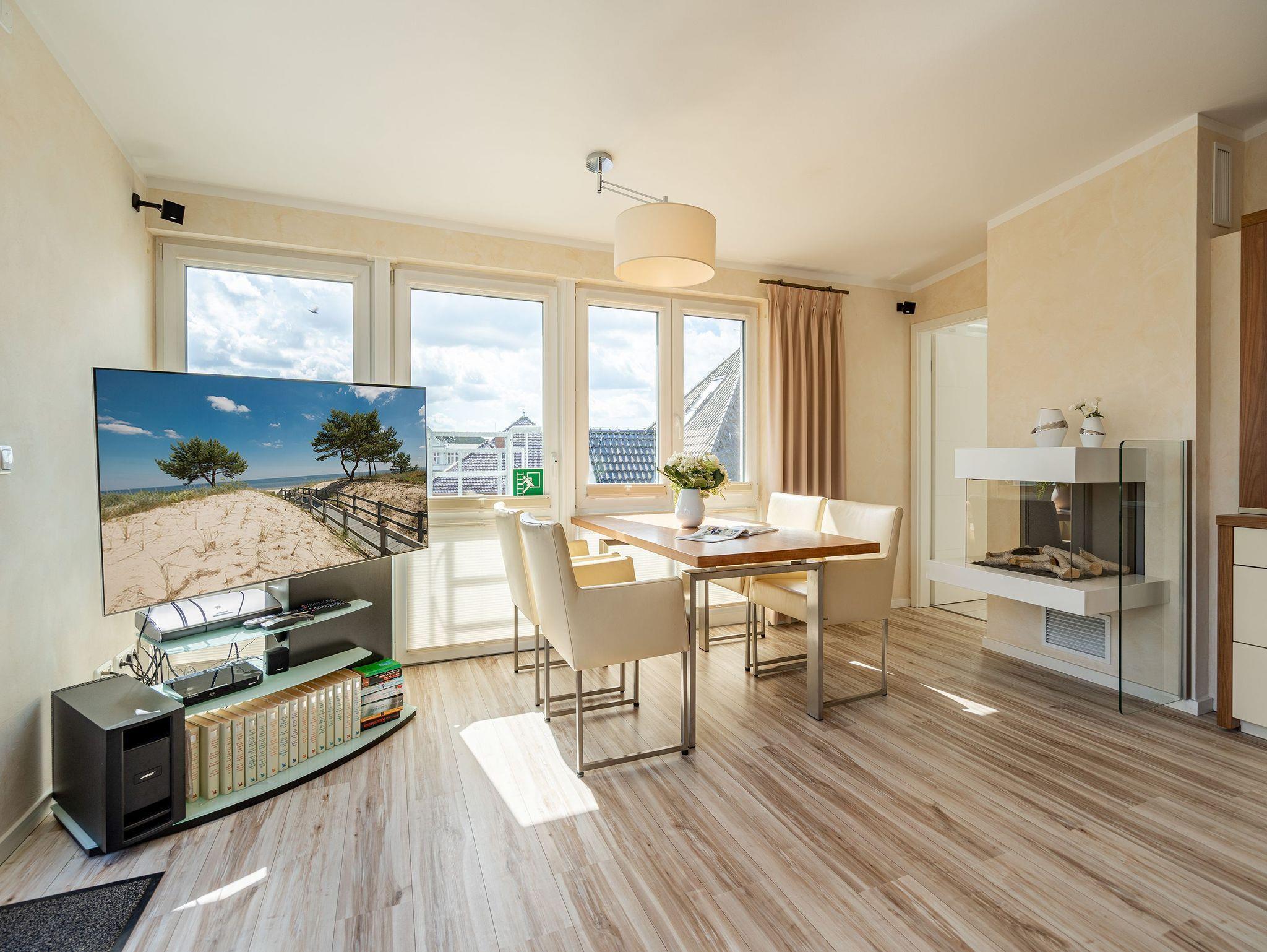Genießen Sie unvergessliche Urlaubstage in unserer modernen Penthouse-Ferienwohnung! Auf großzügigen 100 qm bietet dieses stilvolle Domizil Platz für bis zu vier Personen und überzeugt mit einer exklusiven Ausstattung. Der lichtdurchflutete Wohnbereich lädt mit einer gemütlichen Couch, einer eleganten Chaiselongue und einem per Fernbedienung steuerbaren Gaskamin zu entspannten Stunden ein. Ein Flat-TV mit Heimkino sorgt für beste Unterhaltung. Die offene, komplett ausgestattete Küche mit angrenzendem Essbereich macht gemeinsame Mahlzeiten zum Genuss. Zwei komfortable Schlafzimmer mit Doppelbetten (1,80 x 2,00 m) versprechen erholsamen Schlaf. Neben einem modernen Bad mit Echtglasdusche und eigener Trockensauna steht Ihnen ein weiteres Duschbad zur Verfügung. Ein besonderes Highlight ist die großzügige Dachterrasse mit gemütlicher Sitzecke und Sonnenliegen, von der aus Sie den Blick in Richtung Meer genießen können. Ihr Pkw ist auf dem Stellplatz direkt am Haus bestens aufgehoben, und für Ihre Fahrräder gibt es einen abschließbaren individuellen Keller. Ein eigener Waschtrockner in der Wohnung sowie kostenfreies WLAN runden das komfortable Angebot ab. Freuen Sie sich auf eine Auszeit in einer stilvollen Ferienwohnung, die keine Wünsche offenlässt!