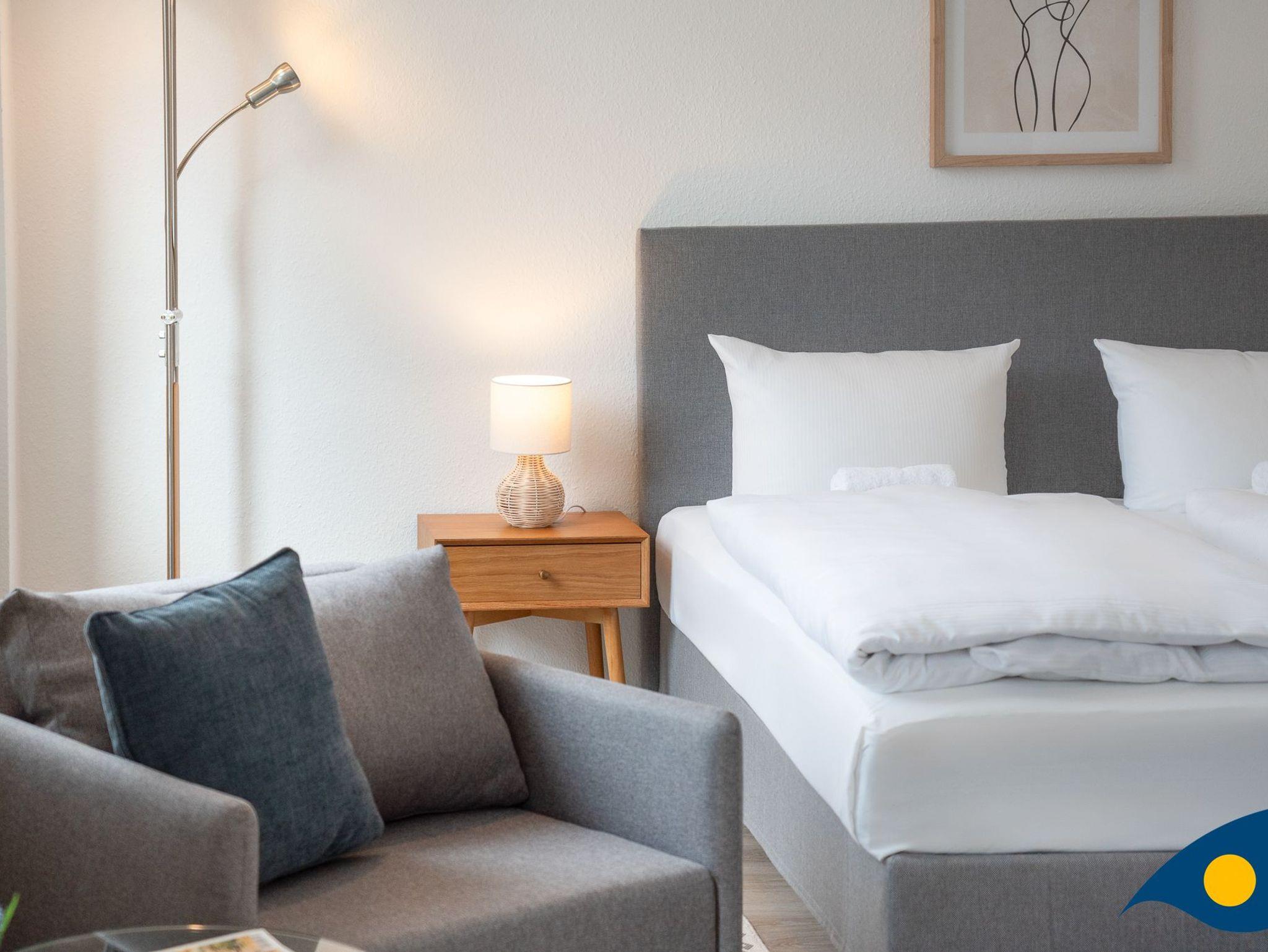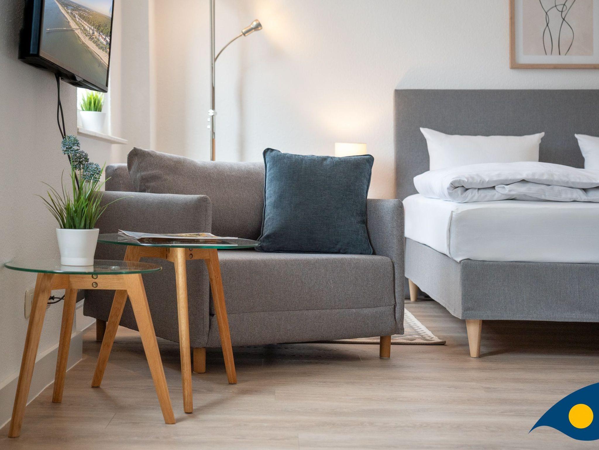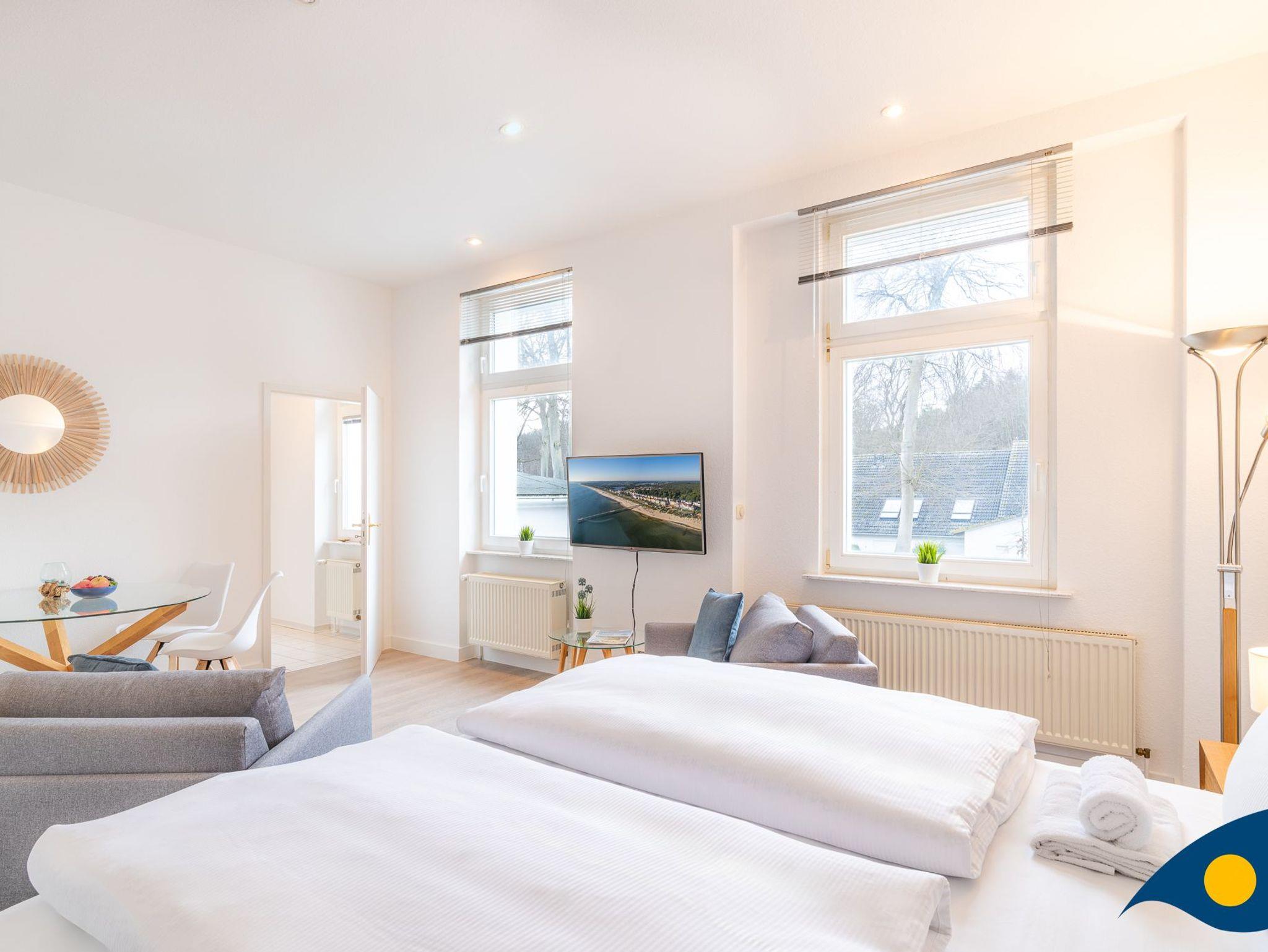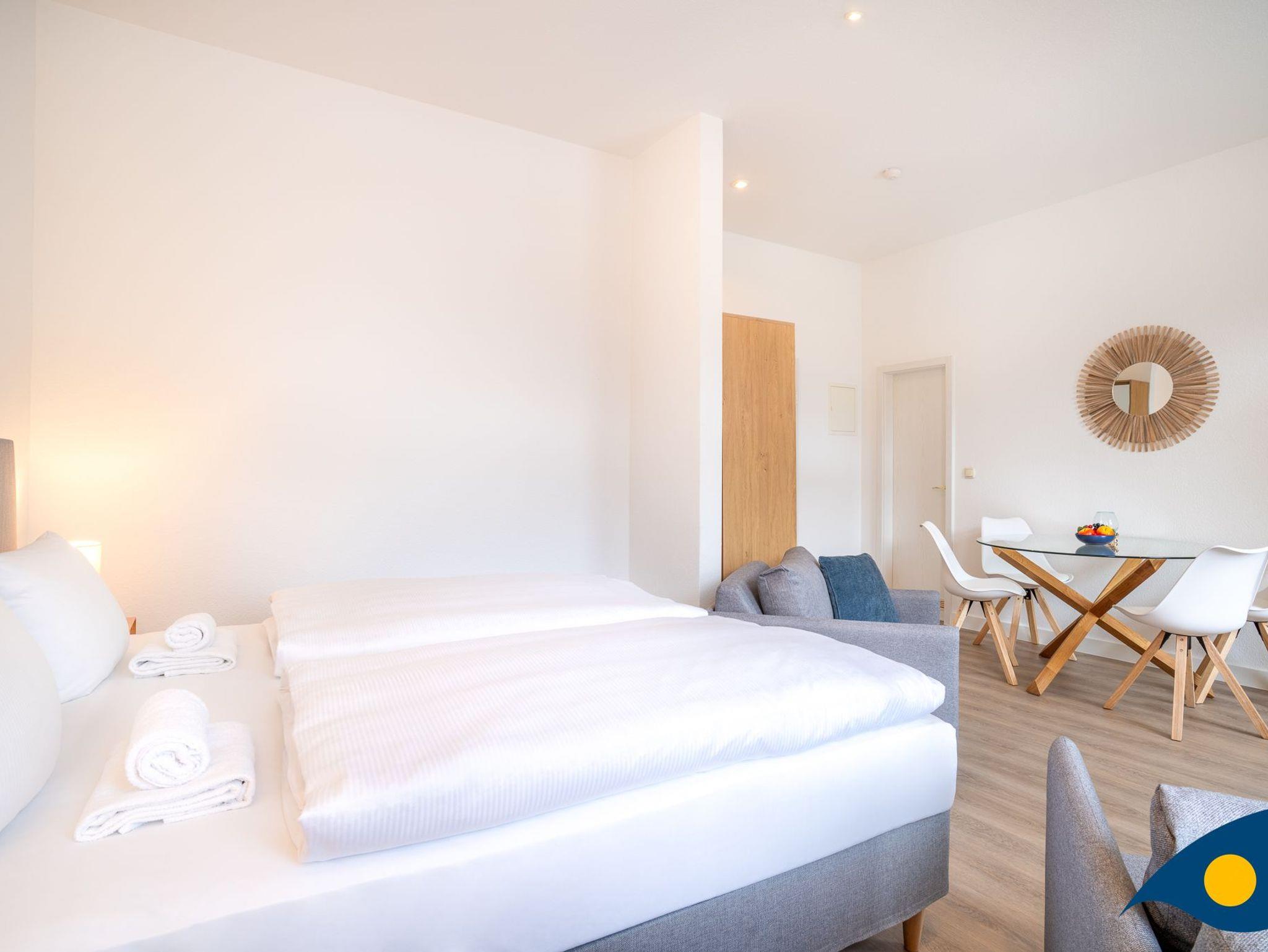 Der einladende Wohn- und Schlafbereich ist mit einem komfortablen Boxspringbett für zwei Personen ausgestattet und lädt mit zwei Sesseln, sowie einem Essbereich mit großem Glastisch zum Verweilen ein. Für Unterhaltung sorgt ein modernes TV-Gerät. Ideal für eine romantische Auszeit zu zweit oder für einen Solo-Trip.