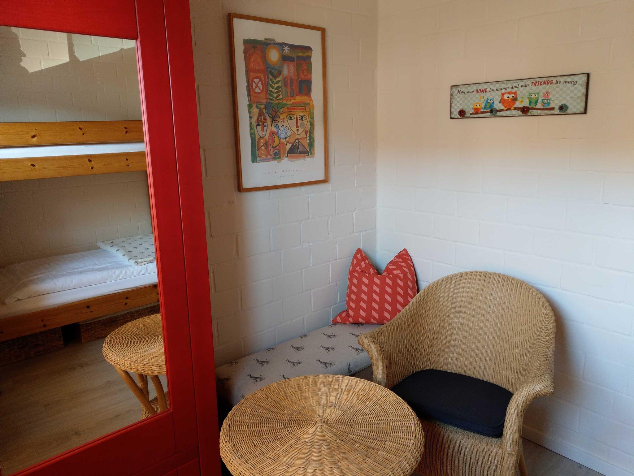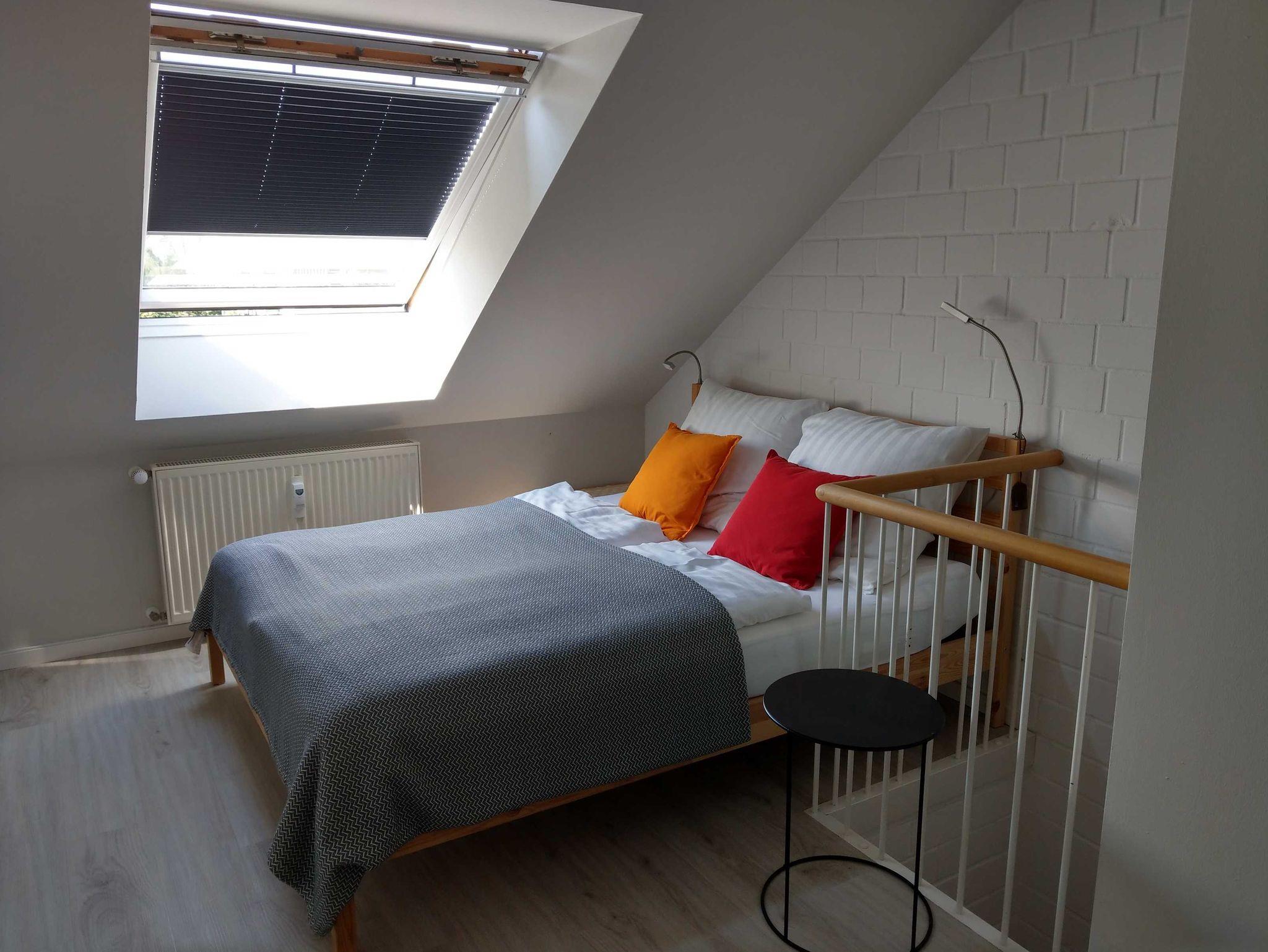 Im Dachgeschoss befindet sich ein Doppelbett, Fernseher, Kleiderschrank und eine kleine Sitzecke.