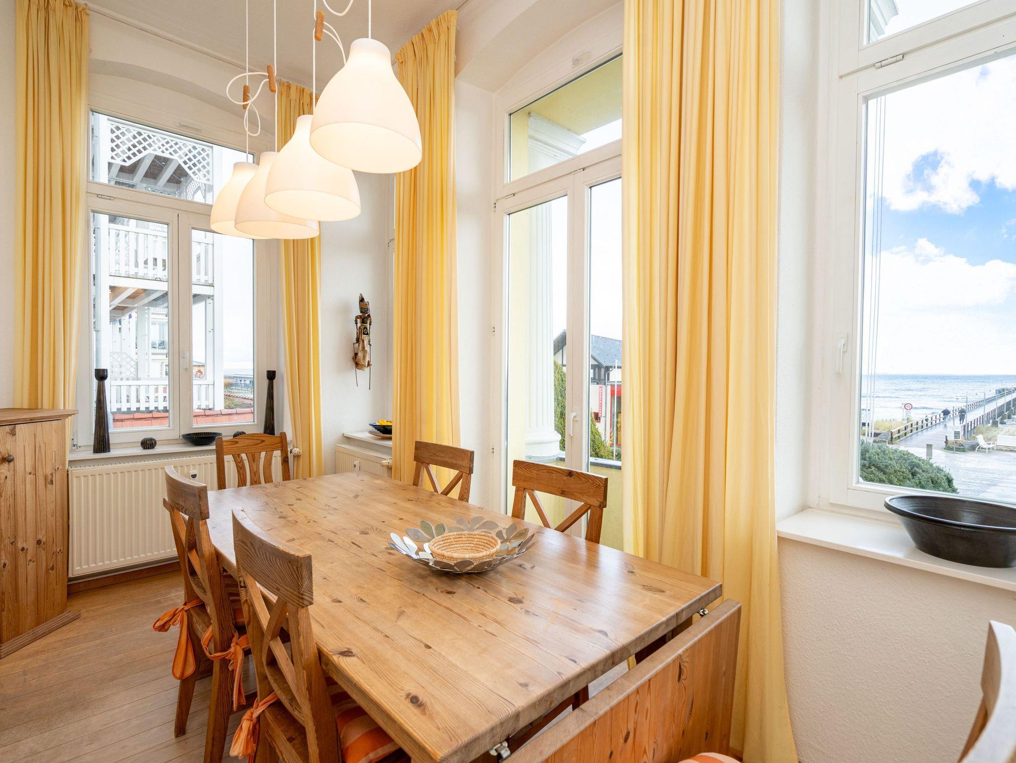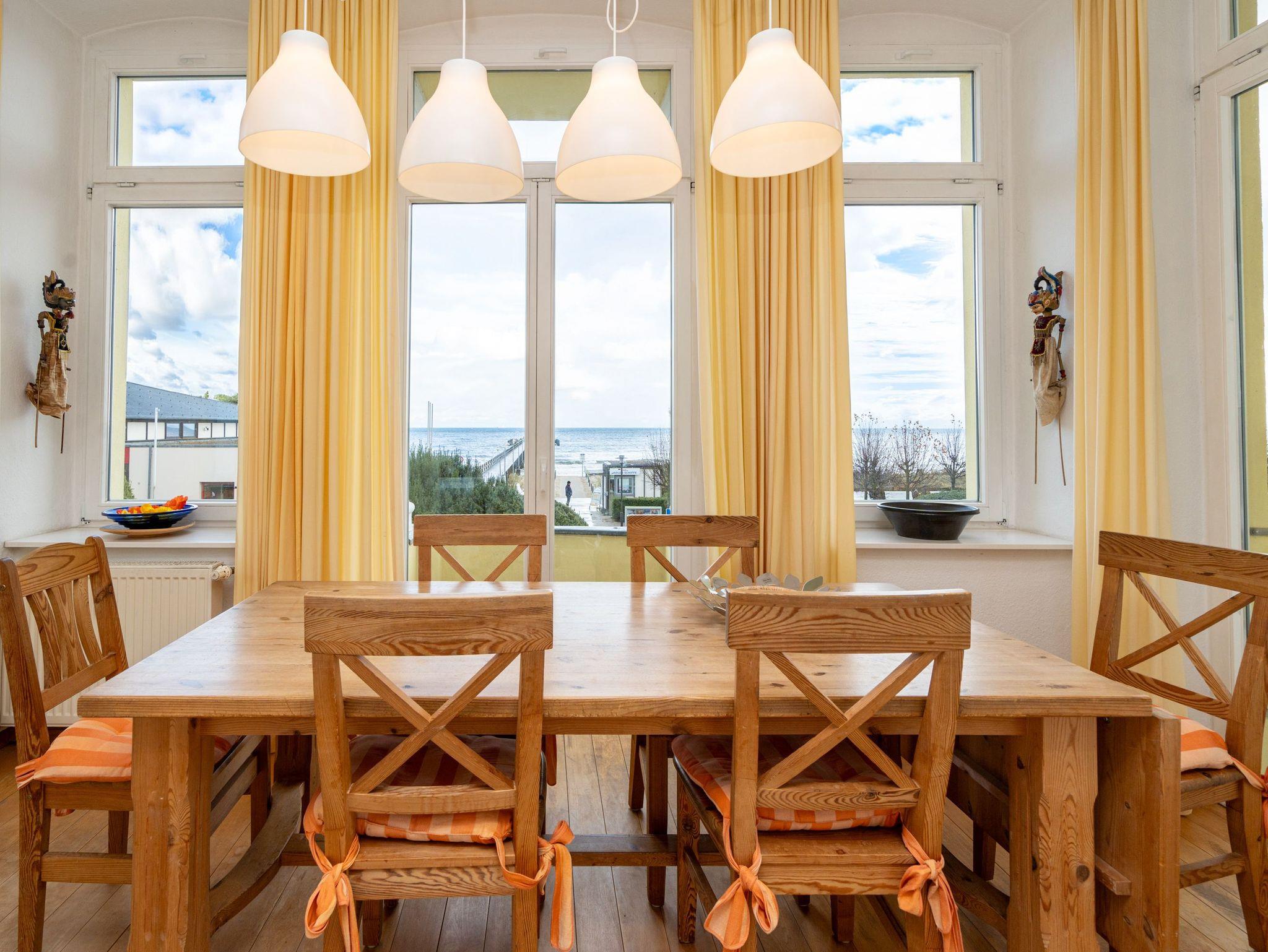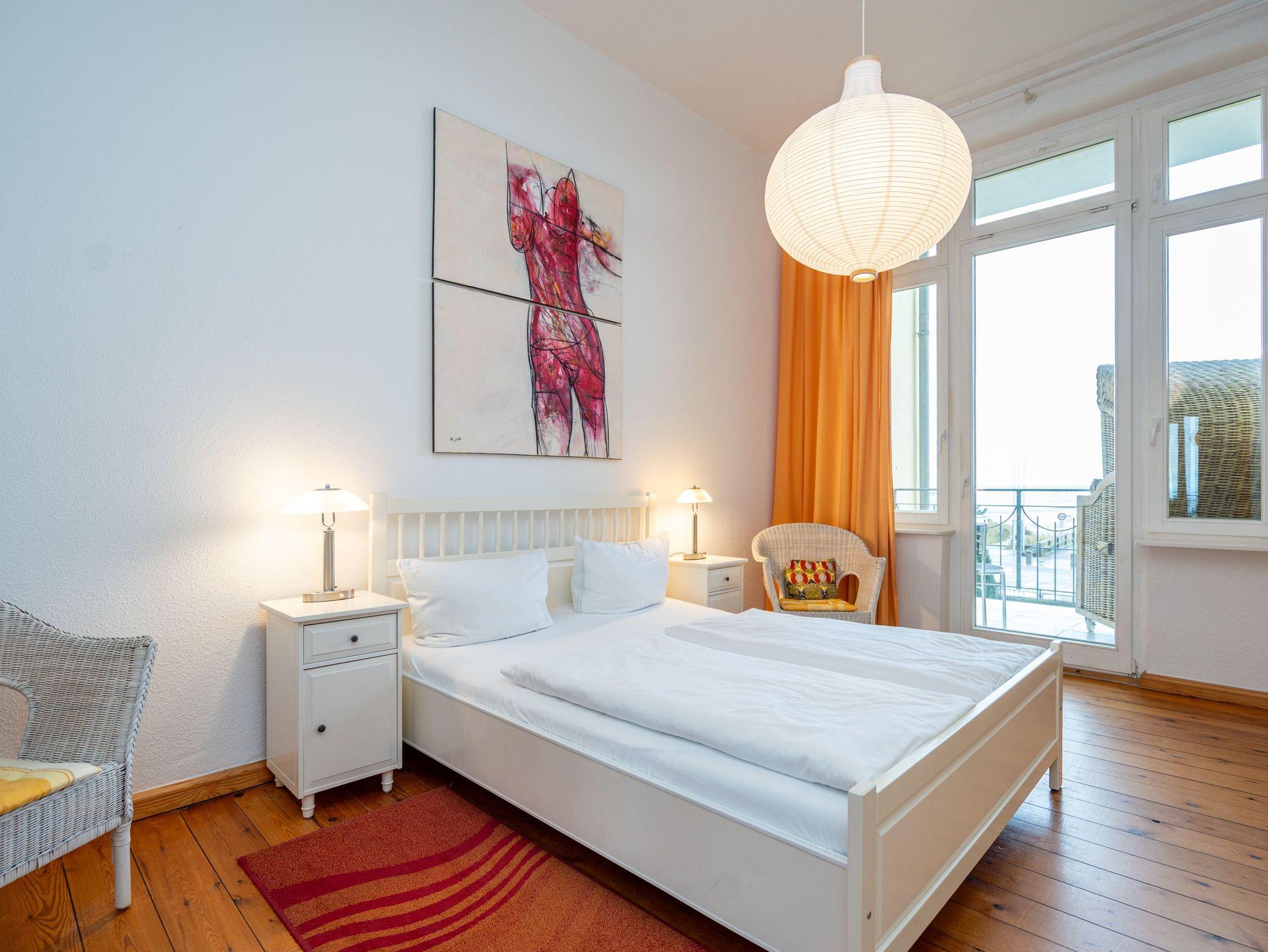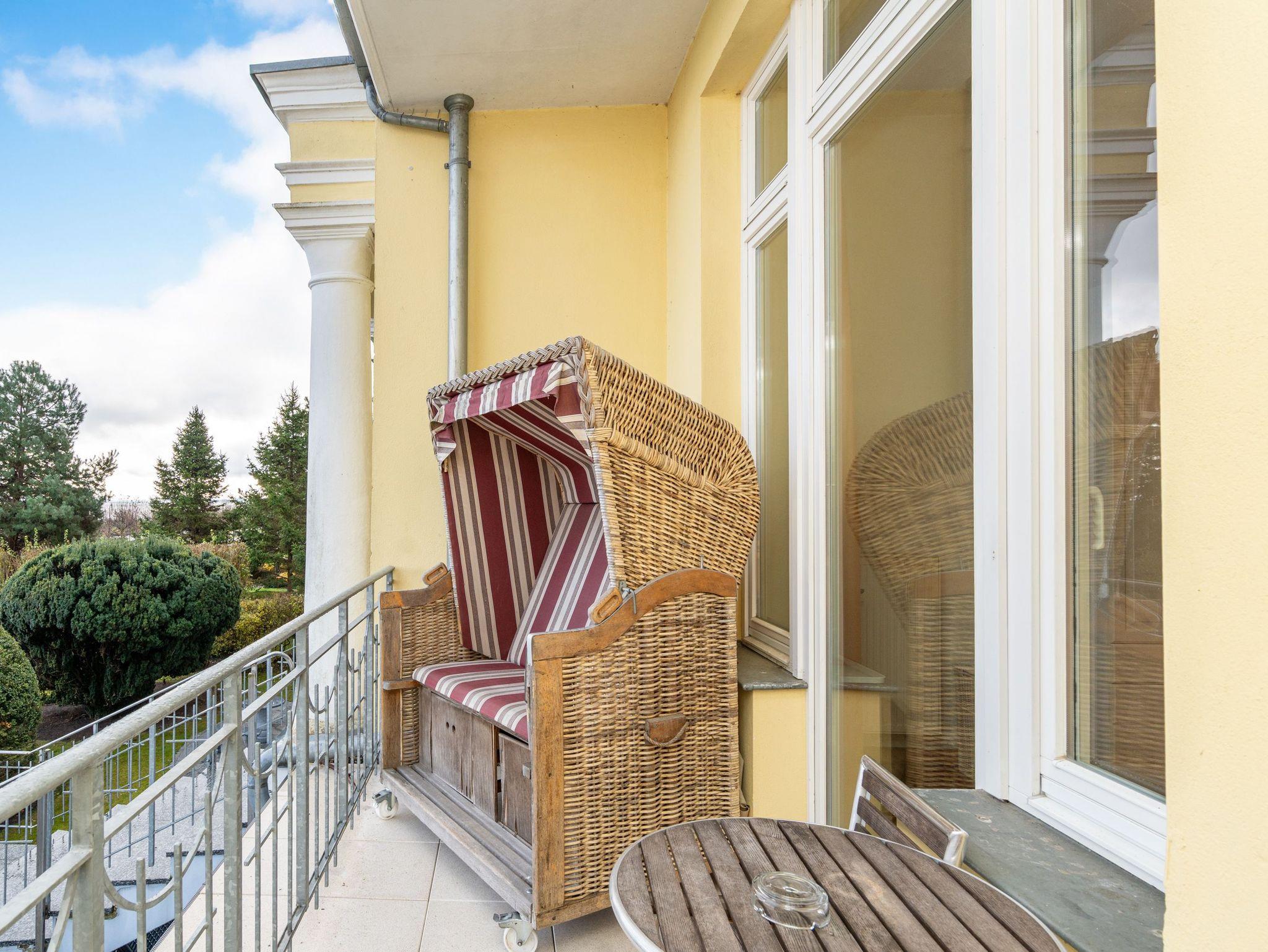 Die großzügige, lichtdurchflutete Ferienwohnung im Hochparterre der Villa bietet Platz für bis zu vier Personen und ein Kleinkind bis 3 Jahre. Von hier genießen Sie einen fantastischen Blick auf die Ostsee. Das geschmackvoll eingerichtete Appartement verfügt über ein Wohnzimmer mit verglaster Veranda, eine komplett ausgestattete Küche, zwei Schlafzimmer (ein Schlafzimmer mit Doppelbett, eines mit zwei Einzelbetten) sowie ein Bad mit Badewanne, Dusche und Waschmaschine. Der zur Ostsee ausgerichtete Balkon mit Strandkorb lädt zum Verweilen ein. Für Kleinkinder kann auf Wunsch ein Babyreisebett ohne zusätzliche Matratze sowie ein Hochstuhl gegen Gebühr bereitgestellt werden.
