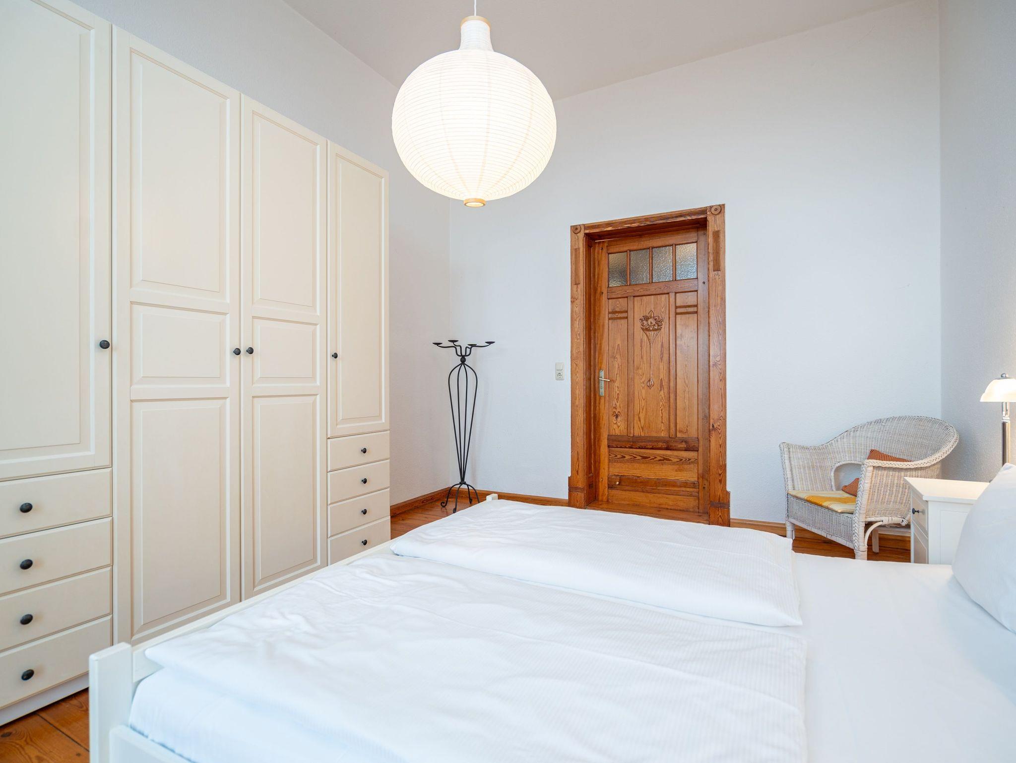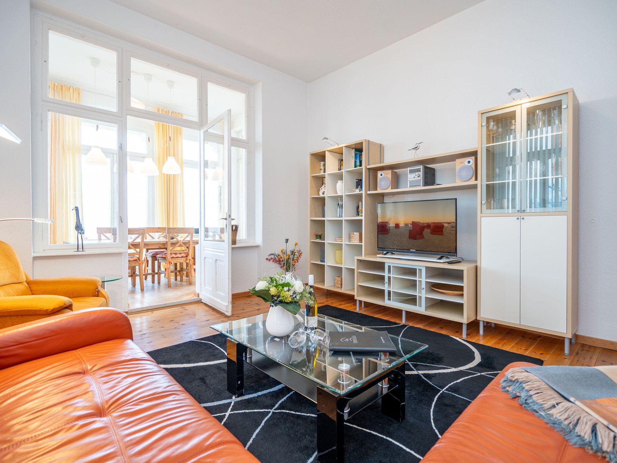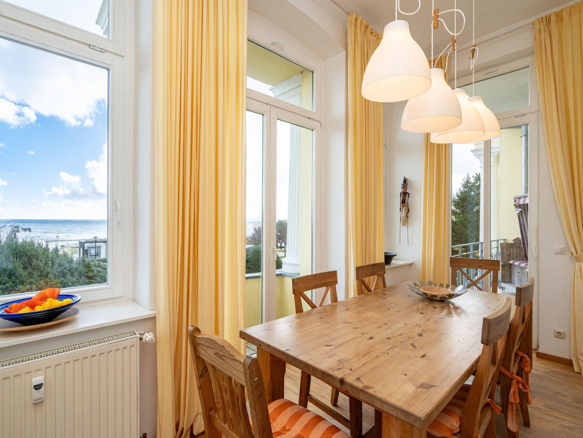 Die großzügige, lichtdurchflutete Ferienwohnung im Hochparterre der Villa bietet Platz für bis zu vier Personen und ein Kleinkind bis 3 Jahre. Von hier genießen Sie einen fantastischen Blick auf die Ostsee. Das geschmackvoll eingerichtete Appartement verfügt über ein Wohnzimmer mit verglaster Veranda, eine komplett ausgestattete Küche, zwei Schlafzimmer (ein Schlafzimmer mit Doppelbett, eines mit zwei Einzelbetten) sowie ein Bad mit Badewanne, Dusche und Waschmaschine. Der zur Ostsee ausgerichtete Balkon mit Strandkorb lädt zum Verweilen ein. Für Kleinkinder kann auf Wunsch ein Babyreisebett ohne zusätzliche Matratze sowie ein Hochstuhl gegen Gebühr bereitgestellt werden.
