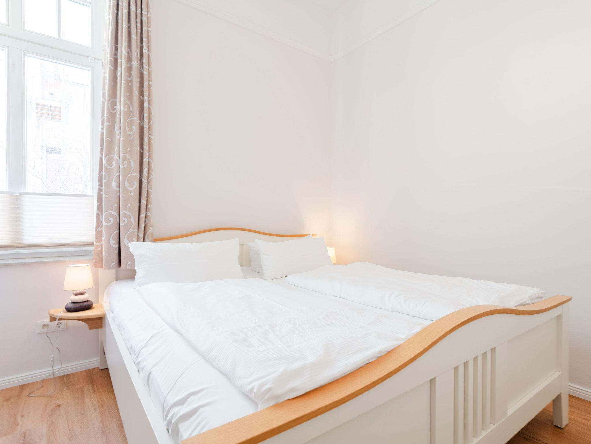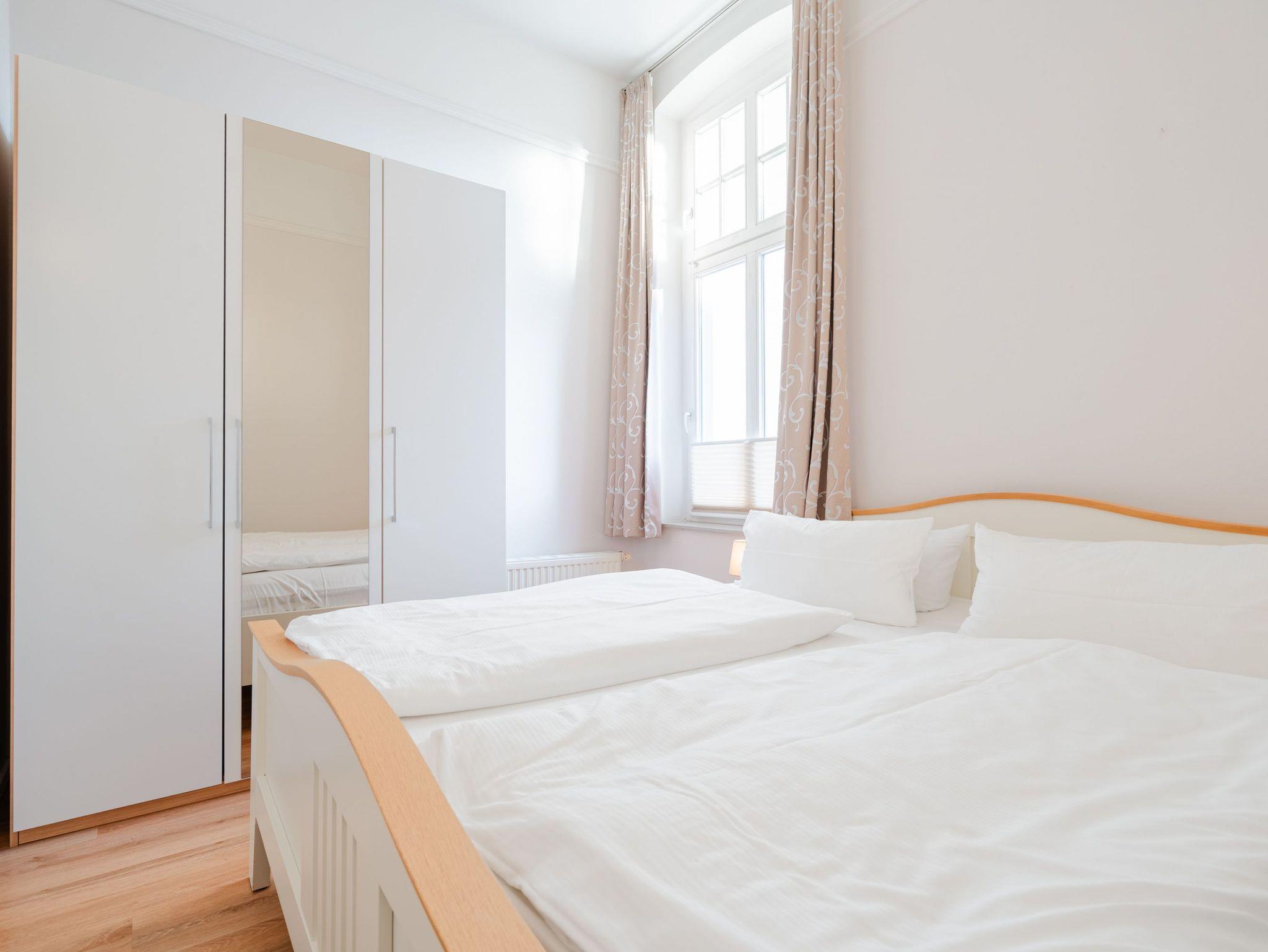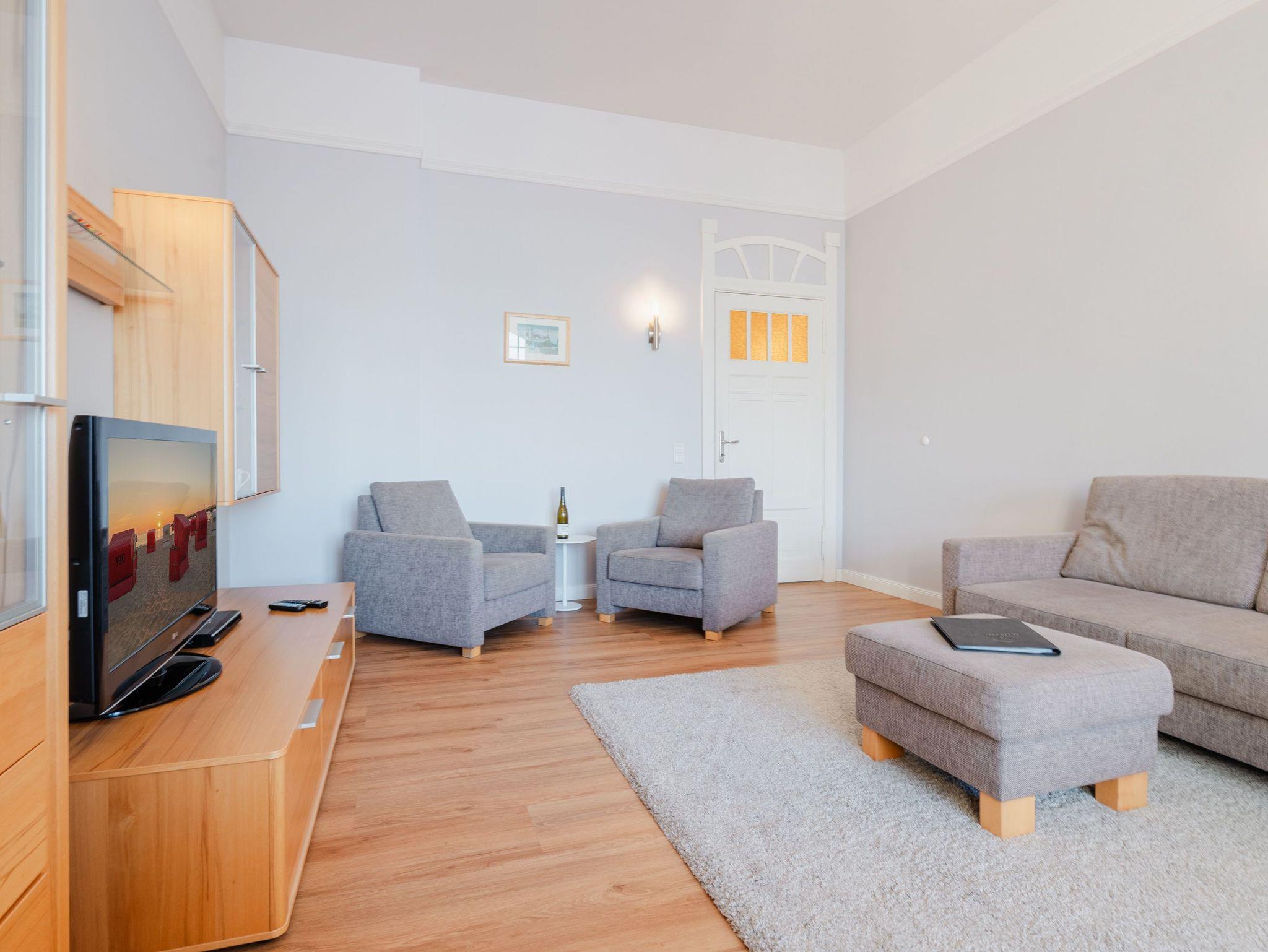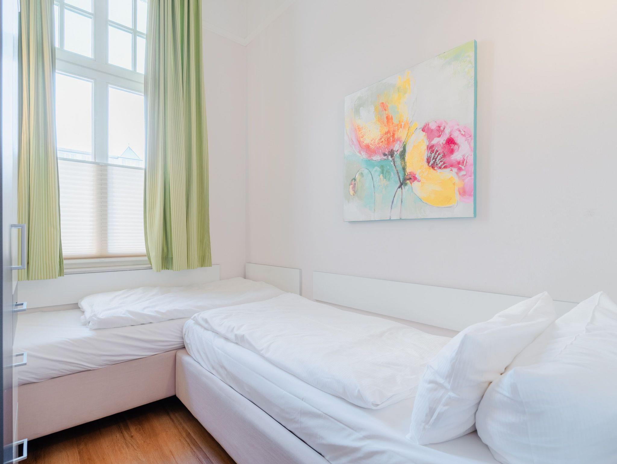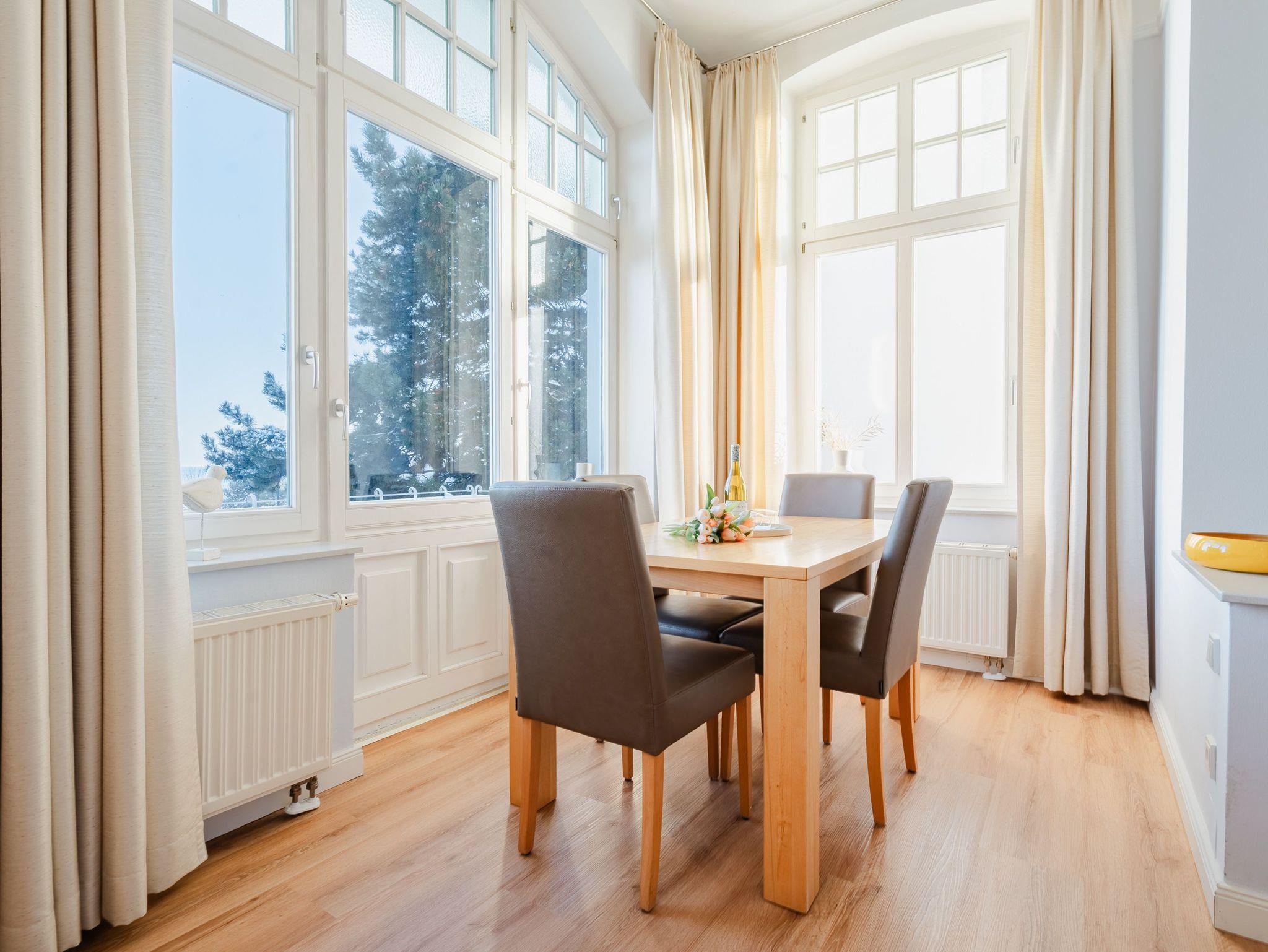 Ostsee wohin das Auge reicht. Die Ferienwohnung 6 empfängt Sie im 1. Obergeschoss der Villa und offeriert Ihnen einen klassischen, gemütlichen Wohnstil. Der Wohnbereich ist mit einem Essplatz ausgestattet und geht in eine offene Veranda mit Fernsehbereich und Balkon über. Dieses Domizil bietet 2- 4 Personen Platz für den Urlaub. Sie finden hier zwei Schlafzimmer, eines mit Doppelbett (1,60m x 2,00m) und ein zweites kleines Schlafzimmer mit zwei einzelnen Schlafkojen (2x 1,80m x 0,80m - ideal für Kinder). Für Ihren Komfort sind die Betten bei der Anreise bezogen und Handtücher liegen bereit (Erstausstattung). Das Bad bietet zwei Waschbecken, Dusche und Föhn. Ein Pkw-Stellplatz steht in einer Garage in der hinteren Bergstraße zur Verfügung.