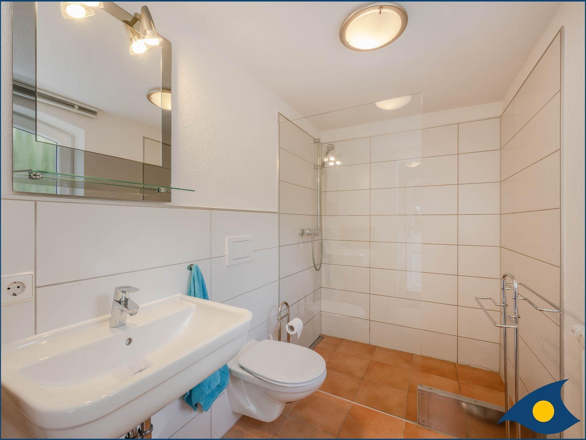 Das moderne Badezimmer mit kleinem Fenster verfügt über ein WC, ein Handwaschbecken sowie eine geräumige Walk-In-Dusche.