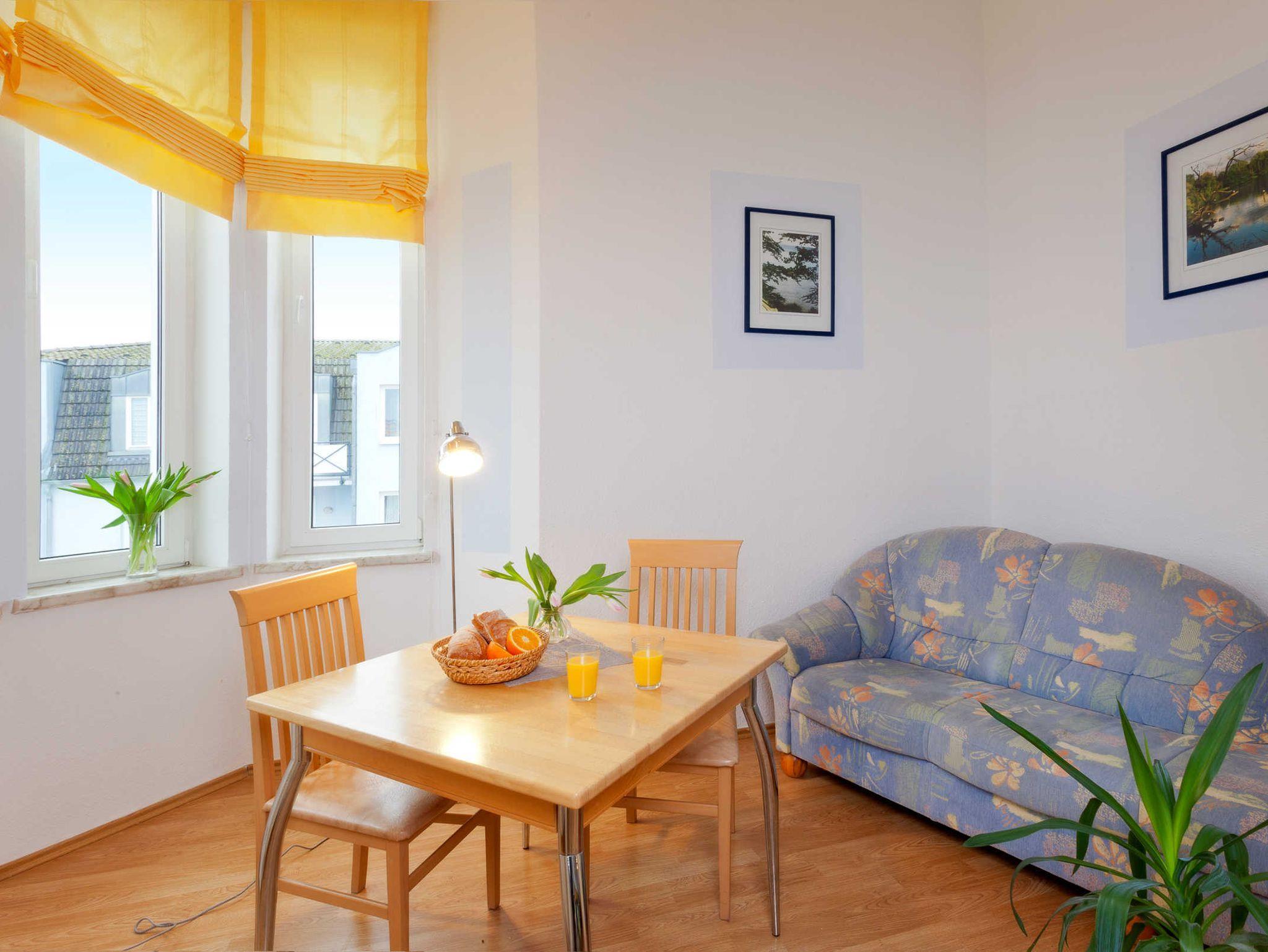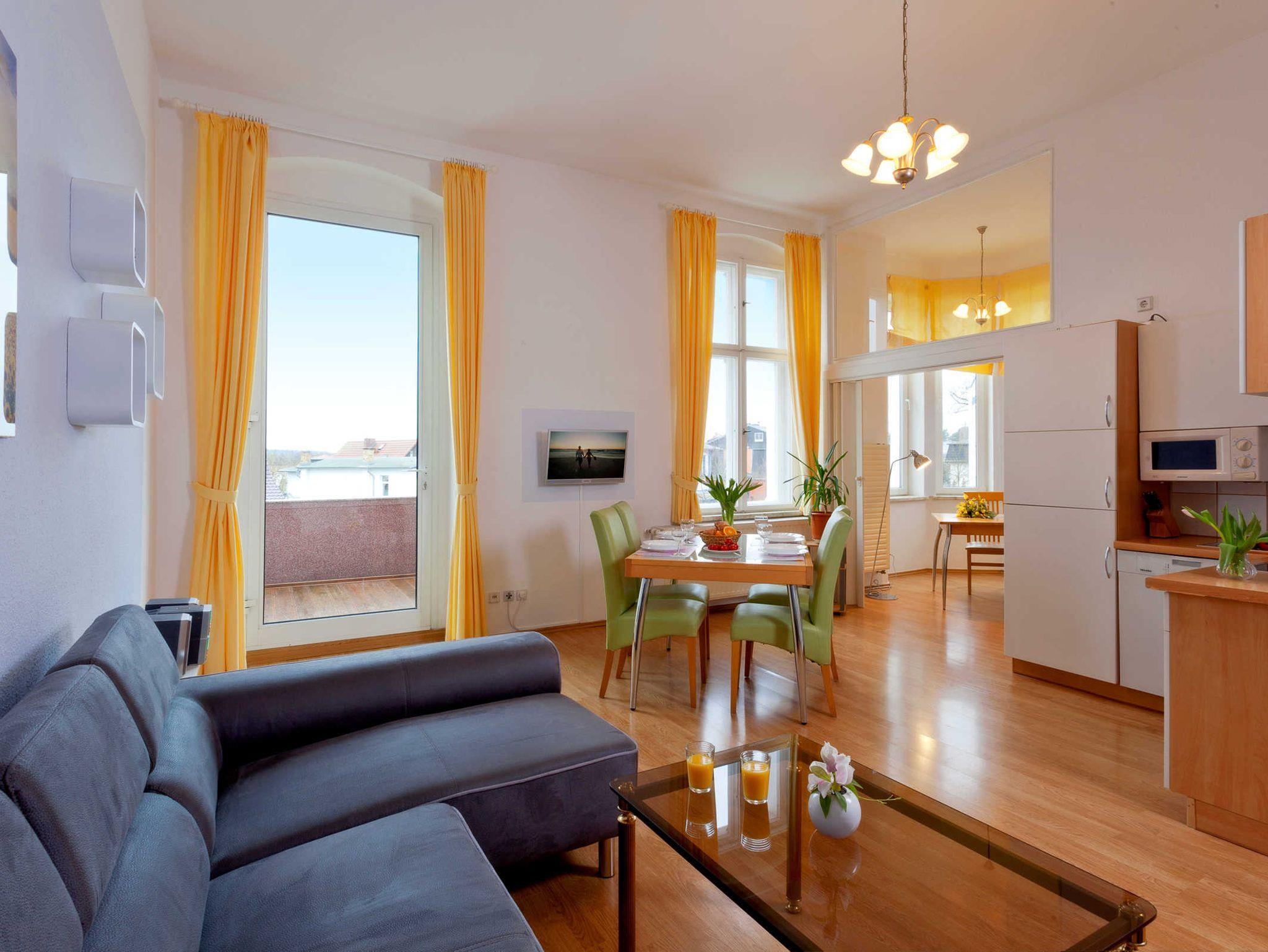 Das Wohnzimmer integriert eine Küchenzeile mit Sitzgelegenheiten, eine gemütliche Couchecke und einen 5 m² großen Südbalkon. Der sonnendurchflutete Erker lädt zum Wohlfühlen und Entspannen ein. Die zwei Schlafzimmer sind nordöstlich gelegen und verfügen über 1.60 m große Komfortbetten.