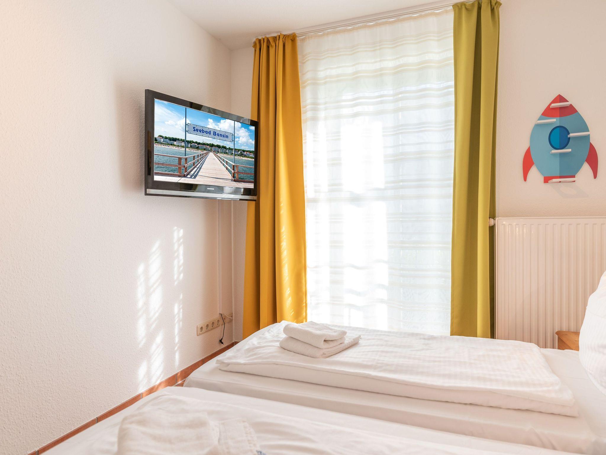 Für erholsame Nächte bietet das Schlafzimmer ein komfortables Doppelbett. Das Kinderzimmer ist mit zwei Einzelbetten und einem eigenen TV ausgestattet der perfekte Rückzugsort für die Kleinen. Das Tageslichtbad lädt mit einer Dusche und Badewanne zum Entspannen ein.