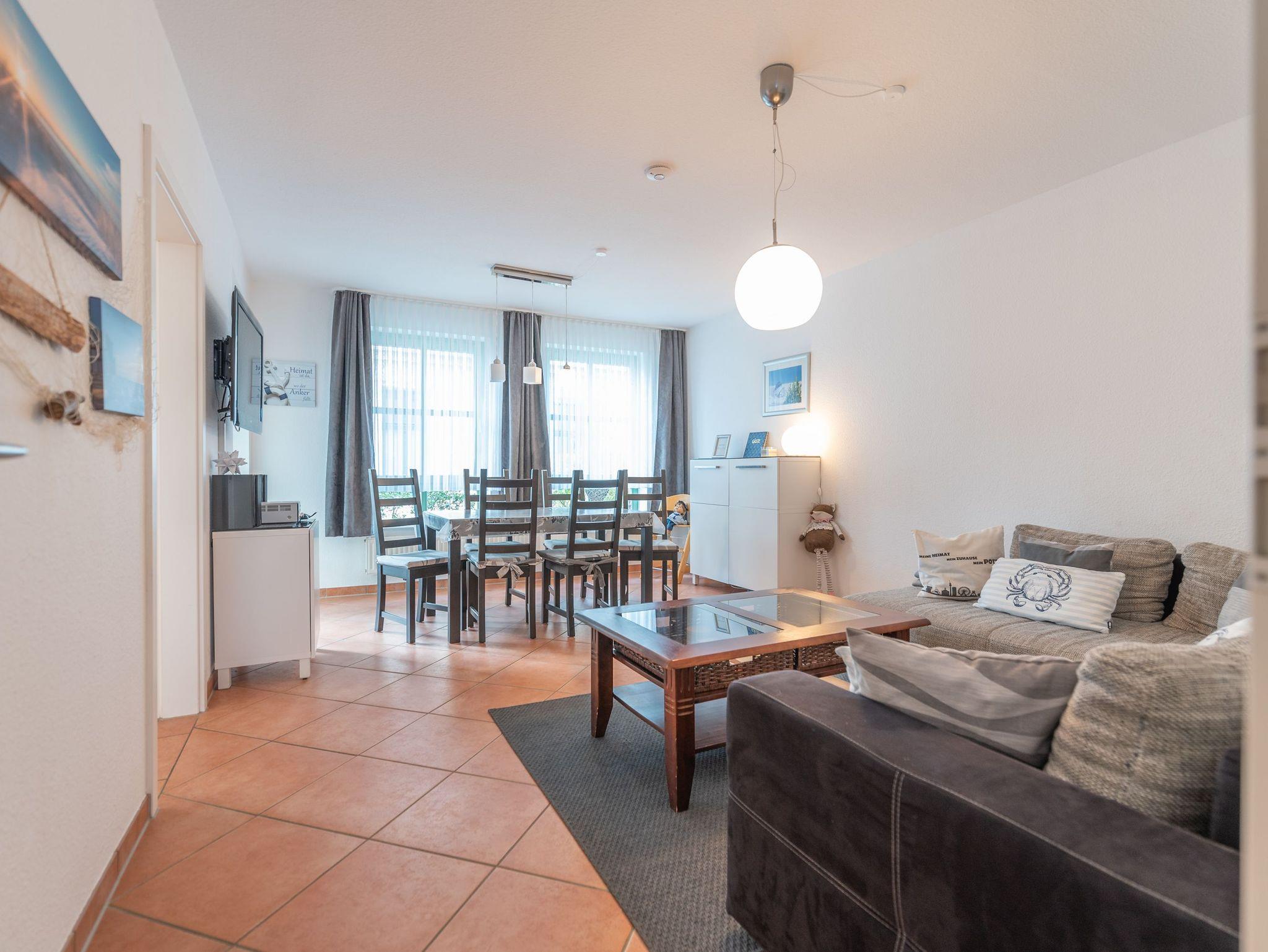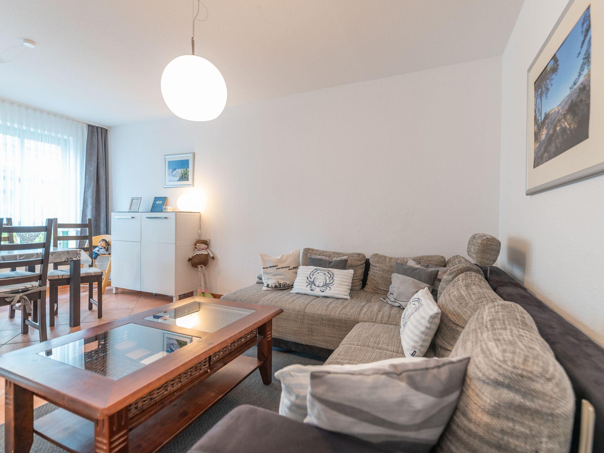 Der gemütliche Wohn- und Essbereich ist mit einer Couch, die sich bei Bedarf in ein zusätzliches Bett verwandeln lässt, einem Esstisch mit sechs Stühlen sowie TV, Radio und DVD-Player ausgestattet. Ein Kinderhochstuhl (Trip Trapp) ist ebenfalls vorhanden, und ein Babyhochstuhl kann auch genutzt werden. Zusätzlich gibt es noch einen Flaschensterilisator, ein Abtropfgestell dazu und einen Babybadewanne. Die Küche lässt keine Wünsche offen und verfügt über eine Spülmaschine, Mikrowelle, Kaffeemaschine, Senseomaschine, Toaster, Eierkocher, Kühl-Gefriergerät und E-Herd.