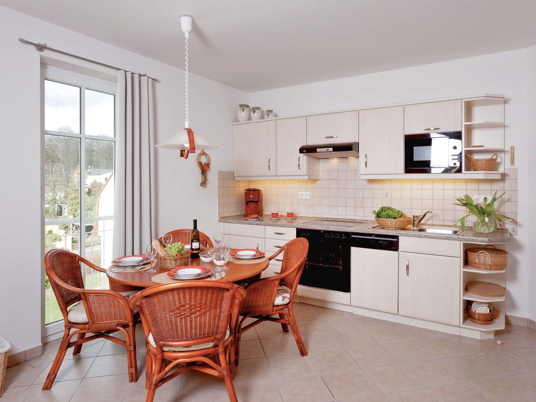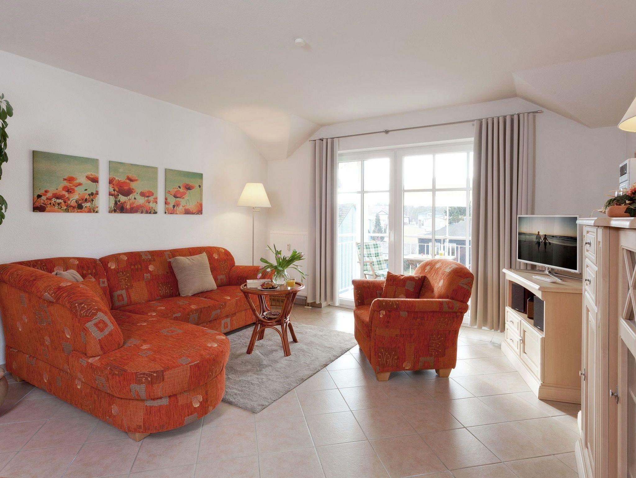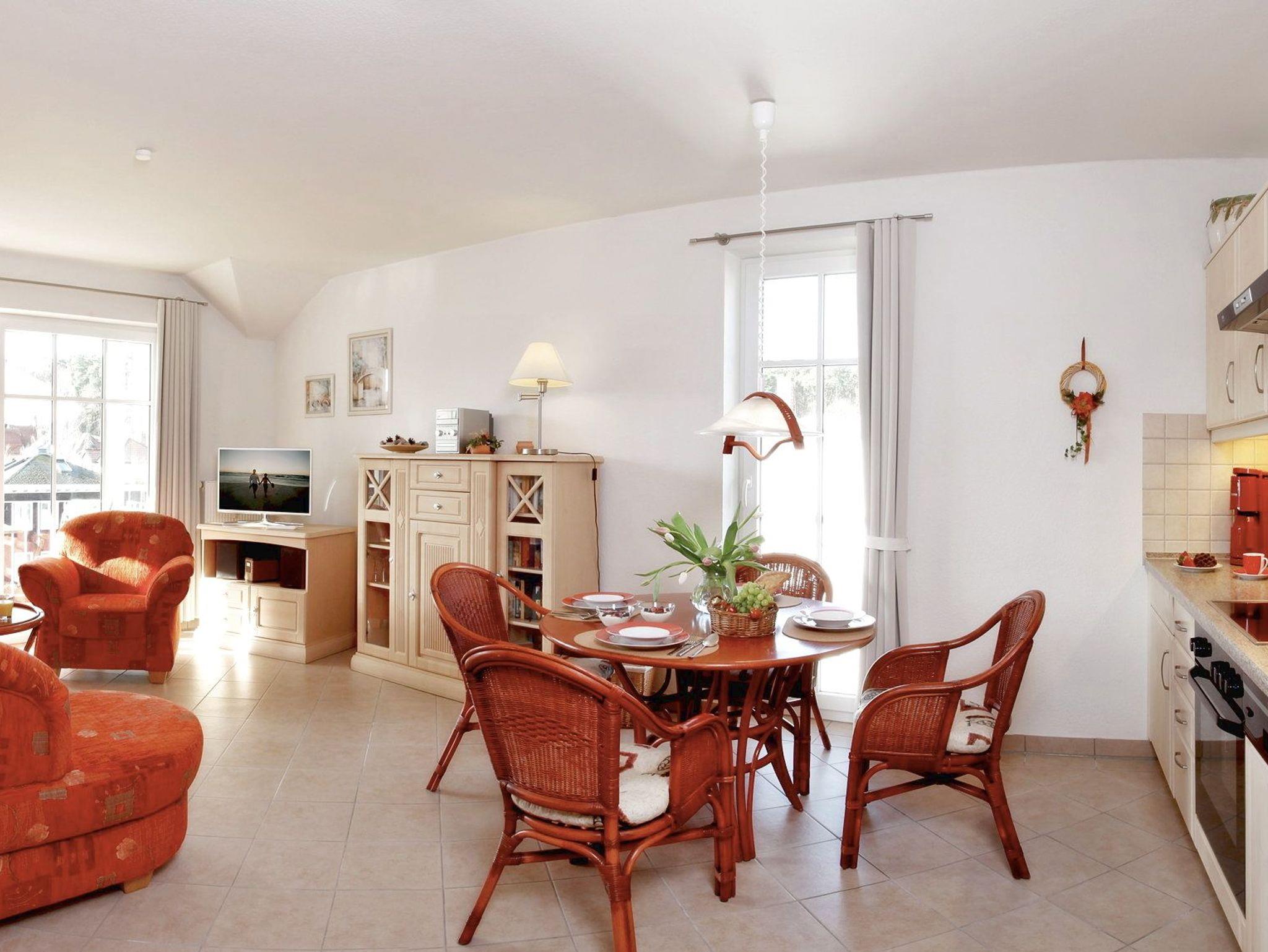 Hell und zugleich freundlich eingerichtet erwarten Sie auf 65m² alle Annehmlichkeiten für einen Urlaub mit bis zu vier Personen und einem Kleinkind im Alter bis zu zwei Jahren. Mit Liebe zum Detail eingerichtet begrüßt Sie der gemütliche Wohn-, Koch- und Essbereich in warmen Tönen. Die integrierte Küchenzeile bietet Dank Geschirrspüler, Kühlschrank mit Gefrierfach, Backofen, Mikrowelle, Wasserkocher, Toaster, Kaffeemaschine und vielen Extras jeglichen Kochkomfort für die Zubereitung Ihrer Lieblingsspeisen. Ein bequemes Sofa, ein Sessel, Flat-TV sowie ein Esstisch für vier Personen laden zum Entspannen und geselligem Beisammensein ein.