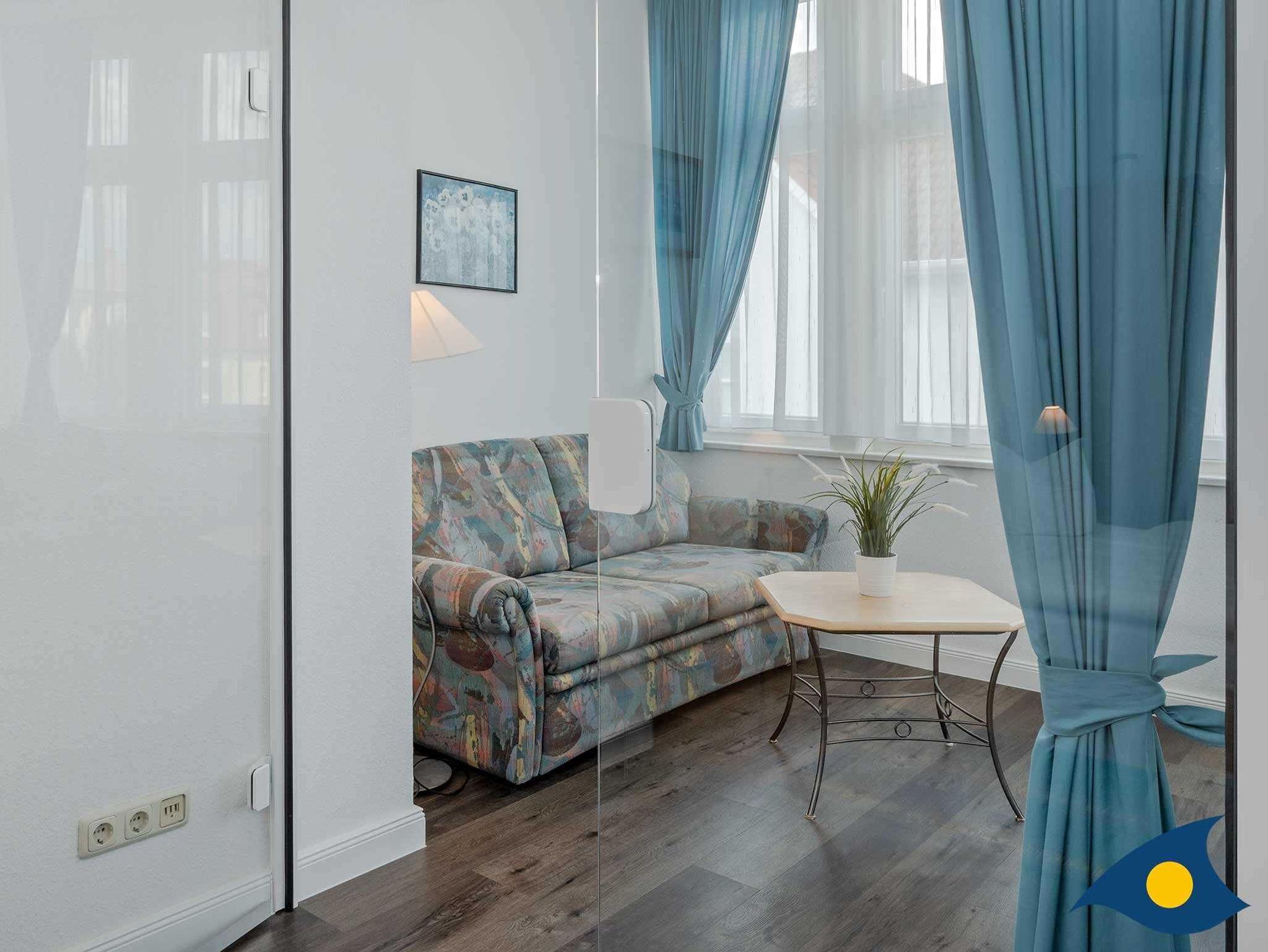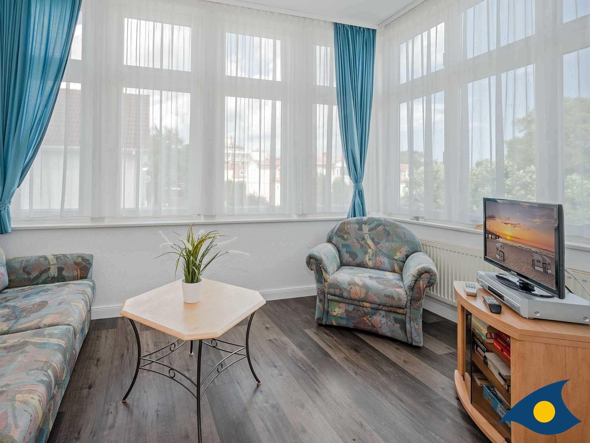 Das Erkerzimmer ist das Wohnzimmer des Appartements und lädt zum Lesen eines spannenden Buches oder zum Schreiben der Urlaubsgrüße ein.