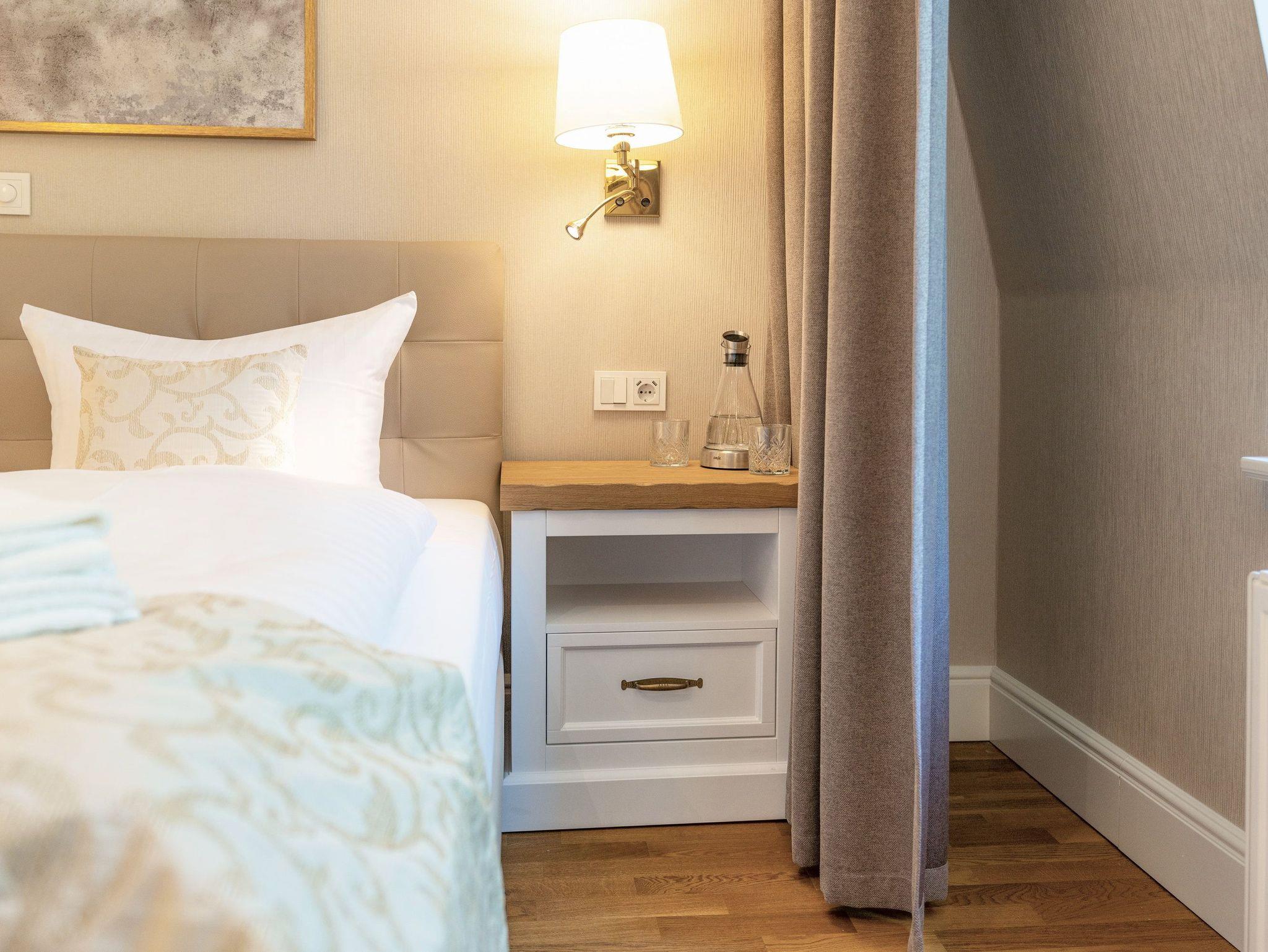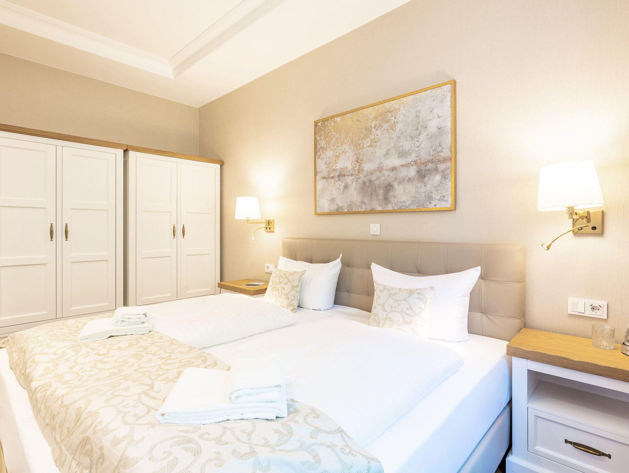 Im Schlafzimmer erwartet Sie ein hochwertiges Boxspringbett in der Größe 200 × 200 cm (zwei getrennte Matratzen) sowie ein eigener Flat-TV. Ein Kleiderschrank bietet ausreichend Stauraum für Ihre Urlaubsgarderobe. Für ein Kleinkind bis 3 Jahre ist eine Aufbettung im Babyreisebett möglich, welches gegen Gebühr hinzugebucht werden kann.