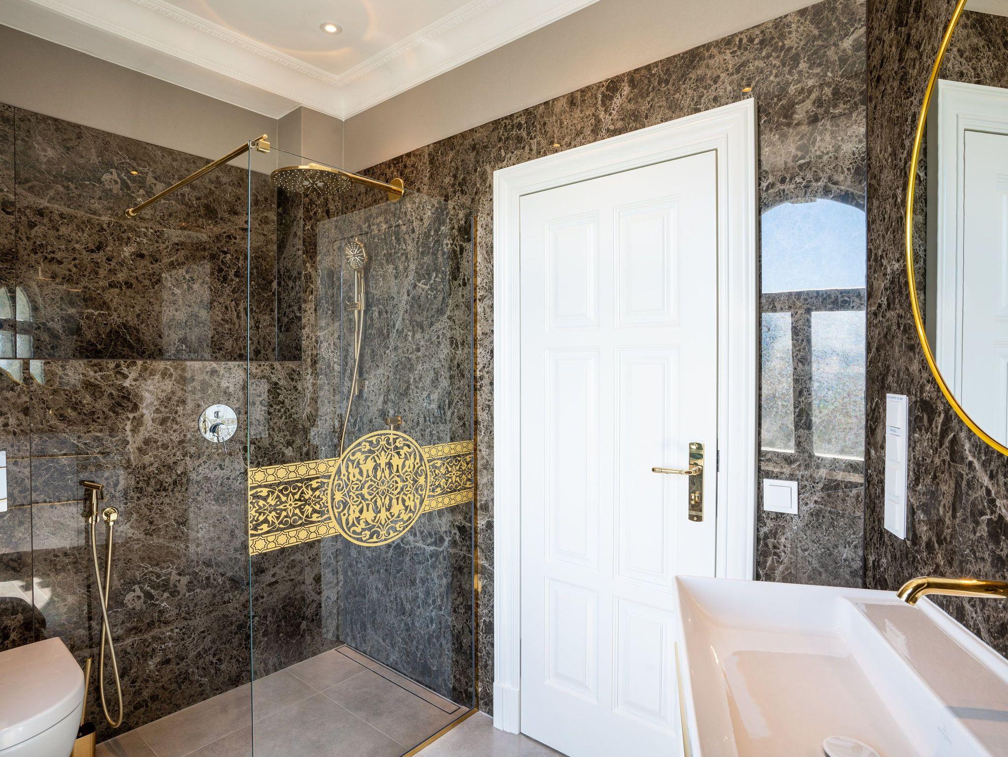 Das Badezimmer setzt einen stilvollen Akzent: bodengleiche Dusche, großformatige dunkle Natursteinfliesen, helle Keramik und Messingdetails verbinden Design mit Komfort. Für einen entspannten Start in den Urlaub liegen pro Person ein Duschtuch und ein kleines Handtuch bereit; die Betten sind bei Anreise bereits bezogen.