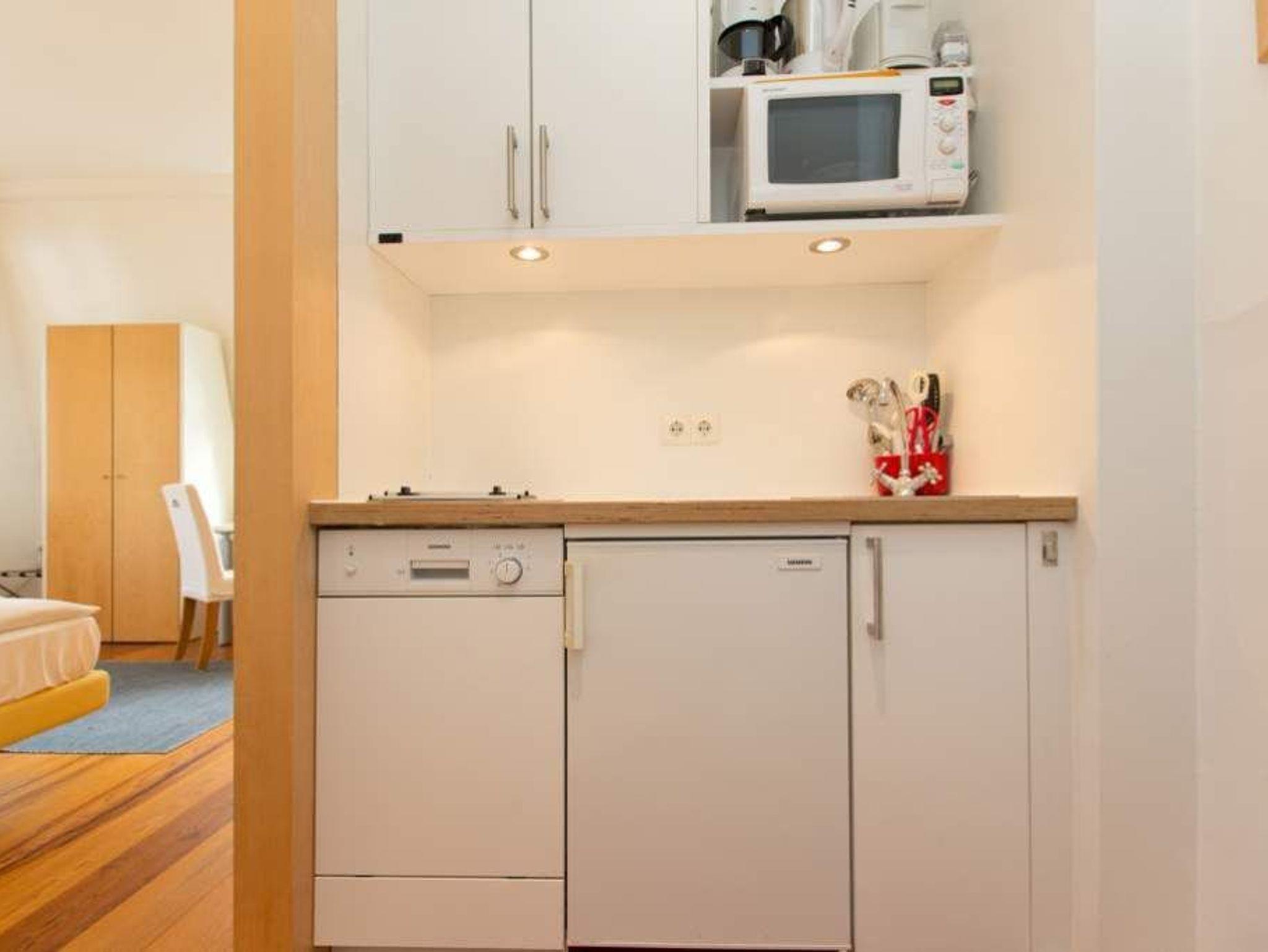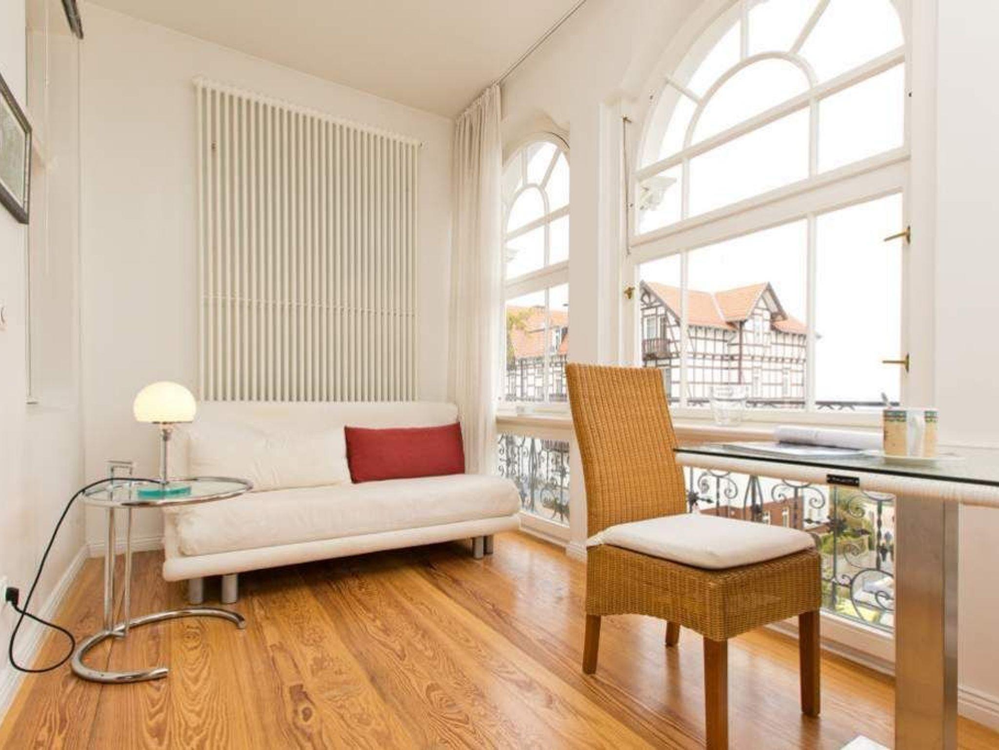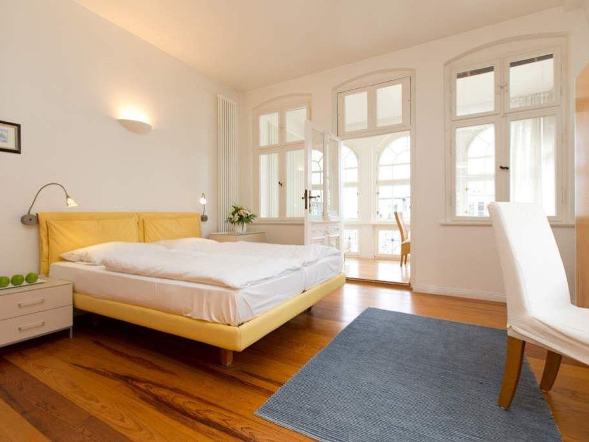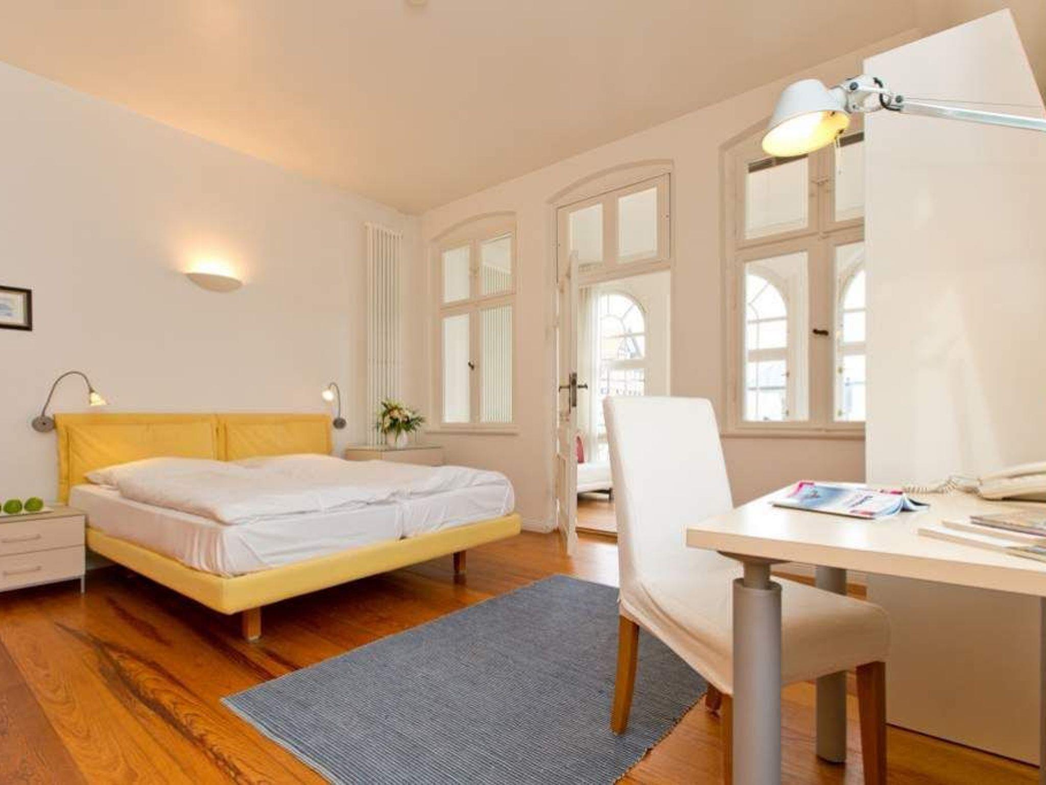 Durch fünf Fenster erhellt das klare Licht des Nordens diese Räume. Die Ostsee ist von fast jedem Platz in der Wohnung zu sehen, am schönsten jedoch ohne Frage von der Veranda aus, denn hier kann man es sich so richtig gemütlich machen. Vom Teetisch oder auch vom Sofa lässt es sich hier herrlich versonnen auf das Meer blicken. Im Schlaf- und Wohnzimmer gibt es einen Schreibtisch mit Arbeitslampe und ein geräumiges Doppelbett. Die kleine Küchenzeile komplettiert das Appartement. Die Wohnungen Köln, Düsseldorf [&] Lüneburg verfügen zusätzlich über einen Safe. Ein DVD-Player kann Ihnen auf Anfrage zur Verfügung gestellt werden.