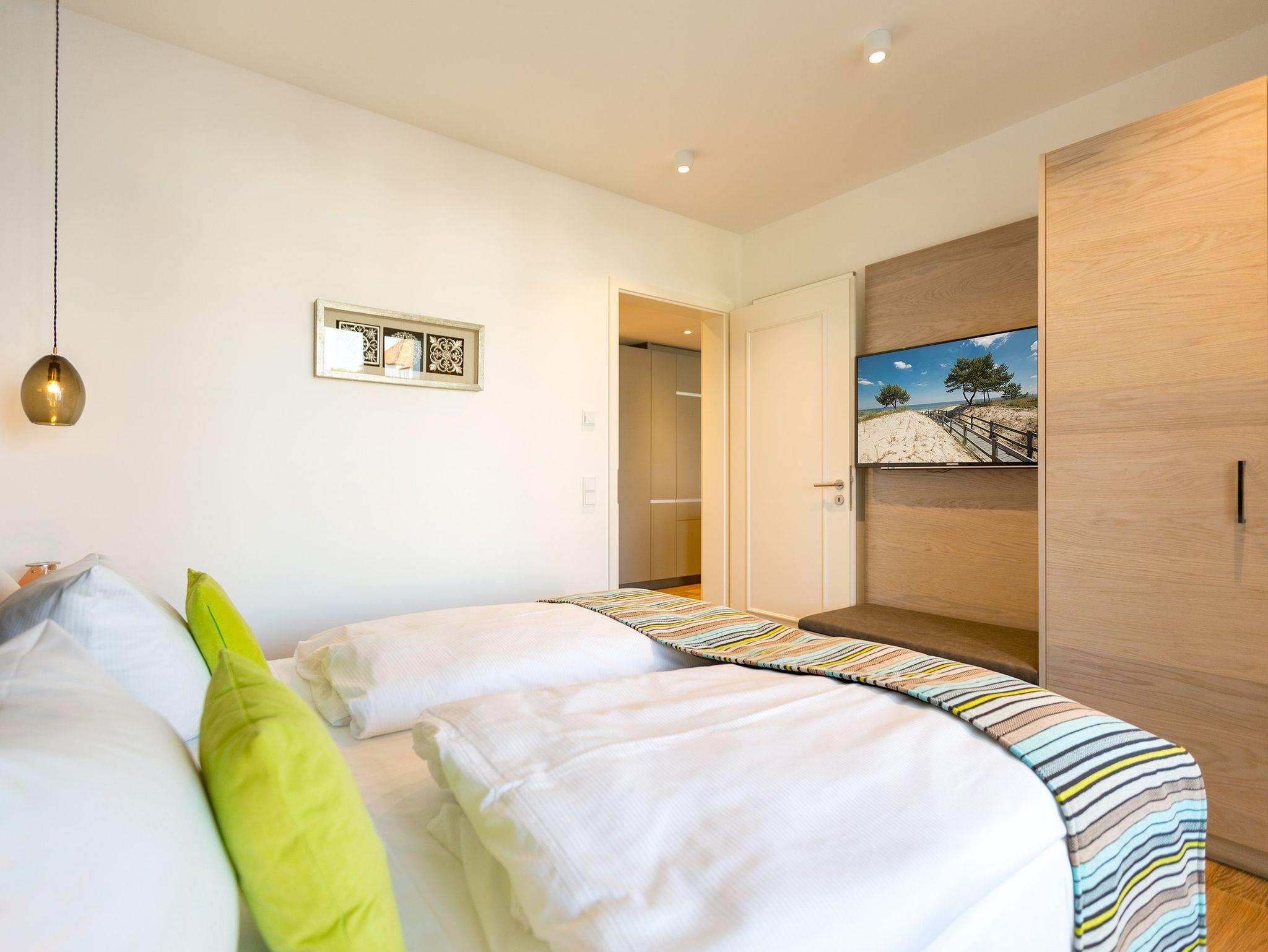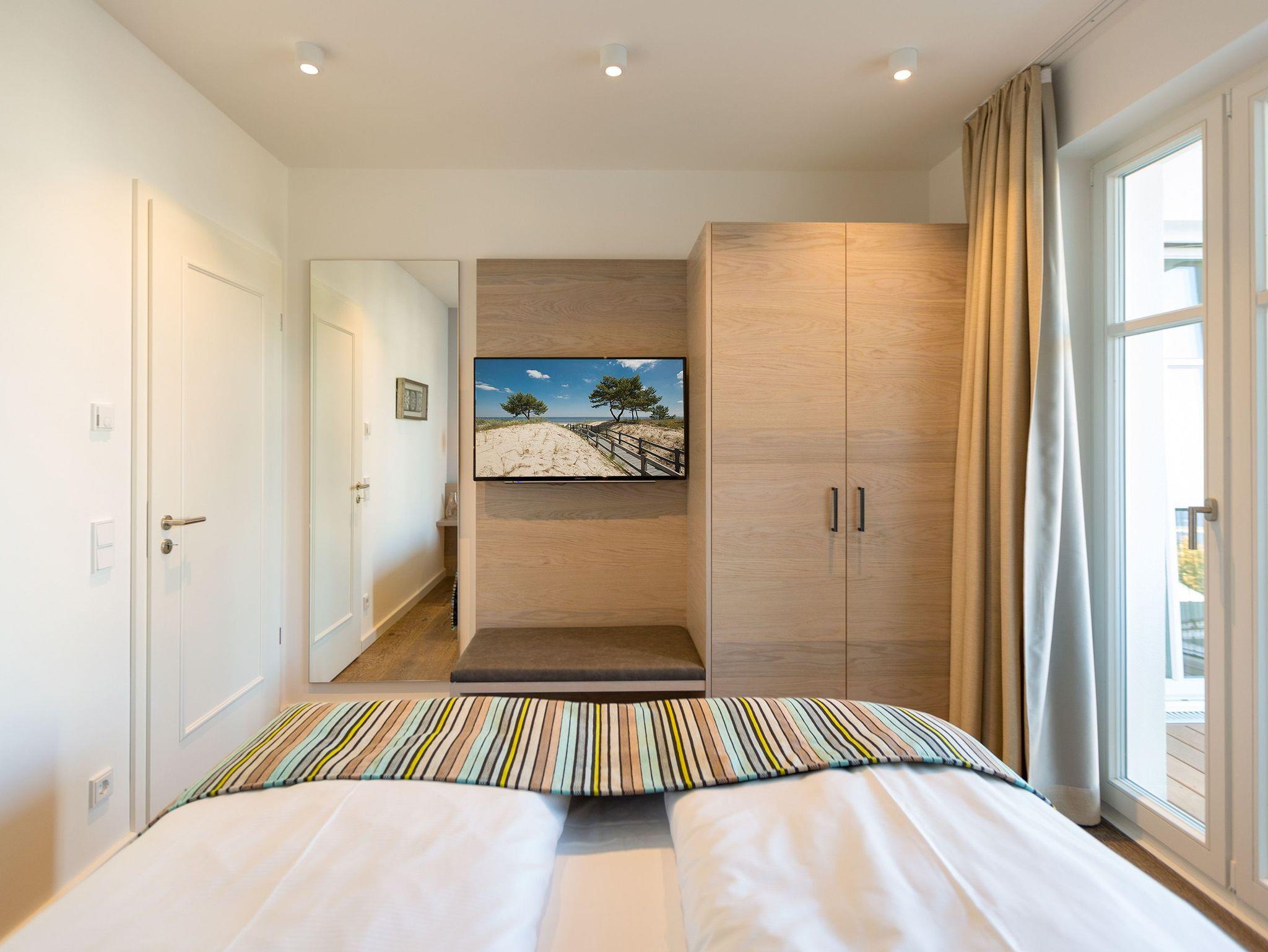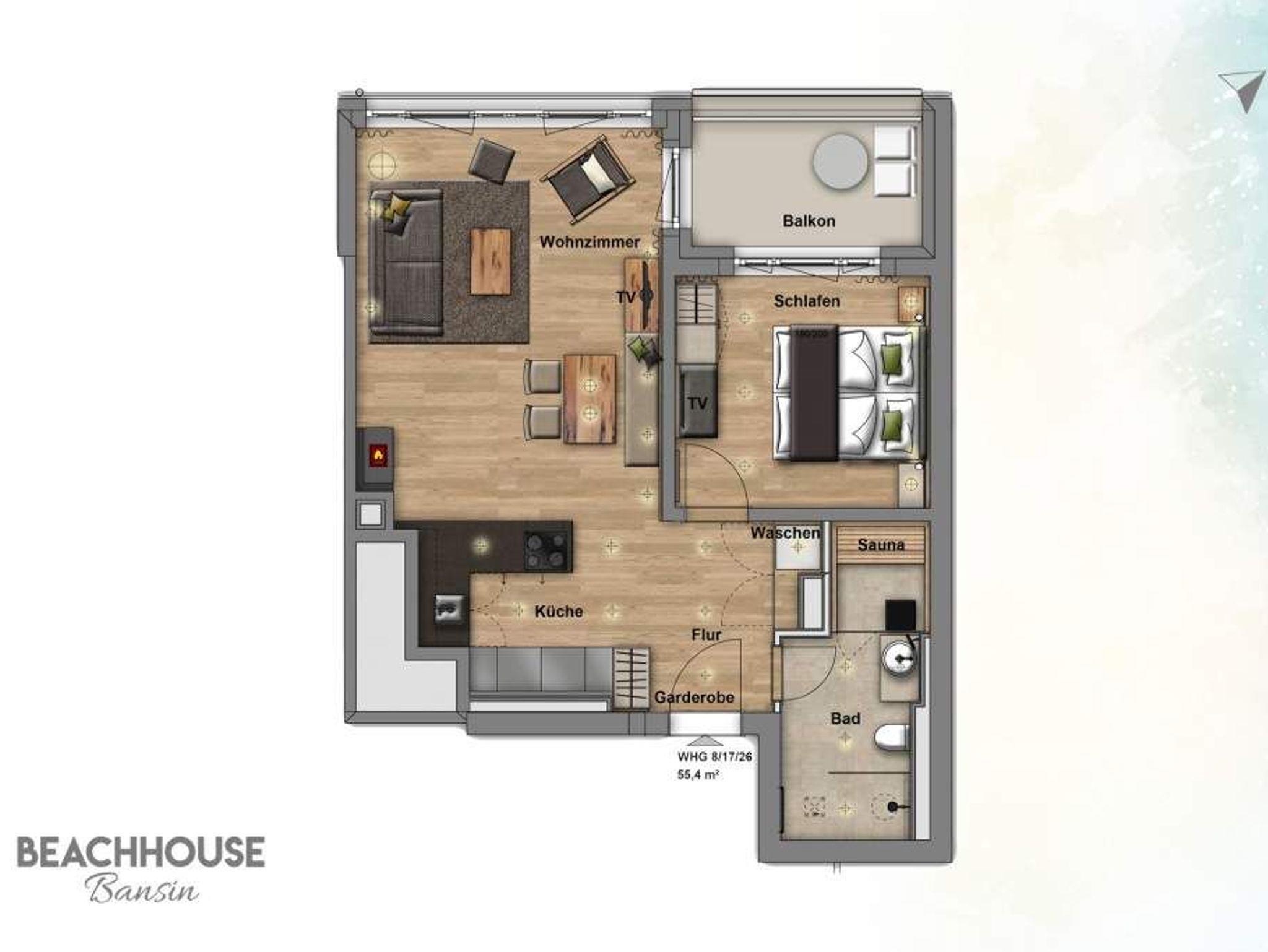Ein kuscheliges Urlaubsparadies für Zwei wartet im 2. Stock des Beachhouses nur darauf, Ihnen unvergessliche Stunden zu zaubern, in der Sie neue Energie tanken und allen Stress einmal getrost vergessen dürfen. Auf 51 Quadratmetern verführt Sie ein exklusives und stylisches Ambiente zu wahren Urlaubsträumen. Das Zwei-Raum-Appartement wurde von Designerhand konzipiert und mit hochwertigen und ausgewählten Möbeln eingerichtet. Freizügigkeit und Exklusivität waren die Leitgedanken. Es empfängt Sie ein harmonisches Raumkonzept, aus dem Sie am liebsten gar nicht wieder ausziehen wollen. Und das alles in unmittelbarer Nähe zur Ostsee. Vom Balkon (6 Quadratmeter groß) aus können Sie Richtung Nord-West den weiten Blick über das endlose Blau ungehindert genießen. Auf den dazu gehörenden Möbeln lauschen Sie schon zum Frühstück dem Wellenrauschen. Das Wohn-Ess-Zimmer ist geräumig und bietet reichlich Platz für gemeinsame Mußestunden vor dem Gas-Kamin, auf der bequemen Couch oder am schönen Esstisch. Kochen können Sie in der offenen Wohnküche nach Herzenslust. Denn sämtliche Gerätschaften und Utensilien bis hin zum erlesenen Geschirr sind darin zu finden. Das WLAN zum Download diverser Lieblingsgerichte ist kostenfrei. Über die hochwertige Bose-Anlage mit Bluetooth-Funktion ist auch die Lieblingsmusik ein echter Hörgenuss. Zwei Flat-TVs im Wohnzimmer und im Schlafzimmer dienen der Unterhaltung. Apropos Schlafzimmer. Dieser wunderschöne und helle Raum ist nicht nur zum traumreichen Schlafvergnügen bestens geeignet. Sein großes und komfortables Boxspringdoppelbett (1,80 m x 2,00 m) ist für alle entspannenden Tätigkeiten wunderbar geeignet. Da das Schlafzimmer ebenfalls einen Zugang zum Balkon hat, können Sie schon, kaum dass Sie die Augen geöffnet haben, Ostseeweite genießen. Im Badezimmer befindet sich neben einer großzügig geschnittenen Regendusche, einem Waschtisch und einem WC eine Finnische Sauna. Da werden selbst ungemütliche Tage auf Usedom zu entspannenden Auszeitstunden. Handtücher liegen für Sie bereit und die Betten sind bei Ihrer Anreise bezogen. In einem kleinen Hauswirtschaftsraum steht ein Waschtrockner, in dem Sie Ihre Urlaubsgarderobe waschen können. In der modernen Tiefgarage ist für Sie der Stellplatz Nr. 17 im Doppelparker unten (max. Höhe 1,85 m, max. Länge 5,10 m, max. Breite 2,50 m, max. Last 2.600 kg) reserviert.