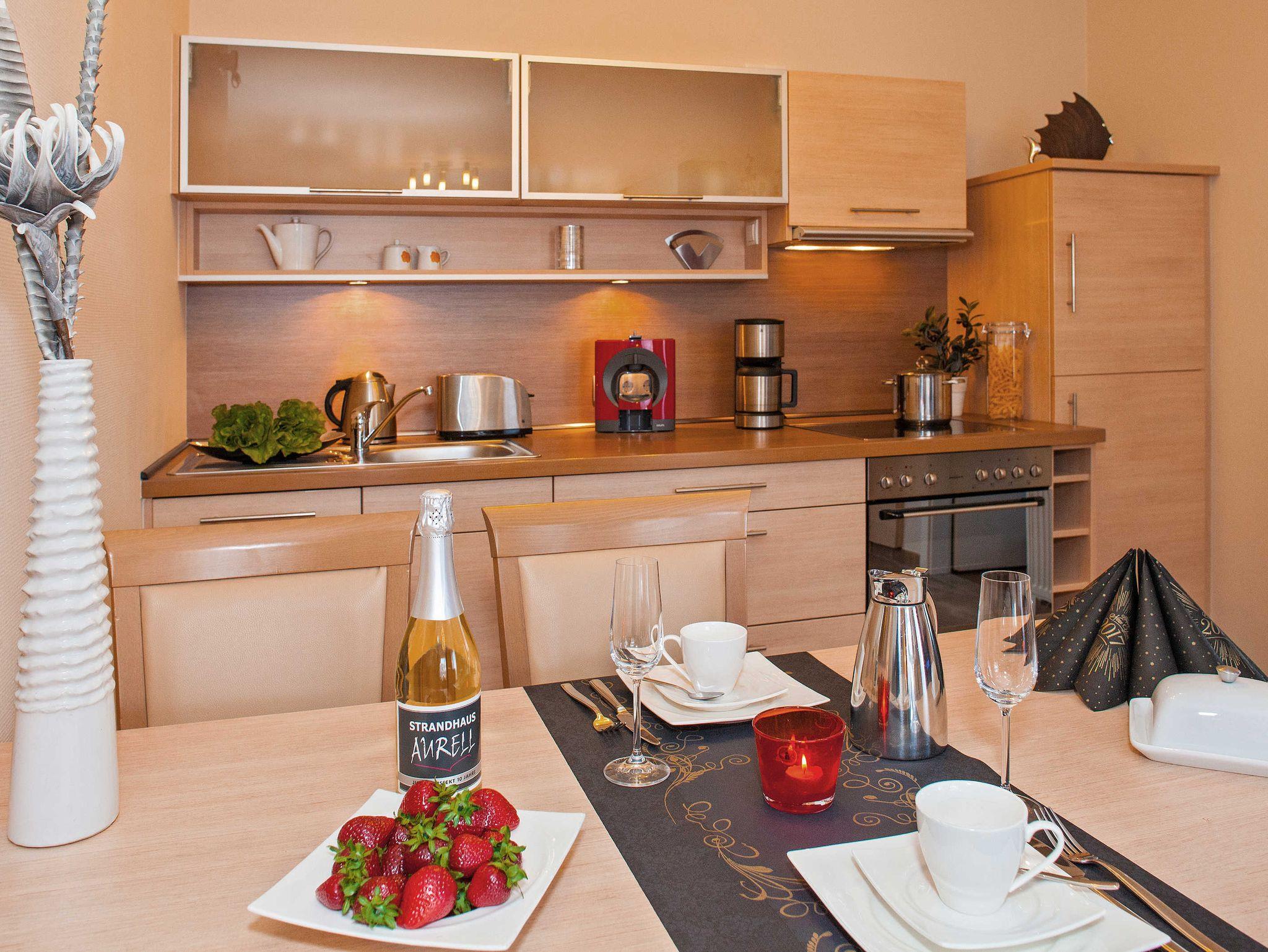 Moderne stilvolle 3- Zimmerferienwohnung ca. 2 - 4 Personen. Wohnzimmer mit TV, CD, Eßplatz und integrierter Vollküche mit Geschirrspüler. Wohnung mit Duschbad und zusätzlichen separatem WC. Die Wohnung besitzt einen großen Balkon zur Auto freien Strandpromenade ausgestattet mit Balkonmöbeln und verfügt über Meerblick.