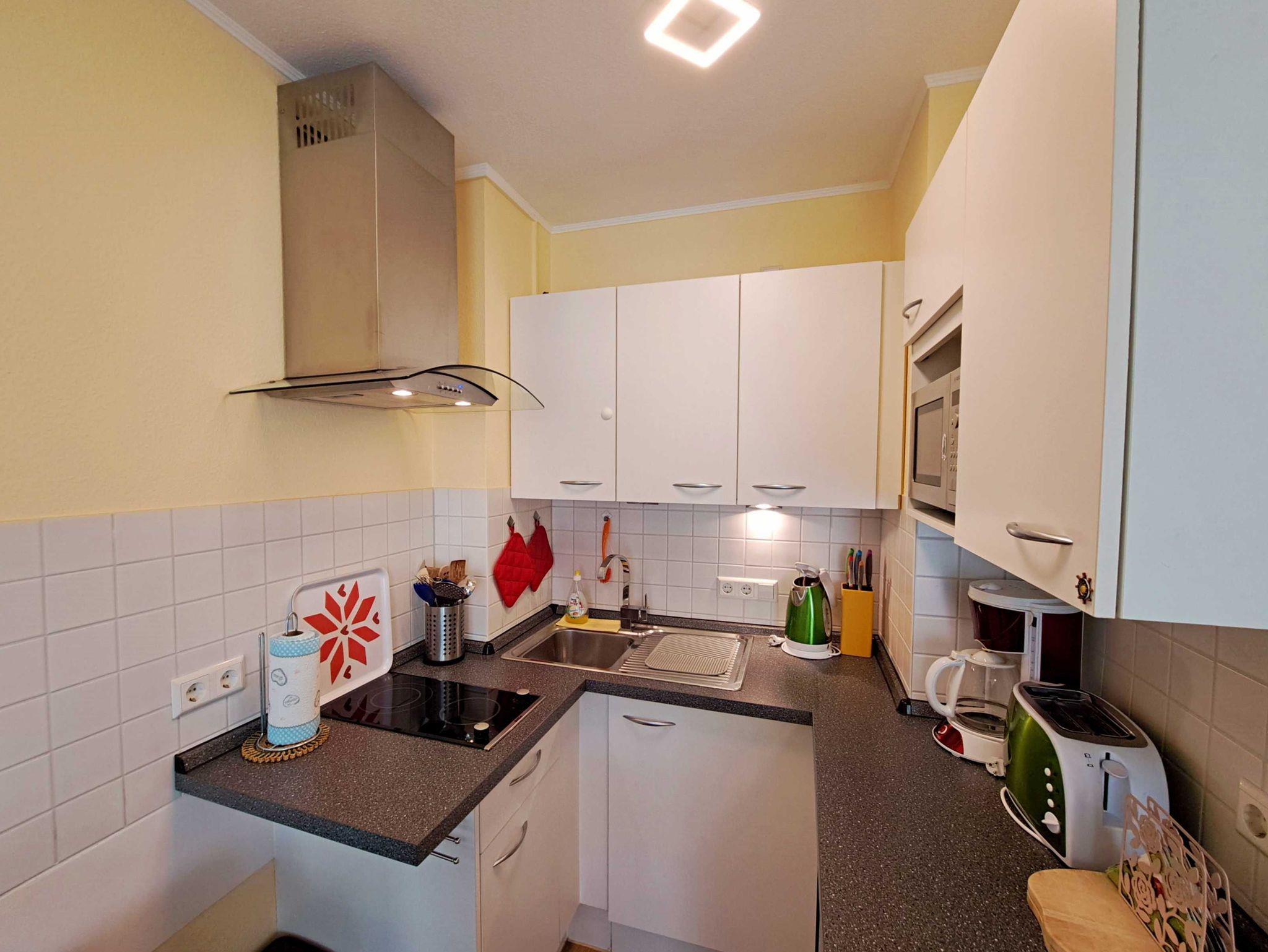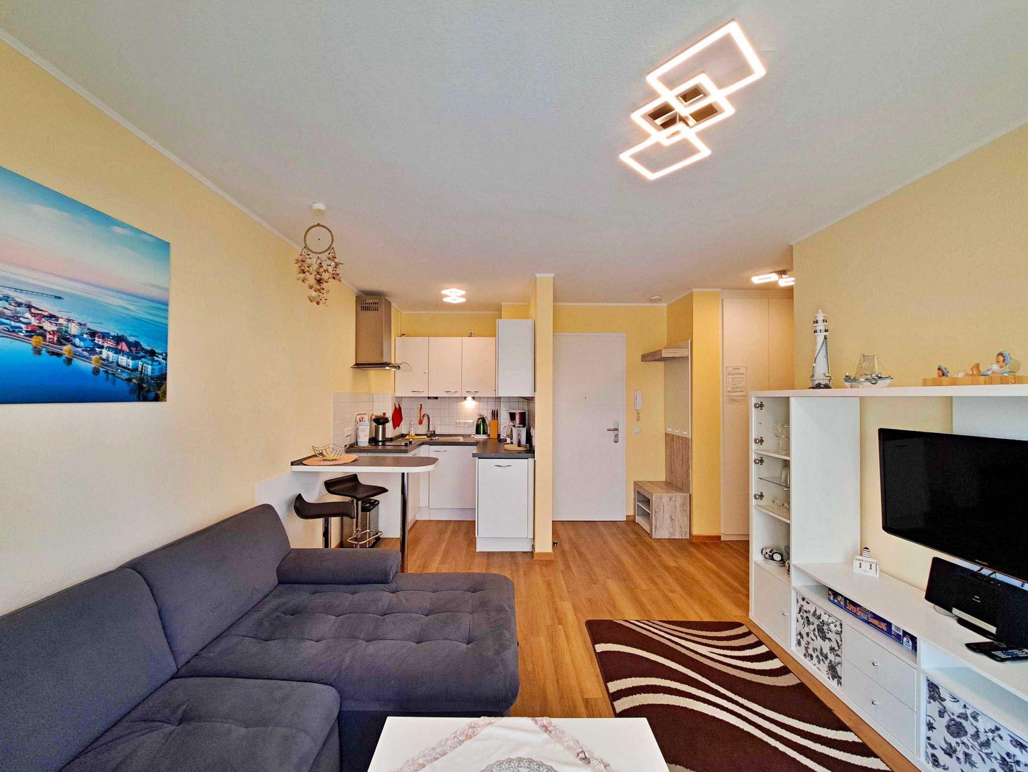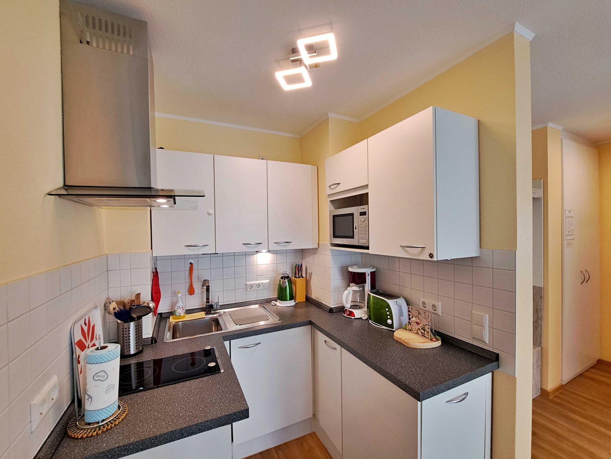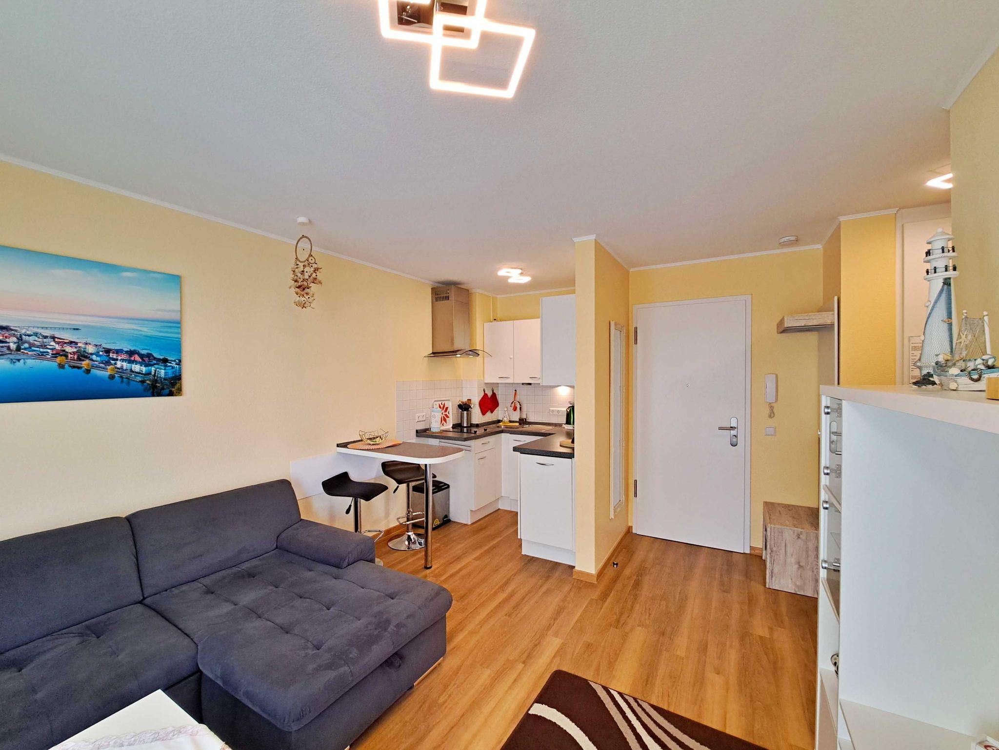 Die moderne und helle 2 Raum-Nichtraucherferienwohnung mit Balkon zur Nord-Ostseite befindet sich im 1. OG des Appartementhauses (per Lift erreichbar) und bietet Platz für bis zu 3 Personen um einen erholsamen Urlaub im wunderschönen Seebad Bansin zu verbringen. Das Wohnzimmer ist mit einem bequemen Ecksofa (ausklappbar für die 3. Person), Flachbild-TV, Radio mit CD-Player sowie Kommode möbliert. Die Wohnküche, mit kleinem Tresen als Essbereich, ist bis auf einen Backofen, komplett ausgestattet mit einem 2 Platten-Ceranherd, Spülmaschine, Mikrowelle, Kühlschrank mit Gefrierfach, Kaffeemaschine, Wasserkocher, Toaster und Geschirr. Im Schlafzimmer befindet sich ein Doppelbett (1,80 m breit) und ein geräumiger Kleiderschrank. Das Tageslicht-Bad ist mit Dusche/WC ausgestattet. Die gesamte Wohnung ist mit einem allergikerfreundlichem Fußboden in Holzdielenoptik, sowie Insektenschutz an jedem Fenster versehen. Für den Tag am Meer steht Ihnen als besonderes Highlight von Mai bis September (je nach Witterung) ein Strandkorb am Strand kostenlos zur Verfügung.