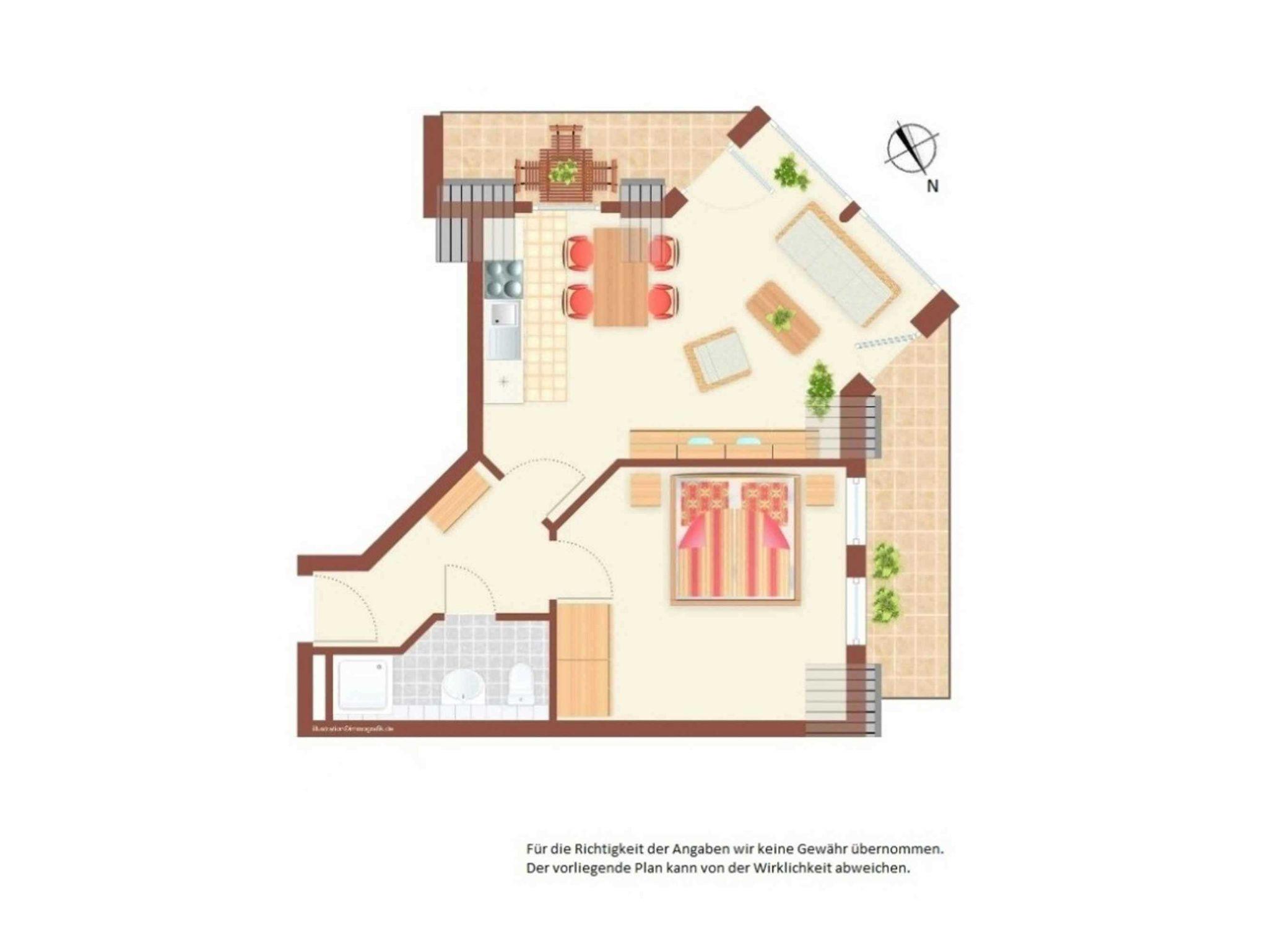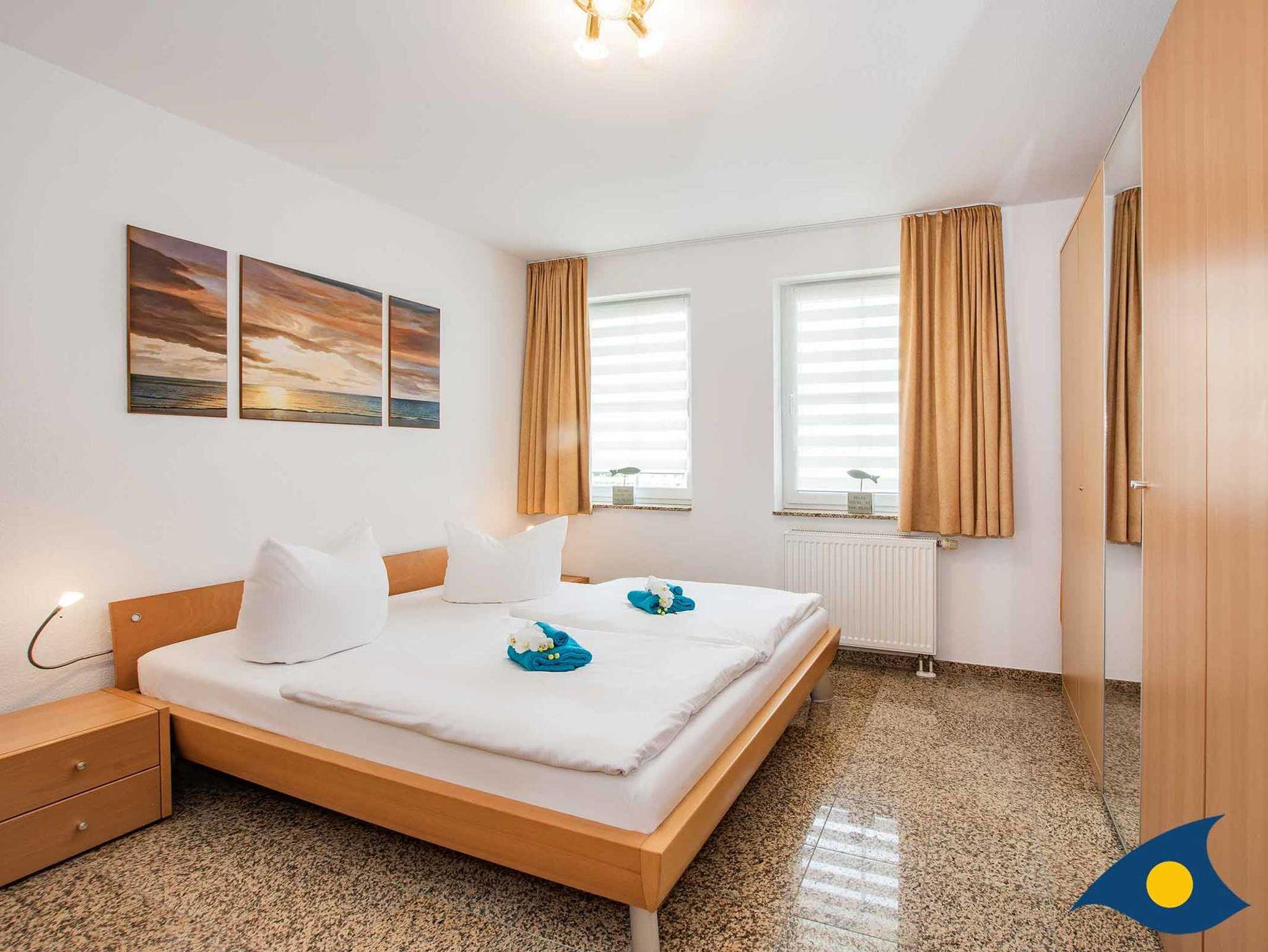 Der Wohn-Essraum mit Flachbild-TV, DVD-Player und einer Schlafcouch ermöglicht, die Ferienwohnung mit bis zu 4 Personen zu nutzen. Das Schlafzimmer ist mit einem Doppelbett und großen Schränken ausgestattet und bietet bei Bedarf auch ausreichend Platz für ein Kinderreisebett.