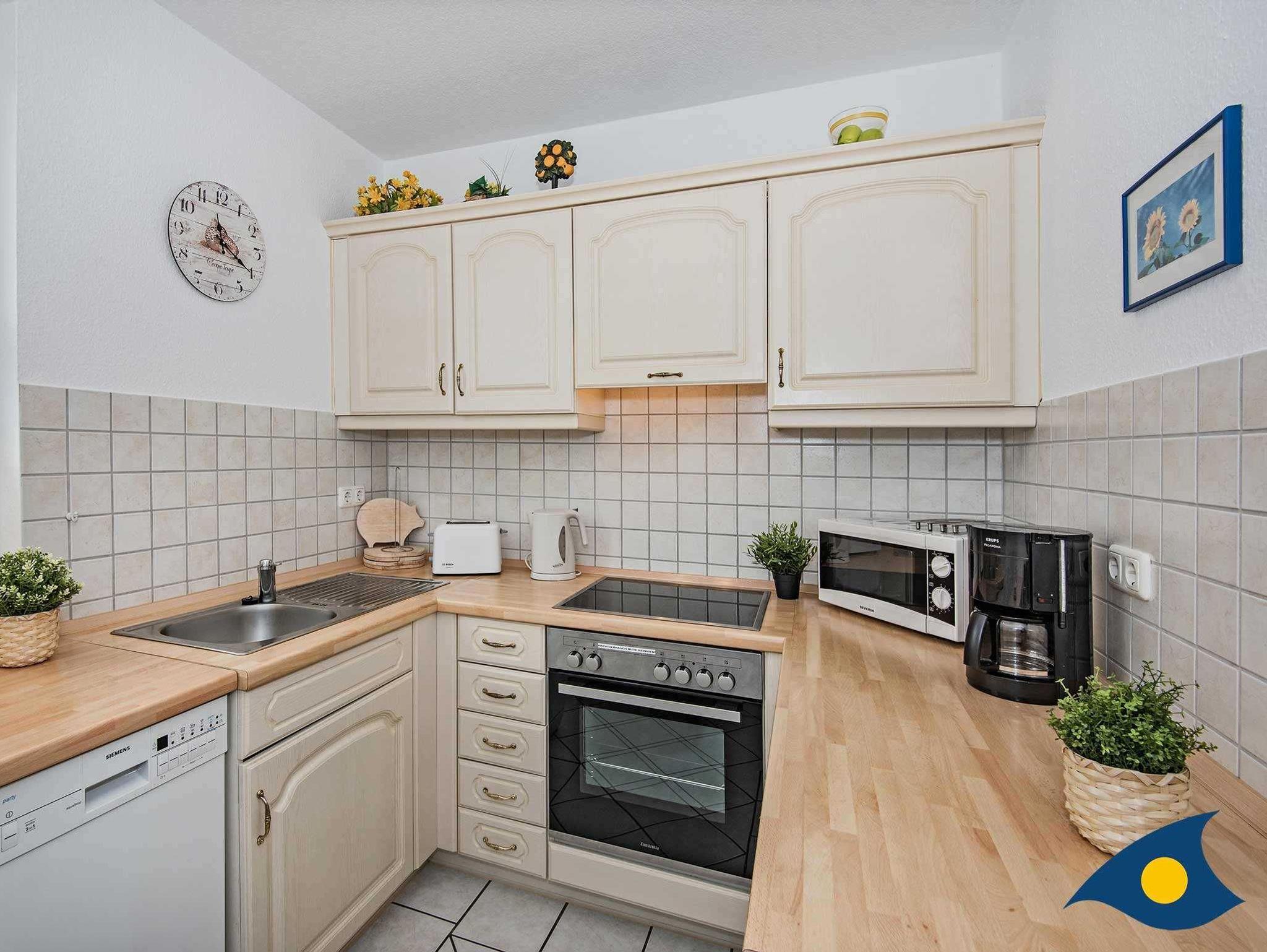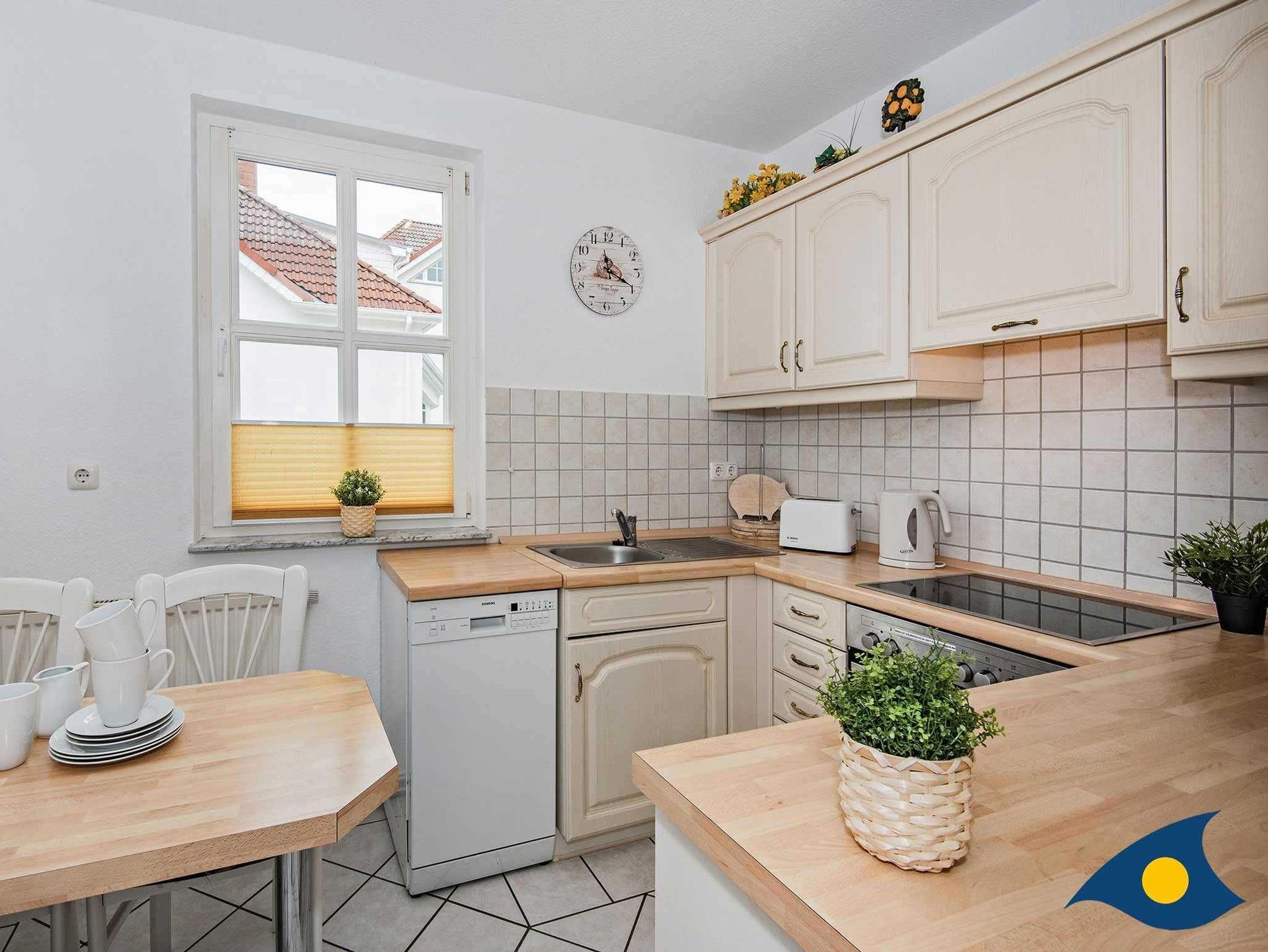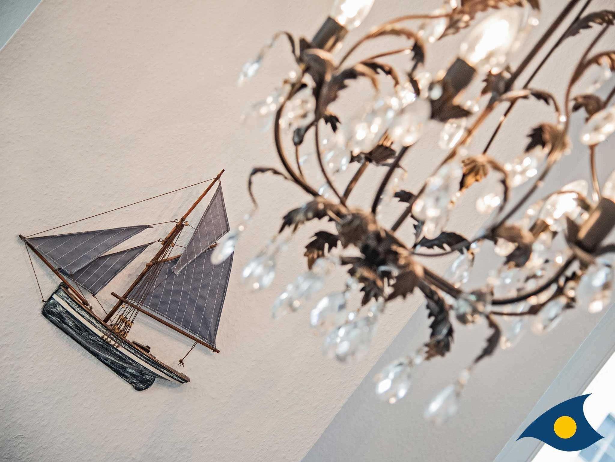 Die hochwertige Einrichtung wurde mit hübschen maritimen Accessoires ergänzt. Die separate Küche bietet einen weiteren Essplatz für ein schnelles Frühstück, einen Herd mit vier Kochplatten incl. Backofen und eine Spülmaschine.