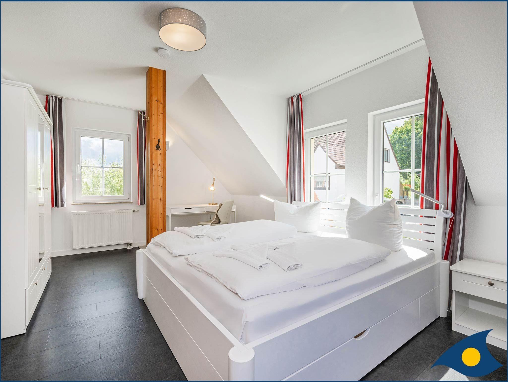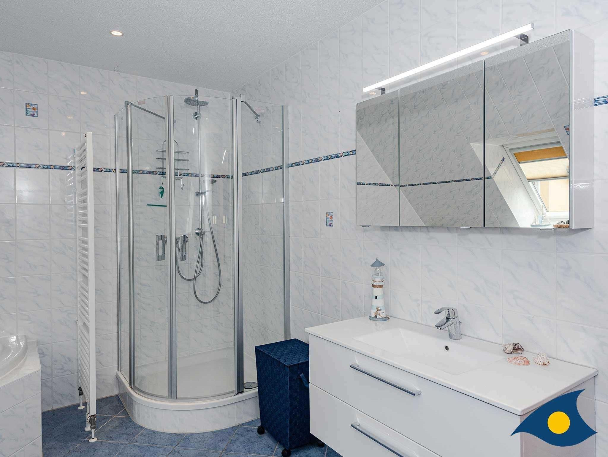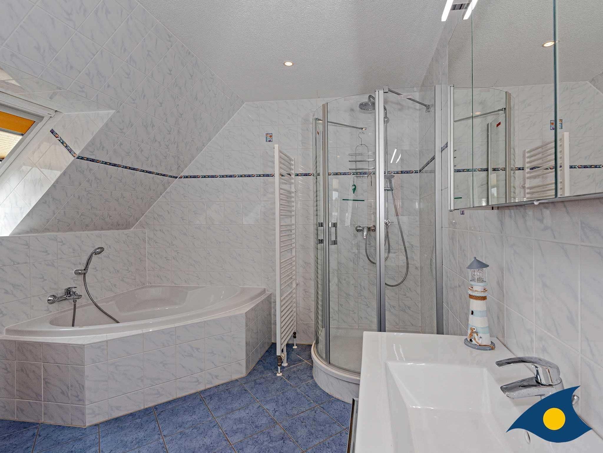 Vom Hausflur aus gelangt man in das Duschbad, sowie in die obere Etage. Das Highlight der ersten Etage ist das geschmackvoll gestaltete Vollbad mit Waschmaschine. Bei einem heißen Bad können Sie die Seele baumeln lassen und den Alltagsstress vergessen. Zwei separate Schlafzimmer, eins mit einem Doppelbett, sowie eins mit zwei Einzelbetten schaffen den nötigen Raum zur Erholung. Ausreichend Platz für Ihre Urlaubsgarderobe finden Sie dabei in den zahlreichen Schränken und großzügig geschnittenen Bettkästen.