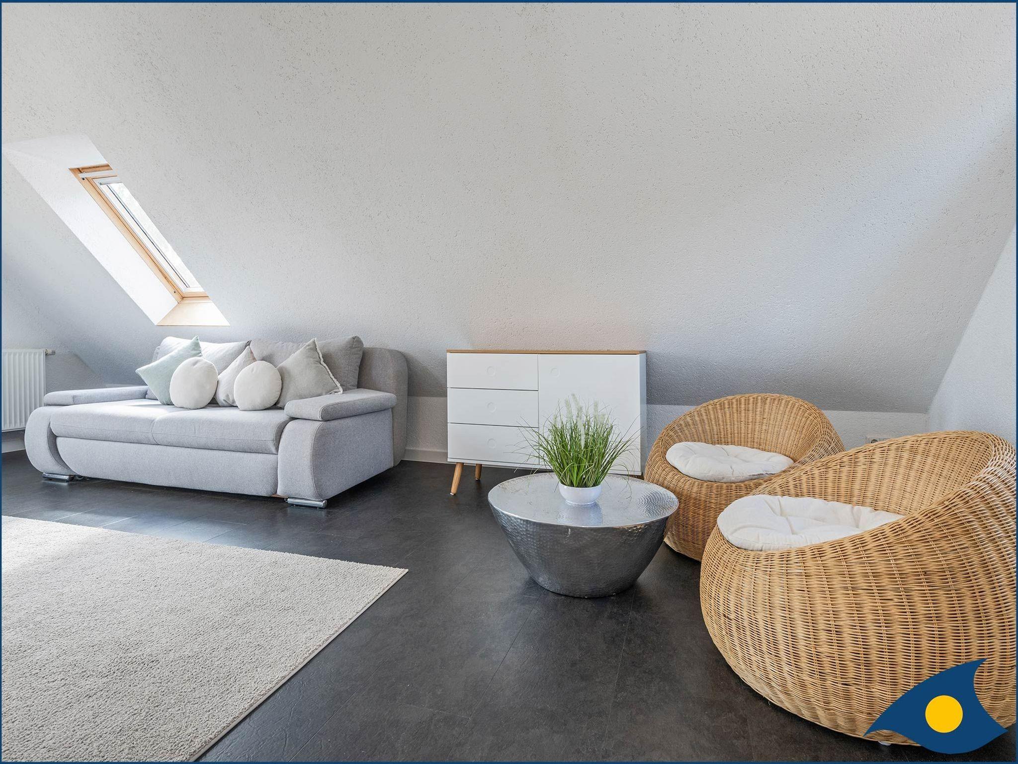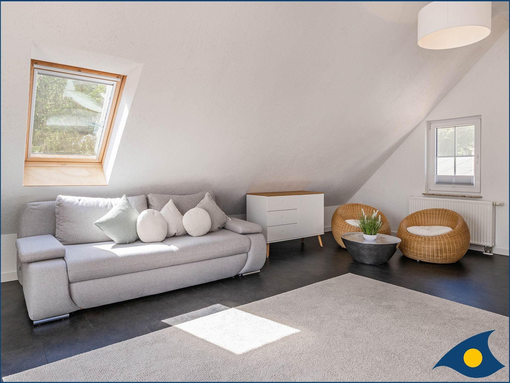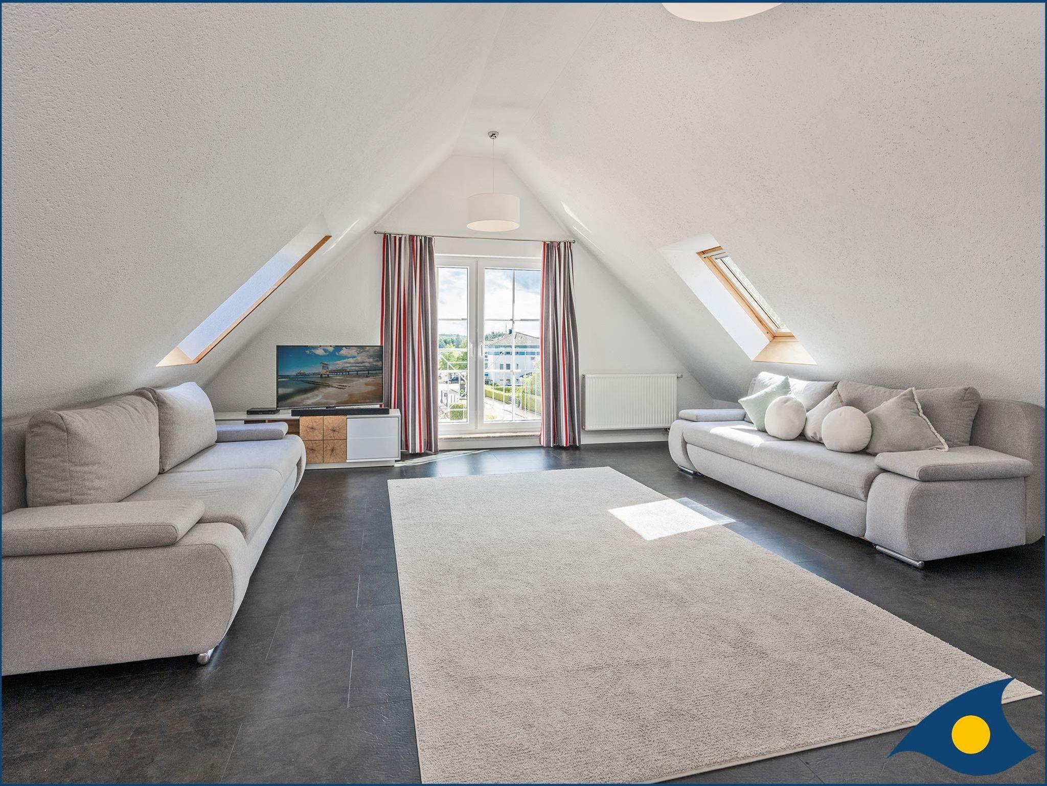 In der Dachgaube angekommen fällt der Blick aus dem bodentiefen Fenster in den Garten. 4 weitere Personen haben hier die Möglichkeit es sich bei einem Fernseh- oder Spieleabend auf den bequemen Schlafcouchen gemütlich zu machen.