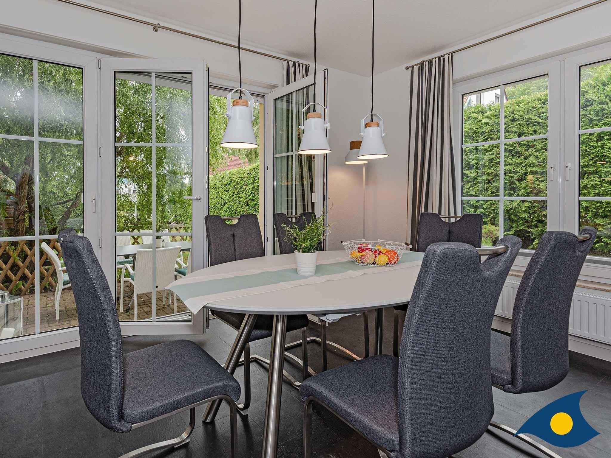 Im Wohn- und Essbereich erwartet Sie eine bequeme Sitzecke mit TV und Blick auf den Kamin. Hier können Sie den Tag bei einem gemütlichen Beisammensein ausklingen lassen. Die angrenzende und offen gestaltete Küche beinhaltet eine Kühl- und Gefrierkombination, sowie einen Backofen, Kühlschrank, Spülmaschine und eine Nespressokapselmaschine. Vom Wohnbereich aus gelangt man auf die möblierte Terrasse, welche zu einem leckeren Grillabend einlädt. Nach einem abwechslungsreichen Tag können sich Ihre Kinder zusammen in der Spielecke beschäftigen. Treppenabgänge mit Kindergittern schützen unsere kleinen Gäste dabei vor einem unbeaufsichtigten Zugang.