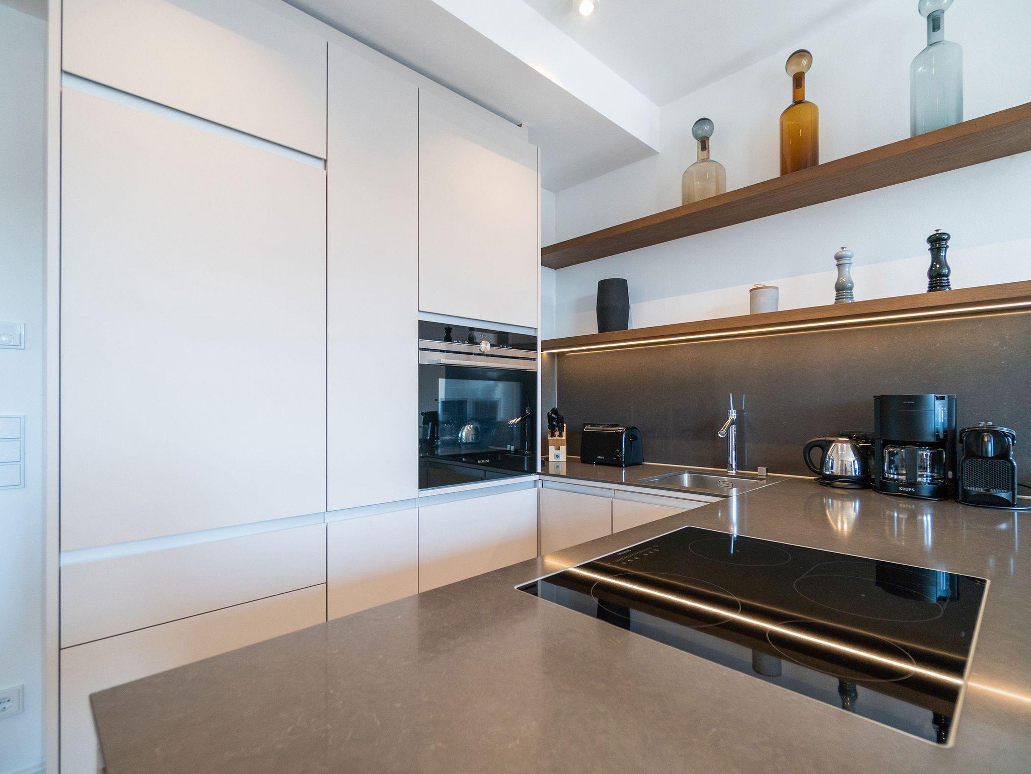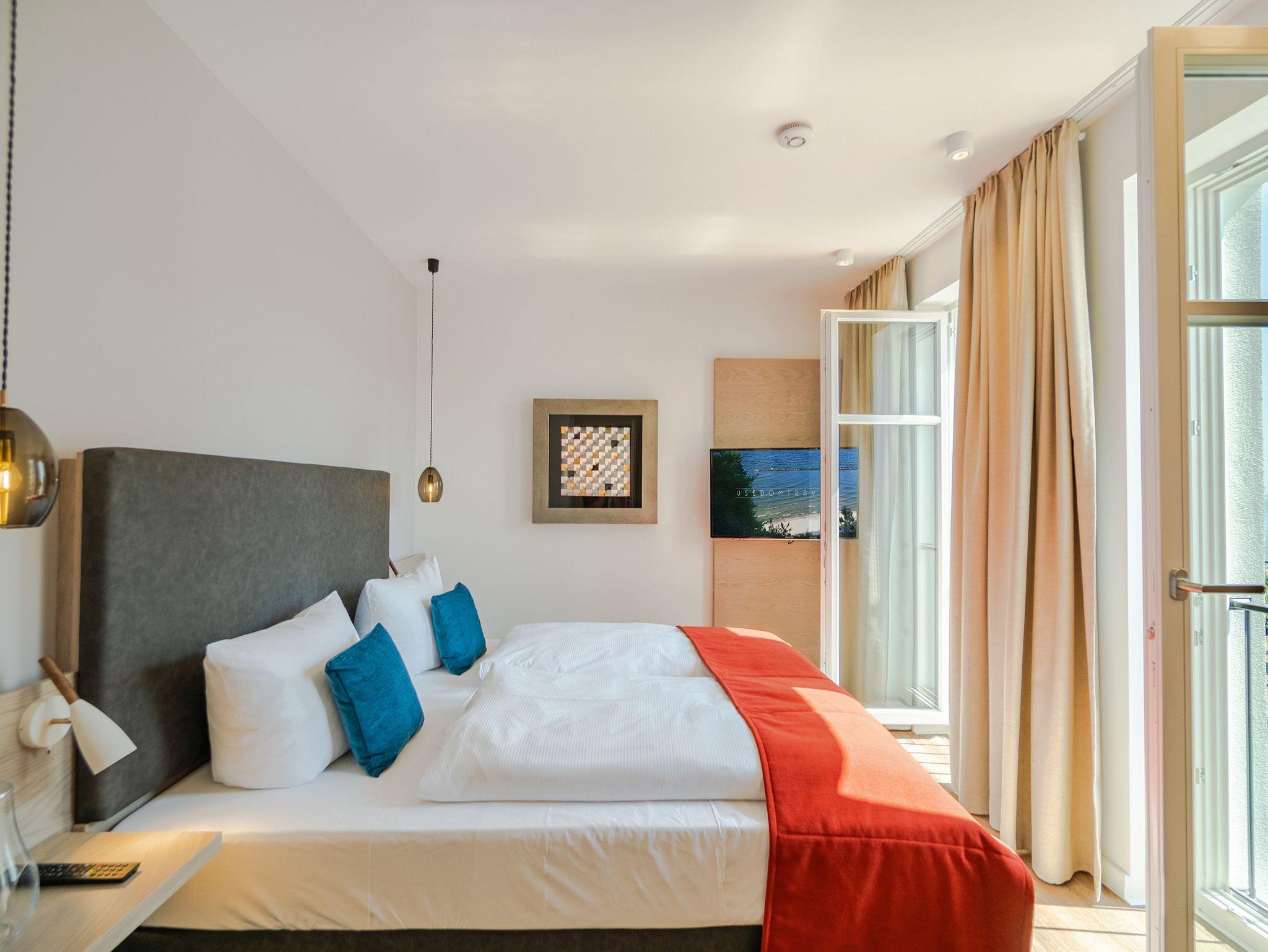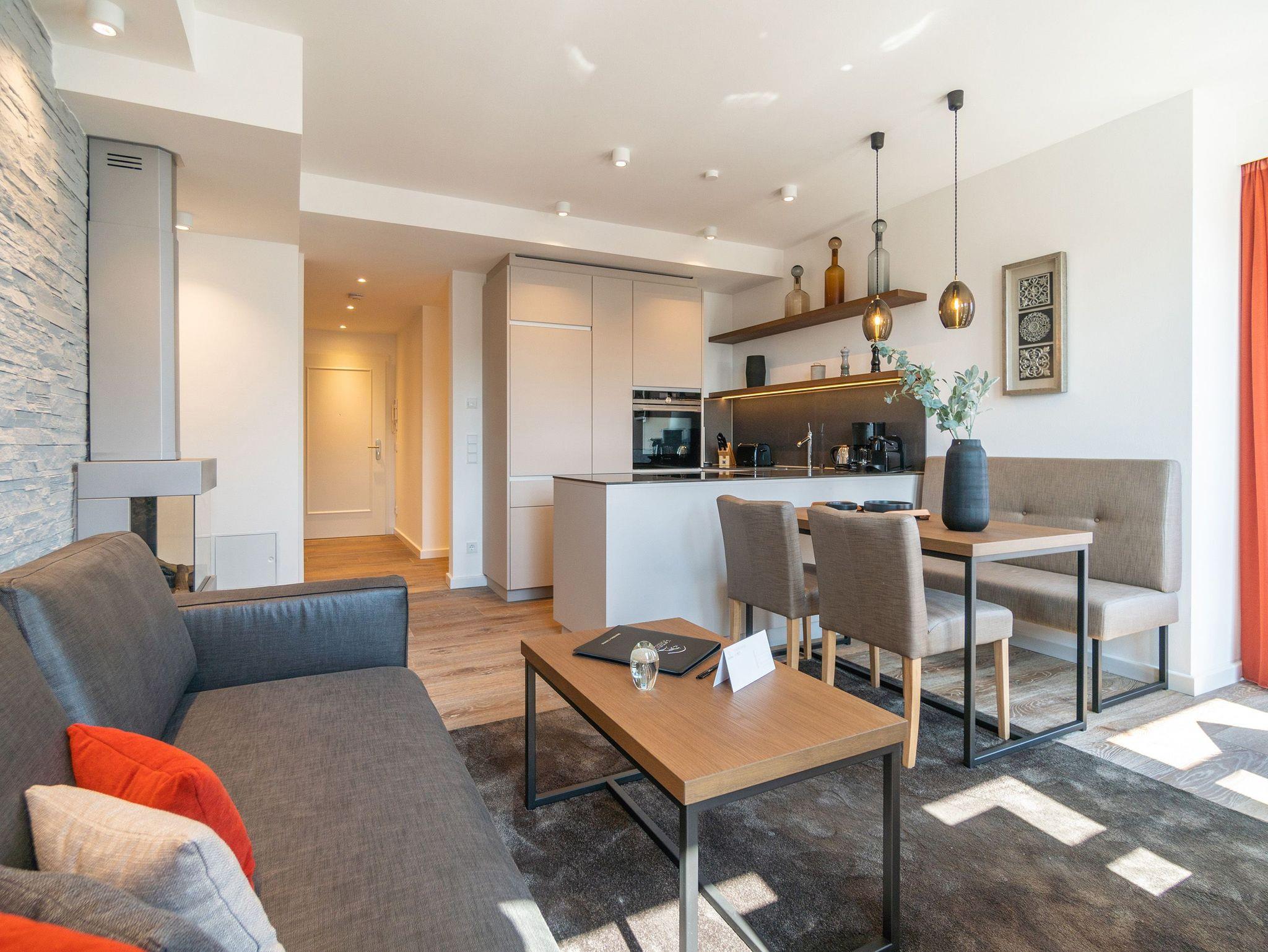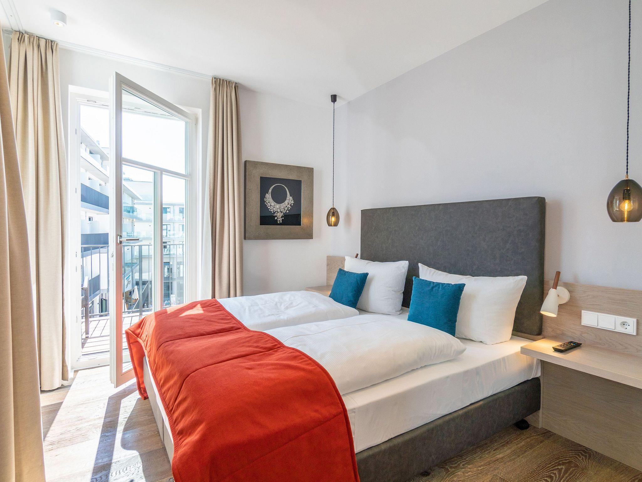 Ob mit der Familie oder mit Freunden auf diesen 69 Quadratmetern Urlaubsparadies wird Ihre Auszeit zu einem ganz besonderen Erlebnis. Allein der Blick vom Süd-Ost-Balkon über die endlose Weite der Ostsee ist Erholung pur. Tanken Sie hier schon morgens beim Frühstück Sonne satt. Bis zu vier Personen und ein Kleinkind bis drei Jahre (im Kinderreisebett) werden sich in den drei Räumen dieses stylischen Appartements pudelwohl fühlen. Erlesen und edel ist die Inneneinrichtung vom Innenarchitekten konzipiert und arrangiert. Ein geräumiges Wohn-Ess-Zimmer wartet nur darauf, Ihnen alle Annehmlichkeiten zu bieten, die Sie sich wünschen können: Vom Home-Entertainment des großen Flat-TVs und der Bose-Soundanlage, die Sie via Bluetooth mit Ihrem Handy bedienen können, über das bequeme Sofa zum Relaxen, den kuscheligen Gas-Kamin, der Gemütlichkeit auf Knopfdruck zaubert, bis hin zum edlen und schönen Esstisch, an dem Sie gemeinsam viele Muße- und Genussstunden verbringen können. Die Steinwand, die im Wohnzimmer einen absolut trendigen Akzent setzt, verleiht dem Raum durch ihre raue Naturstruktur das gewisse Etwas. Für kulinarische Urlaubsgenüsse sorgt die voll ausgestattete Küche. Kochen und vergnügen Sie sich an der freistehenden Kochinsel. Erlesenes Geschirr rundet die Gaumenfreuden mit optischem Pfiff ab. Wenn der Wunsch nach Rückzug aufkommt, bieten die beiden Schlafzimmer mit bequemen Boxspringdoppelbetten (einmal 1,80 m x 2,00 m und einmal 1,60 m x 2,00 m) die ideale Fläche für entspannende Stunden. Von beiden Schlafzimmern aus können Sie auf die Ostsee hinaus schauen. Von einem Schlafzimmer aus sogar via Balkon. Viel Ablageflächen finden Sie in den Schränken. Zwei Flat-TVs sorgen für digitale Unterhaltung. Das Appartement verfügt gar über zwei Badezimmer, die jeweils mit geräumiger Regendusche, großzügigem Waschtisch und WC ausgestattet sind. Zeigt die Ostsee einmal ihr stürmisch ungemütliches Gesicht, können Sie in der Finnischen Sauna, die zu der Wohnung gehört und direkt in eines der Bäder eingebaut ist, bei wohliger Wärme ausspannen und entspannen. Genießen Sie Ihren Urlaub! Wir kümmern uns um den Rest. So sind bei Ihrer Ankunft die Betten für Sie bezogen und Handtücher liegen bereit. In einem kleinen Hauswirtschaftsraum finden Sie einen Waschtrockner. Das WLAN ist natürlich kostenfrei. In der ultramodernen Parkgarage ist für Ihr Feriendomizil der Pkw-Stellplatz Nr. 22 reserviert.